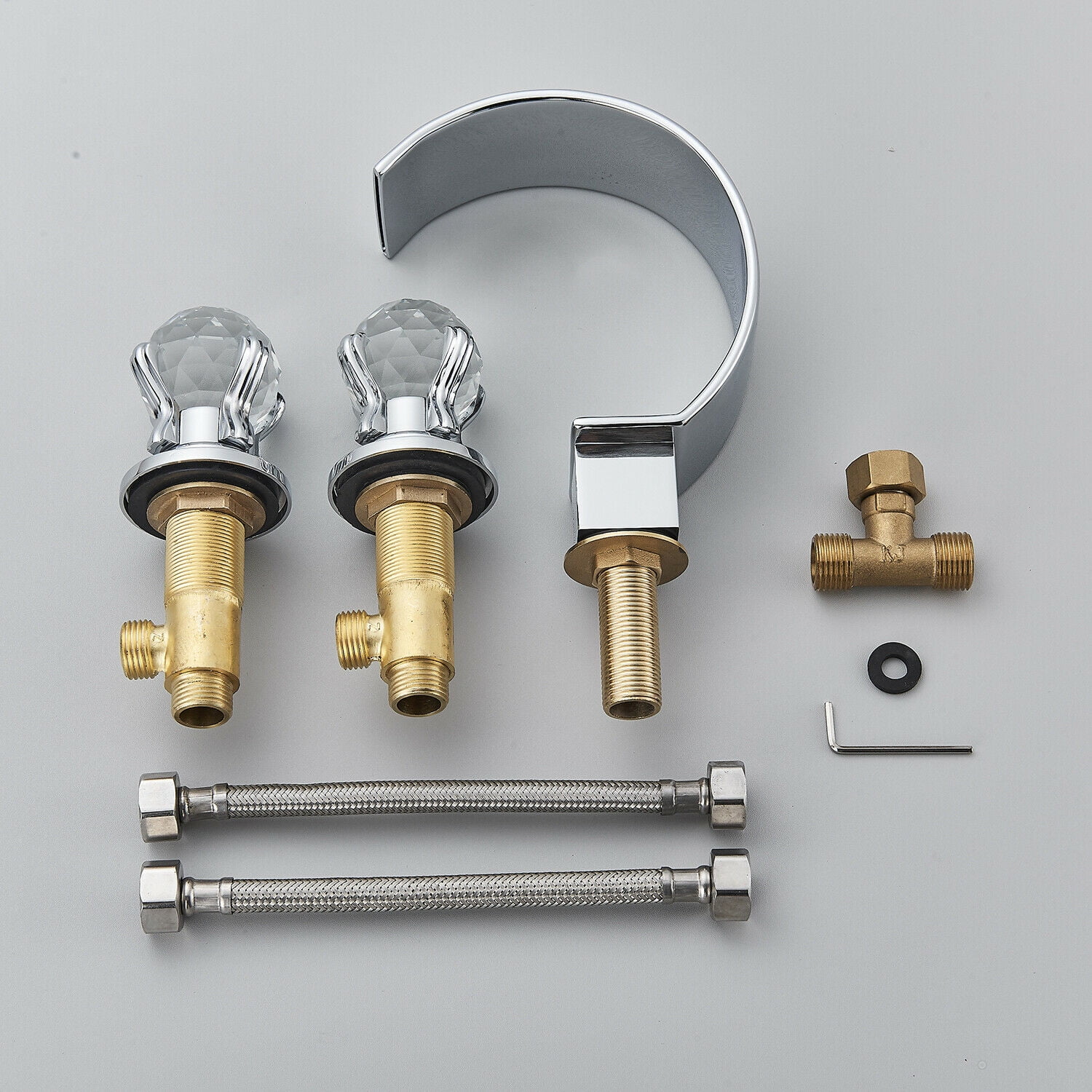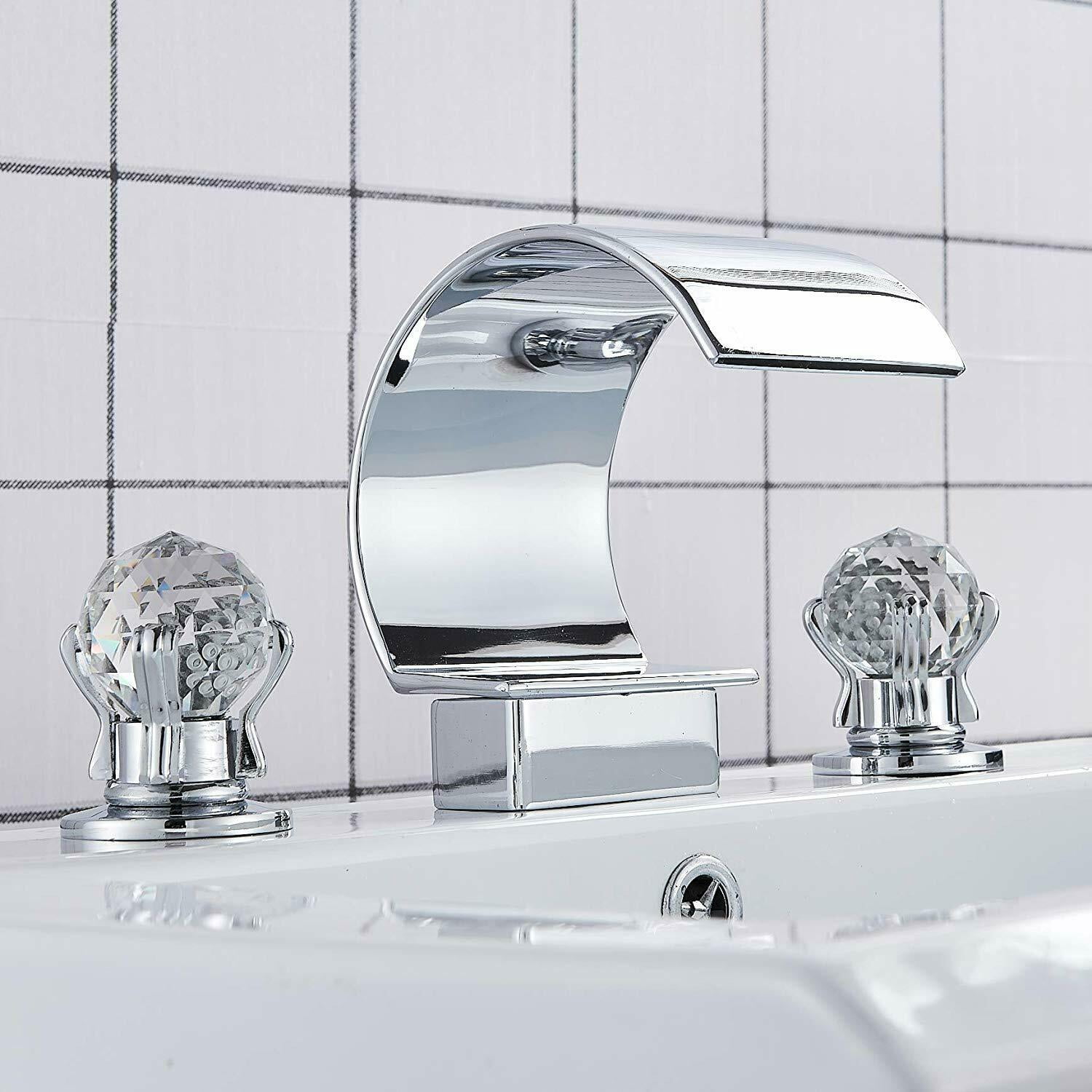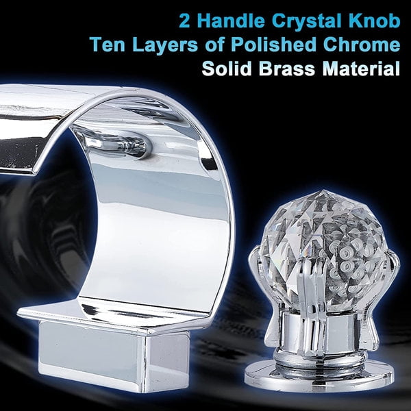 This Bathroom Sink Faucet 3 Hole 2 Handle Crystal Knobs High Arc Waterfall Spout Vanity Basin Mixer Tap 8-inch Upwards Widespread Bathtub Filler Faucet.The unique arc waterfall spout design provides a clear and steady laminar stream,compared with other basin faucet,which can leave a wider basin space for cleaning, user- friendly bathroom design.The waterfall bathroom basin faucet can also add a sense of sleek to your bathroom washbasin.Easy control hot and cold,two handle installation are good for effortless flow and water temperature control. The body of the waterfall bathroom faucet is made of solid brass .The drip free ceramic disc cartridge can withstand multiple opening and closing tests, and Long Lasting Operation.Featured in the sturdy foundation and eye-catching sophistication, this widespread sink faucet will add highlights to your bathroom decor.