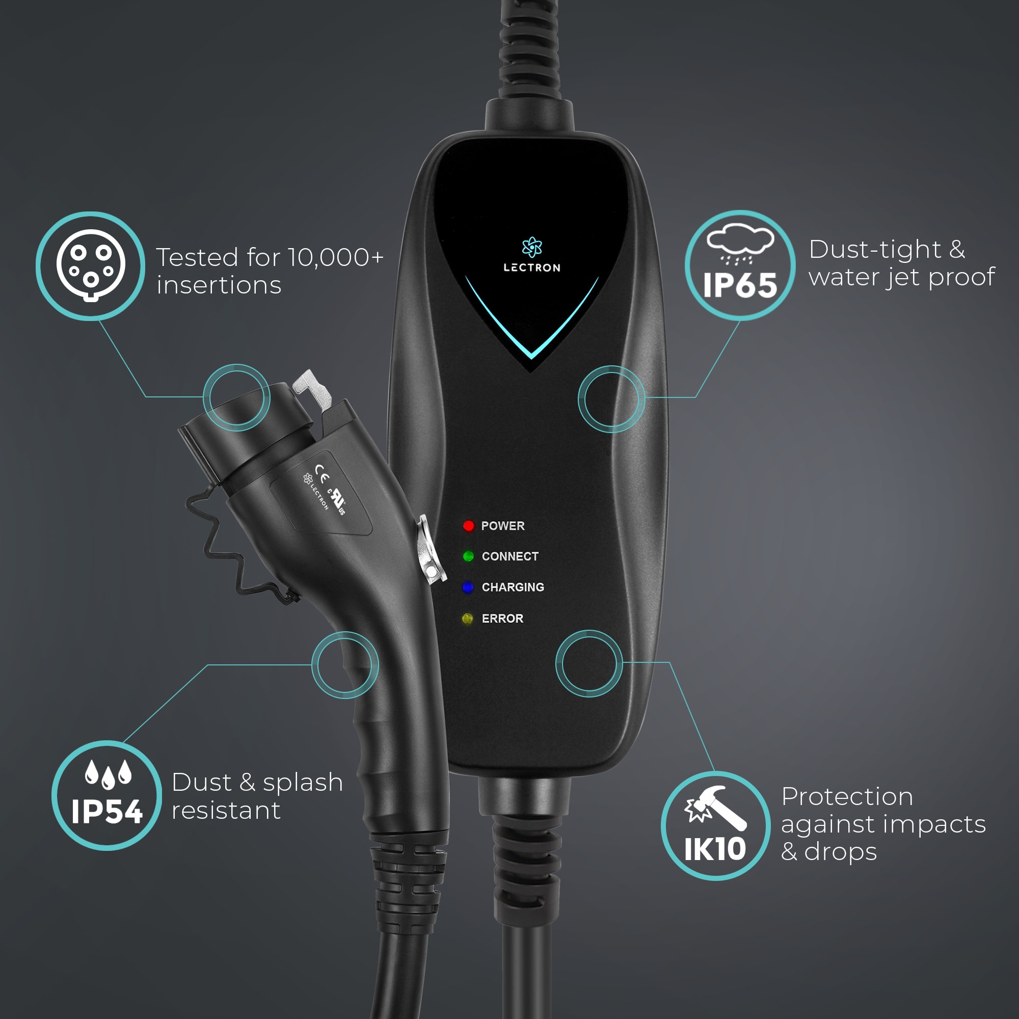The Lectron Level 1 J1772 Charger Wi-Fi version is designed with a NEMA 5-15 plug and 15 Amp output, efficiently adding 40-50 miles of range overnight using any standard 110V or 120V outlet. With its Wi-Fi connectivity, you can monitor and control charging remotely via the Lectron app, staying updated on charging status and making adjustments with one touch of a button.This charger is compatible with all electric vehicles that use the J1772 standard, including BMW, Ford, Honda, Hyundai, Kia, Porsche, Nissan, and Chevy. It also boasts an IP65 rating for dust and water resistance, ensuring safe operation at home, work, or on the road. With its portable design and 16 ft extension cord, you can conveniently top-up anywhere you go!