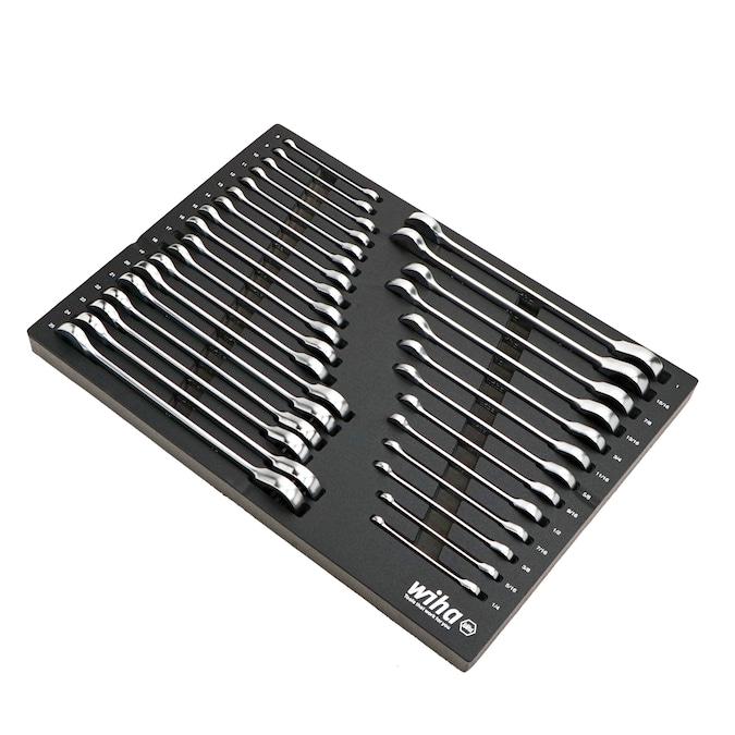 Wiha’s Combination Wrenches have a 12-point box-end design with contact points that apply force to the flat sides of the fastener head—rather than the corners—to prevent the fastener head from rounding off. The open-end is angled 15 degrees for flipping the wrench between rotations to maximize rotations and the box-end offset 15 degrees for finger clearance and working around obstructions that limit access to the fastener. The wrenches consist of premium-quality tool steel, have a Chrome-plated satin finish for corrosion protection, and the size profiles are boldly stamped on the handle for easy identification. The tools come conveniently stored in a soft modular foam tray for secure, space-saving storage. The foam tray is designed with high visibility tool callouts printed on each tray to easily return tool to its location. Wiha modular foam trays are made of durable laminated tri-layer foam and will fit in most toolboxes and pull out tool drawers. Wiha modular foam tray are the perfect solution for any storage or organization needs.