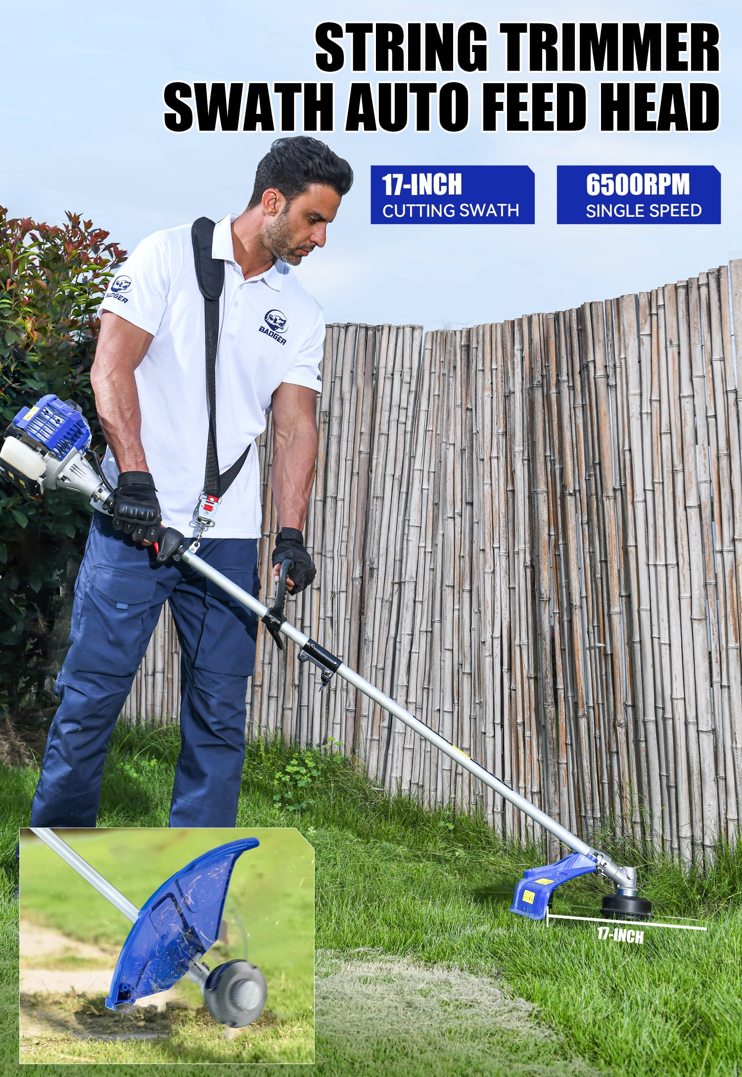 Features: 4 in 1 Multifunction:17″ String Trimmer/Edger, 9.4″ Pole Saw, 16″ Hedge Trimmer and 10″ Brush Cutter included. Strong Powerful Engine: 26 cc Full Crank 2-cycle engine Gas Powered. Easy to Assemble: It is very easy to assemble and remove the attachment within seconds. Easy to Start: Start within 5 times pulling starter. Comfortable Operation: Engine transmission is supported by an aluminum support which greatly reduces vibration. Attachments compatible: Easily connects to WILD BADGER POWER or other brand attachments and locks them in tight, only need change attachments that you can get another function tool, save money, save space. Reliable customer service 3-YEAR Warranty: If you encounter any quality problems over the life cycle of our product, please contact us in time. Badger warrants this product against defects in material and workmanship for a period of three (3) years for home use and commercial use commencing on the date of original purchase and will, at its option, repair or replace, free of charge, any part found to be defective in material or workmanship. What’s in the box: String Trimmer*1 Pole Saw Attachment*1 Hedge Trimmer Attachment*1 Brush Cutter*1 Shoulder Strap*1