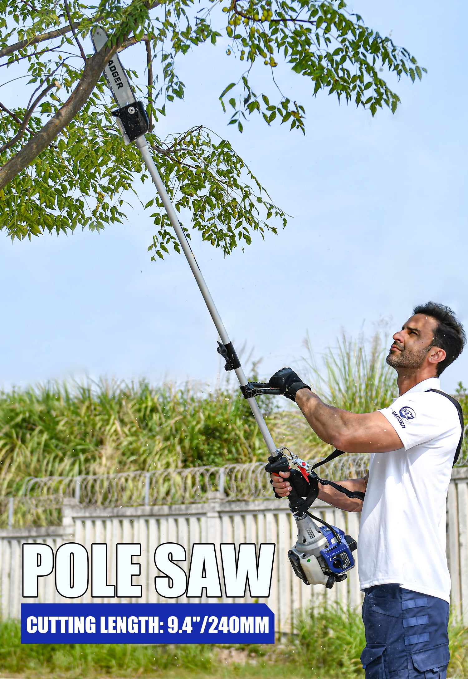 Powerful 26cc 2-cycle gas full crank quick start engine 4-in-1 combo-includes string trimmer attachment, brush cutter blade, hedge trimmer attachment and articulating pole saw attachment Full crank design reduces exhaust, increases fuel efficiency and provides longer life Transmission is supported by a vented aluminum housing which greatly reduces vibration and increases tool life Pole saw attachment articulates 90 degrees allowing you to make multiple cuts from different angles Hedge trimmer attachment is made of high grade steel and articulates to multiple positions allowing you to trim bushes from all angles 6 Year Home Owner and 3 Year Commercial Manufacturers Limited Warranty On All Badger Gas Products
