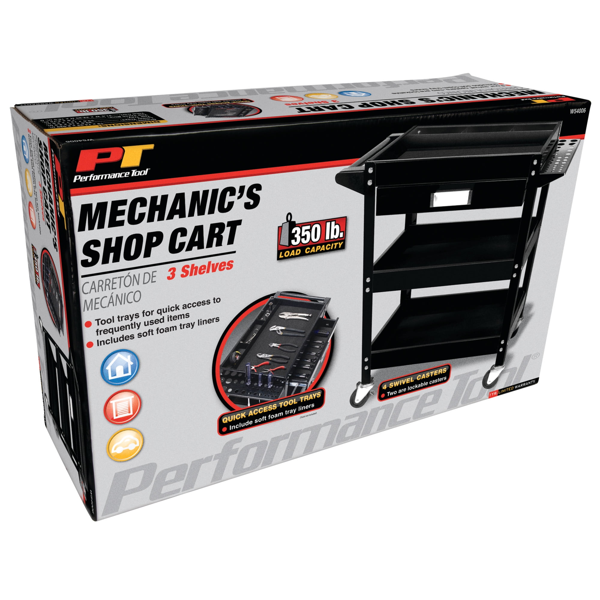Performance Tool W54006 23.5 In. x 16 In. 3-Shelf Utility Cart with Drawer, Tool Trays, and Swivel Casters, Black