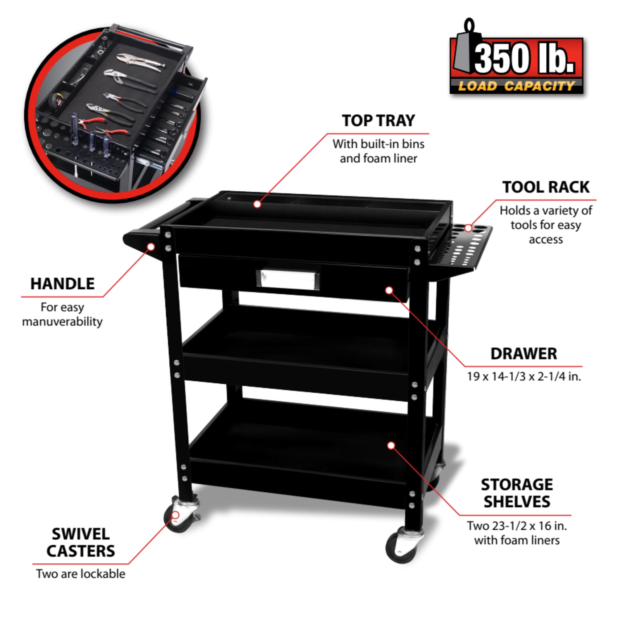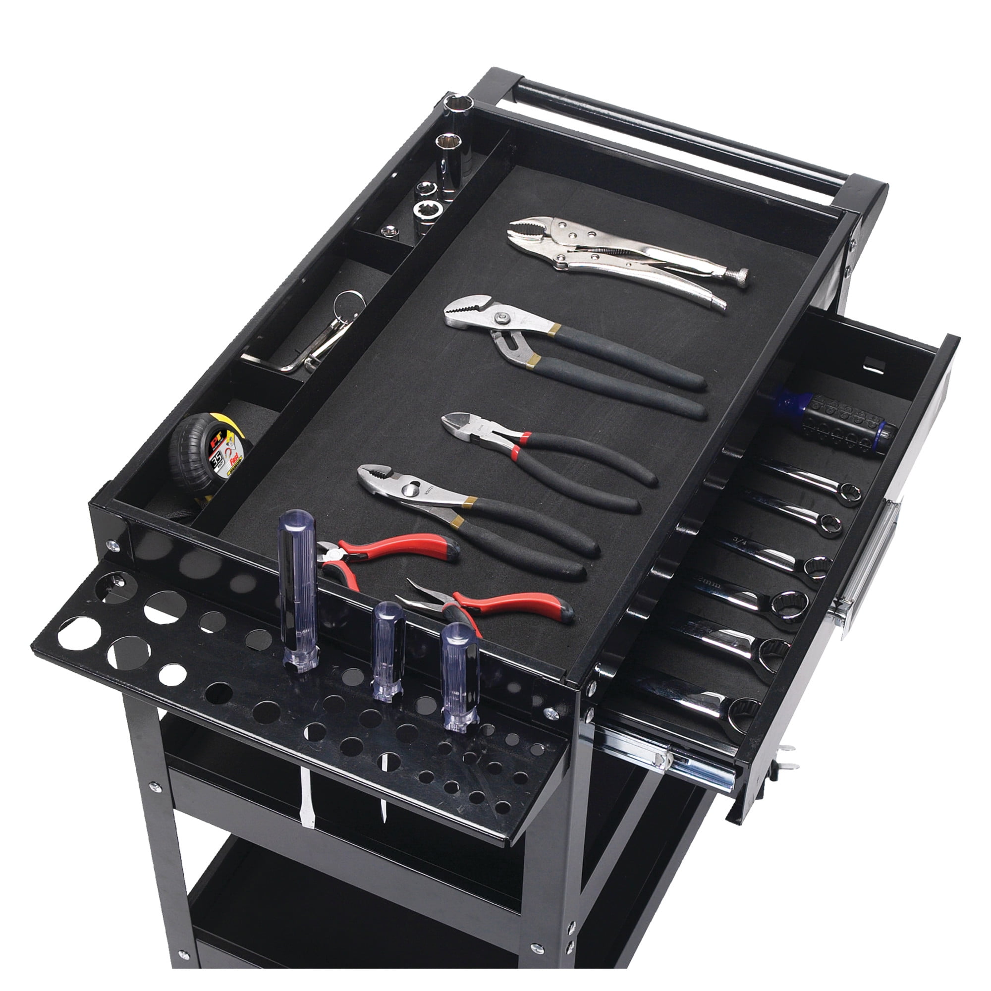 3 tier cart with side mount screwdriver/pry bar holder black painted finish, 30″ long, 18″ wide, 4 swivel castor style wheels, 350lb. Capacity sliding drawer and organizer. Includes foam drawer and tray liners and two locking casters.