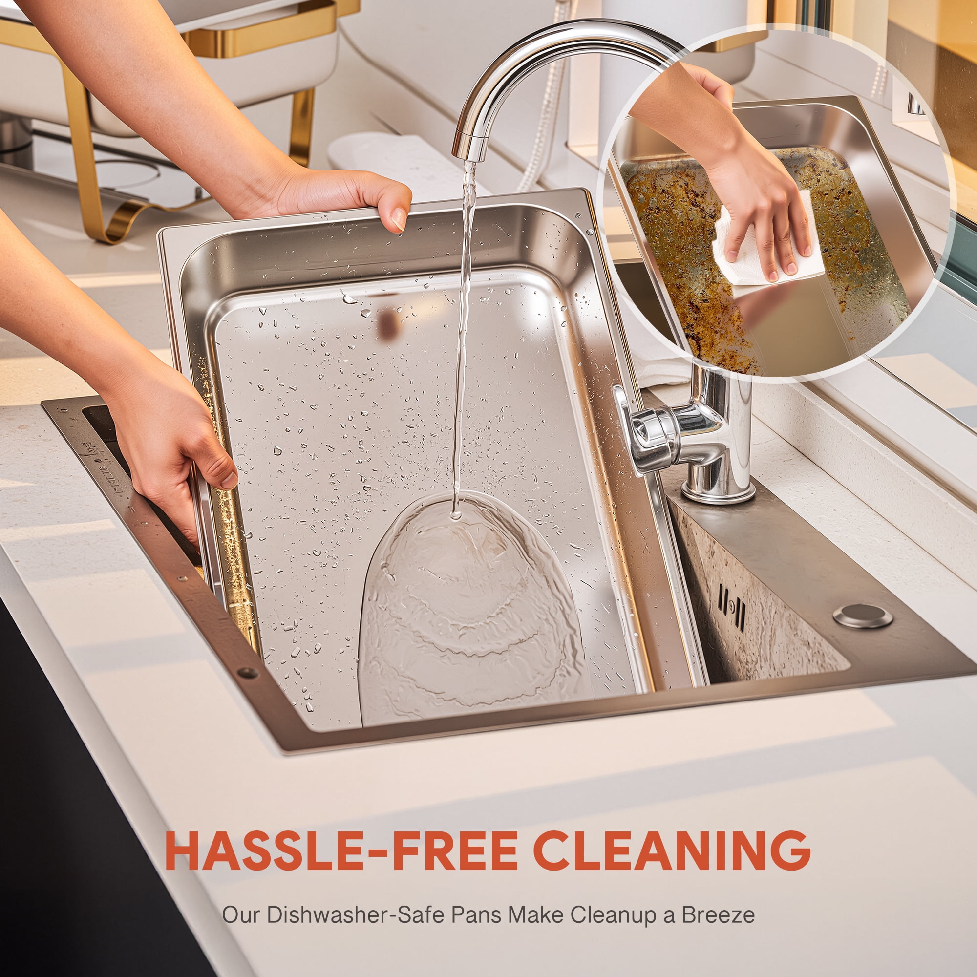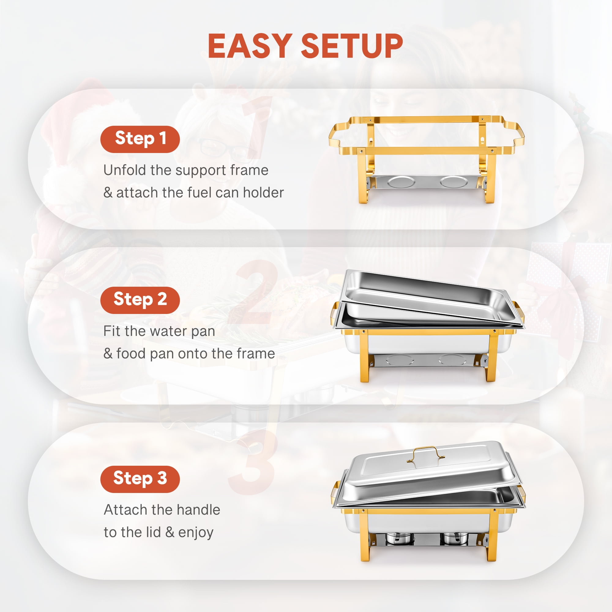 Food Grade Stainless Steel: Our chafing dishes for catering are made of food grade stainless steel to meet your demands for superior strength and food hygiene. Ideal Serving Temperatures: Effortlessly maintain the perfect serving temperature with these buffet servers and warmers. Compact & Foldable for Storage: Our food warmers for parties take up little space when not in use thanks to their foldable legs and stackable pans, allowing for easy storage, organization, and transport from shelf to table.