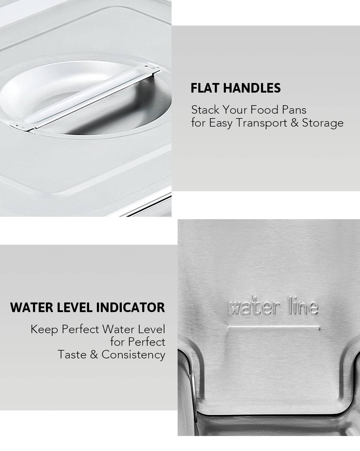 Package List 1 x Bain Marie Food Warmer 3 x GN 1/2 Pans 3 x GN 1/2 Lids 1 x Soup Ladle 1 x Skimmer 1 x Glass Shelf & Guard 4 x Support Feet 1 x He x Wrench 1 x Instructions Three 10 qt. pans provide up to 240 servings at once for any catering event 85 to 185°F adjustable heating range keeps your food deliciously hot The stainless steel body and tempered glass shelf offer superior endurance Dimensions: 33.1″L x 14.6″W x 15.75″H Weight: 50.9 lb