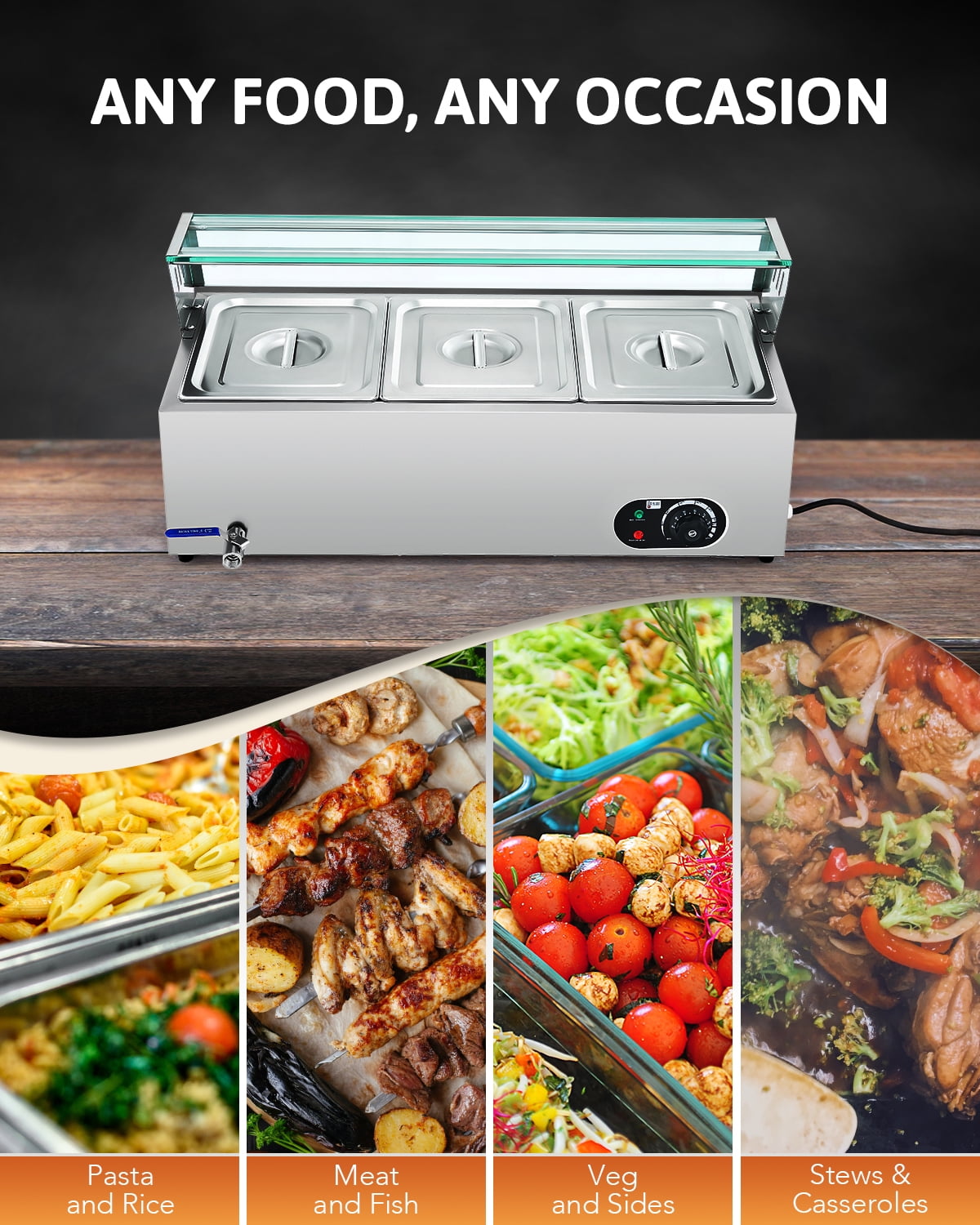 Need to provide piping hot plates of food, keep sauces and chip dip warm, melt cheese for toppings, and offer hearty soup to customers for hours at a time? Our 3 pan commercial food warmer is the perfect solution. Whether you need an electric food warmer for parties, pan warmers for catering events, chafing dishes for buffets at a hotel, hospital, or school, this versatile bit of restaurant equipment has got you covered! Standard 6″ deep GN 1/2 pans come included to provide up to 80 servings of three dishes at once, but these serving dishes can be easily mixed and matched with other gastronorm or American trays and pots to meet your exact needs! The lids and tempered glass shield seal in flavor and keep your food hot and safe in transit from the kitchen. Once they’re in place, the control knob allows precise temperature control from 85-185°F (30-85°C). Everything will stay at the perfect temperature until the close of day thanks to the powerful 1200W heating element, whose wide U-shaped design ensures the hot trays are heated evenly, without no steaming or frozen spots that would leave your customers boiling mad. The shelf over the pans is ideal for holding utensils, small bottles, or promotional materials. Made of high-quality 201 stainless steel, this catering food warmer is made for longevity and heavy-duty use while remaining light enough to stay portable between events. Easy to use and maintain, wide ports allow quick filling and draining. Your safety is paramount, so our commercial and party warming trays detect if the bain marie basin runs low on water, cutting power to prevent accidents. A ladle and skimmer come included as well. With its practical design, precise temperature control, and high-quality construction, this electric buffet warmer is a reliable and dependable choice for any commercial kitchen, catered buffet, school cafeteria, or food truck. Keep food warm and ready to serve with this essential tool. Features: 3 PAN BAIN MARIE: Our new electric buffet warmer is the perfect solution for keeping your dishes, soups, and sauces piping hot for hours at a time; pasta or curry, cheese or chocolate, dips or gravy, this flameless food warmer will keep food warm and delicious for every guest until closing time WIDE APPLICATION: 3 half GN pans come included, each able to hold eighty 4 oz. servings; the serving space can also be repurposed for any standard 4″ or 6″ deep dishes within a 31-1/8″ by 12-3/4″ area, making this food and soup warmer ideal for restaurant kitchens, wedding catering, school cafeterias, hotel buffets, and more! EASY TO USE: Our countertop bain marie food warmer fills and drains easily through separate ports, with easy knob control of the warm water bath for temperatures 85 to 185°F to gently hold your culinary creations at just the right heat DEPENDABLE: 1200W of power and a wide U-shaped heating element enable our professional steam table to take the rigors of commercial kitchen use day after day after day; heavy duty 201 stainless steel and tempered glass will allow your new warming plate to uphold your high standards year after year HELPFUL ACCESSORIES: Besides its three 6″ half pans, the Wilprep electric food warmer also comes with a set of accessories including a ladle and skimmer, so you’ll have everything you need to get started serving right away Specifications: Material: 0.8mm 201 Stainless Steel, 9mm Tempered Glass Color: Silver Input Power: 110V / 60Hz Rated Power: 1200W Temp. Range: 85-185°F (30-85°C) Dimensions: 33.1 x 14.6 x 15.75 in. (84 x 37 x 40 cm) Total Pan Area: 31-1/8 x 12-3/4 in. (79.5 x 32.5 cm) Pan Depth: 5.9 in. (15 cm) Volume per Pan: 10 qt. (9.5 L) Net Weight: 33.5 lb. (15.2 kg)