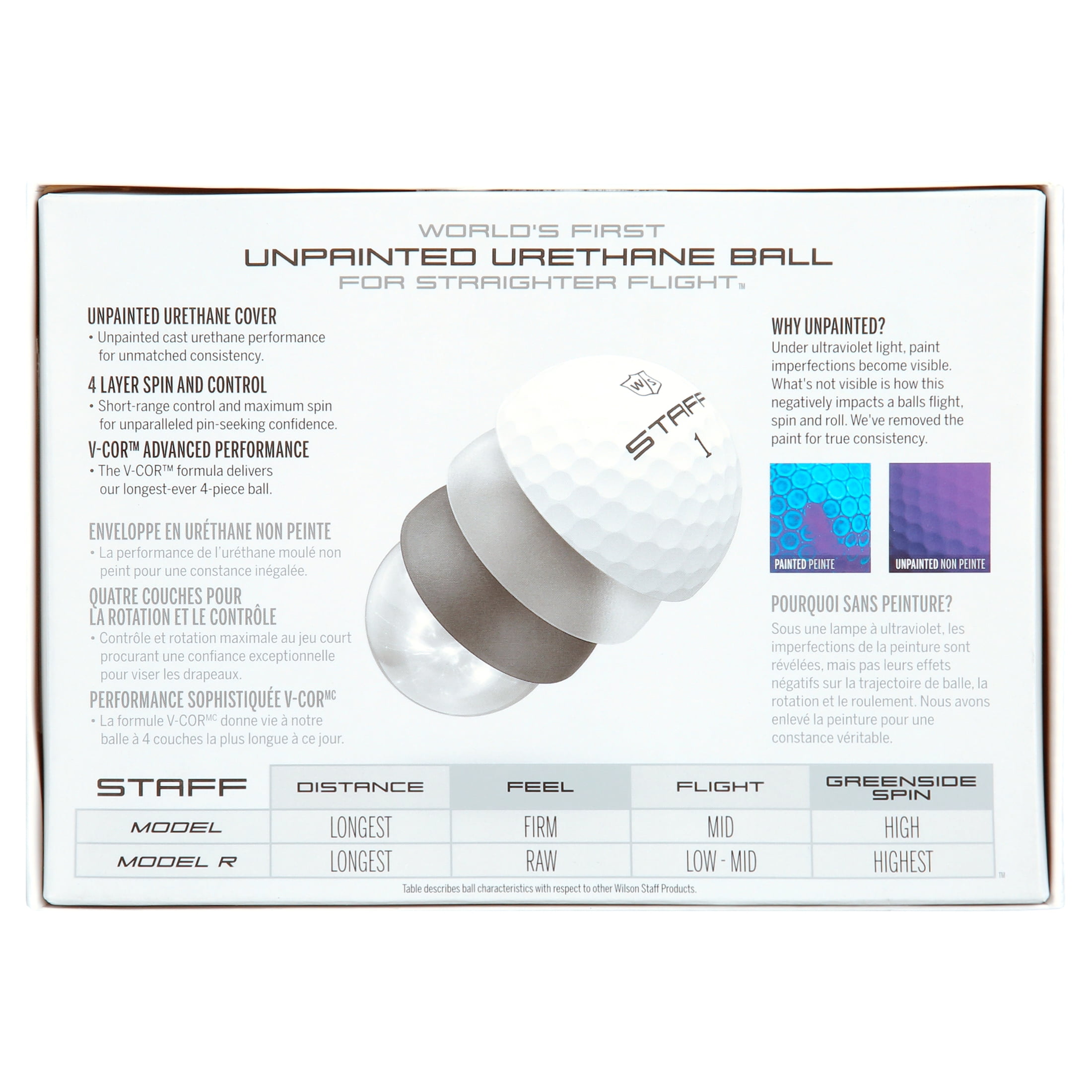 Wilson Staff Model R Golf Balls, 1 Dozen – Unpainted Urethane, Matte White V-COR™ Advanced Performance enhances energy for maximum velocity off the club face for greater distance 4-Layer Spin & Control provides higher spin and better control for unmatched distance and shot-shaping Tour-level workability on fairways with predictable stability on approach shots Exceptional control around the green for improved performance Unpainted urethane cover creates a perfectly even surface for true balance and straighter flight