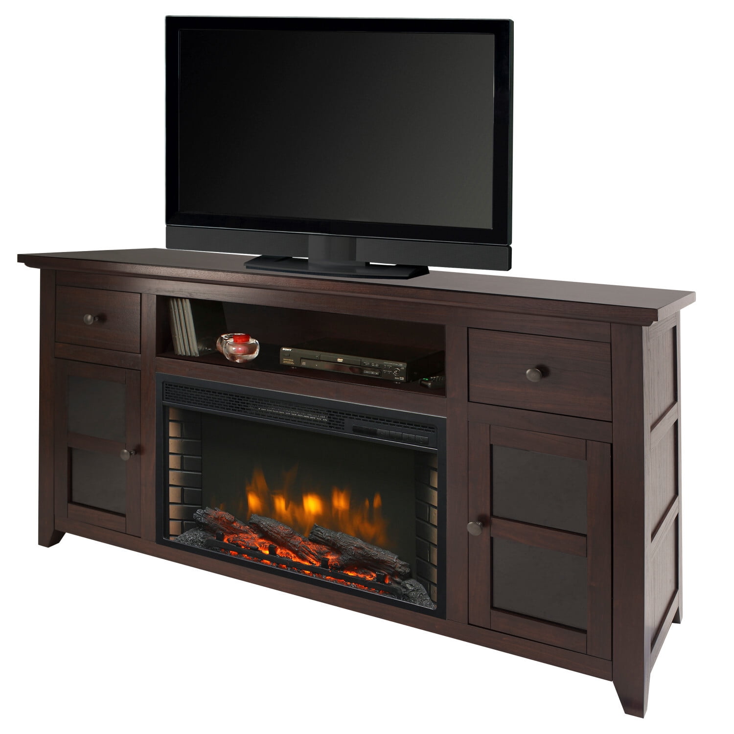The Winchester media fireplace combines functionality with contemporary furniture styling. With a distinctive design, it accommodates TV’s up to 60-in as well as DVD players and other media components. The functional drawers and side cabinets provide ample storage and easy access. This electric fireplace heats up to 400 square feet with 4777 BTUs of fan forced air heat and comes equipped with a 8 stage timer and 13 thermostatic temperature adjustments. The LCD control panel displays your settings, and then locks them into memory. Control the climate from anywhere in your room with a full function remote control that is included. Two cabinets with glass fronts and interior shelf, enter media component shelf with cable management.