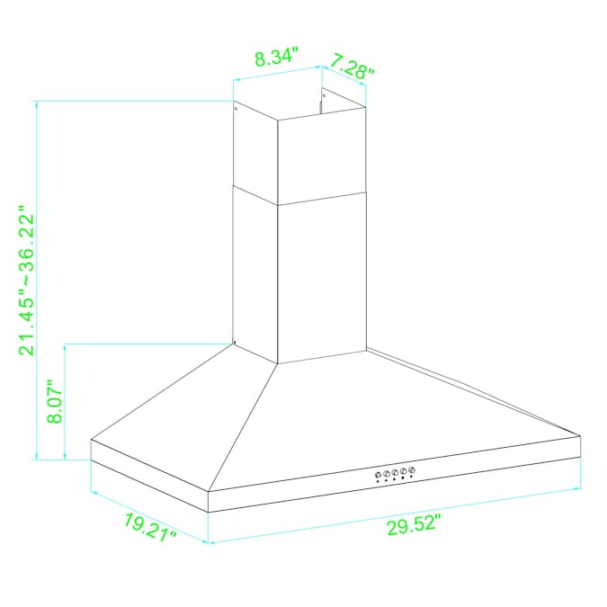 This 30 In. wall mounted range hood is constructed of premium 430 stainless steel. Complete with aluminum mesh filters that remove smoke and grease from your cooking area and are dishwasher safe. This model also comes with 2 bright energy saver LED lights, low noise level operation, 200 CFM air flow, push button, 3-level fan speed. All the components such as damper, mounting hardware, flexible duct work and damper are included for easy installation. Adjustable and telescoping chimney can fit 7.5-8.5 Ft. ceiling. This unit is convertible, can be vented out of your dwelling or recirculating (ductless) with charcoal filters (sold separately, part # WRHF003S2).