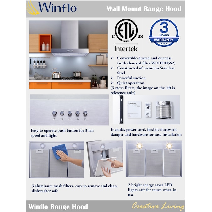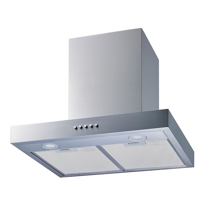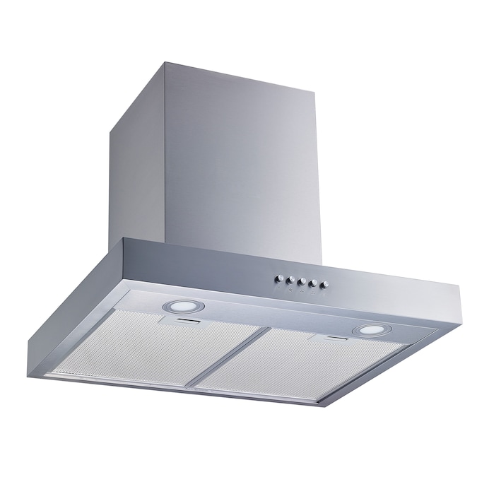 This 30 In. wall mounted range hood is constructed of premium 430 stainless steel. Complete with aluminum mesh filters that remove smoke and grease from your cooking area and are dishwasher safe. This model also comes with 2 bright energy saver LED lights, low noise level operation, 300 CFM air flow, push button, 3-level fan speed. All the components such as damper, mounting hardware, flexible duct work and damper are included for easy installation. Adjustable chimney can fit 7.5-8.5 Ft. ceiling. This unit is convertible, can be vented out of your dwelling or recirculating (ductless) with 2 pcs. Charcoal filters (included, part # WRHF005S2) to help reduce odors.