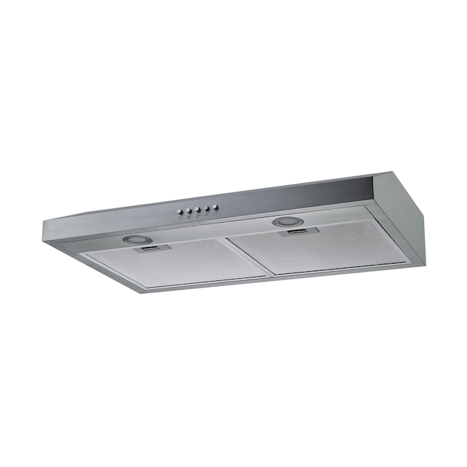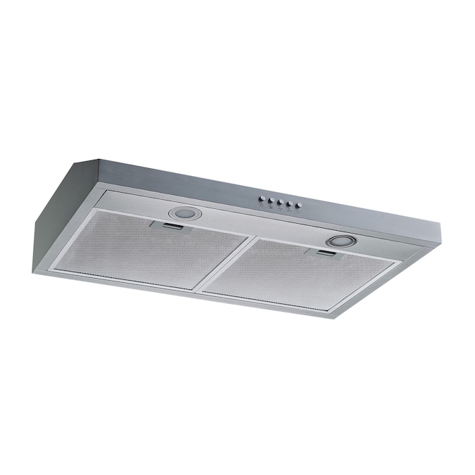 This 30 In. under cabinet range hood features a contemporary European slim design constructed of premium 430 stainless steel. The range hood features a patented design ventilation system to provide powerful suction with 330 CFM air flow and effortlessly remove smoke, odors and grease. Winflo patented QUICKINSTALL hardware is included to make installation by one person a breeze. 2 bright energy saver LED lights illuminate your cooking area and a push button panel controls 3 fan speeds and light. Easy to remove dishwasher-safe aluminum mesh grease filters keep maintenance to a minimum. This range hood provides the maximum performance at minimum cost. The unit is convertible with a simple switch and can be vented out of your dwelling through back or top, or converted to recirculating (ductless) with charcoal filters (part # WRHF004S2, included) to help reduce odors.