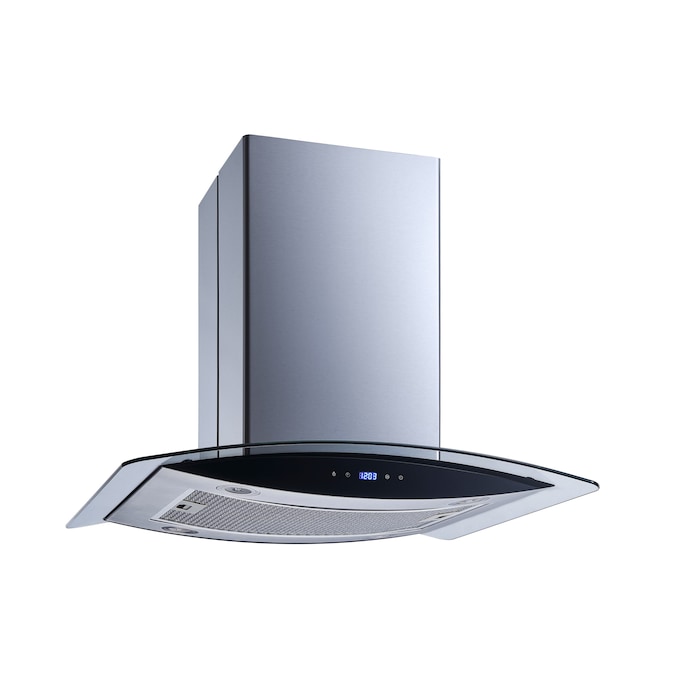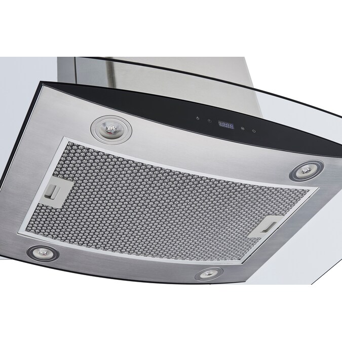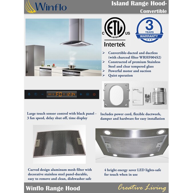 This beautiful island mounted range hood will create splendor and elegance in your kitchen. Constructed of high quality stainless steel and clear tempered glass. Complete with curved design aluminum mesh filter that removes smoke and grease from your cooking area and are dishwasher safe. Powerful suction with 500 CFM air flow rate is perfect for household use and an ideal balance between power, energy efficiency and noise control. This model also comes with 4 bright energy saver LED lights, low noise level operation, large touch sensor control with black front panel for 3-level fan speed, time display and delay shut off. This range hood comes with all the parts you need for easy installation. Adjustable and telescoping chimney can fit 8 to 9 Ft. ceiling. This unit is convertible, can be vented out of your dwelling or recirculating (ductless) with 2 pcs charcoal filters (included, part # WRHF004S2) to help reduce odors.