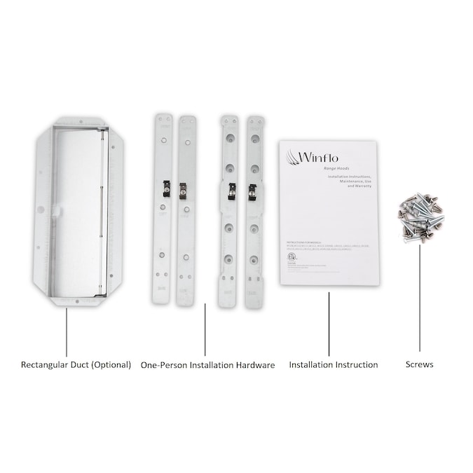 • Package Contents: Installation hardware, QuickInstall mounting brackets, grease filters, LED light bulbs, plug and damper