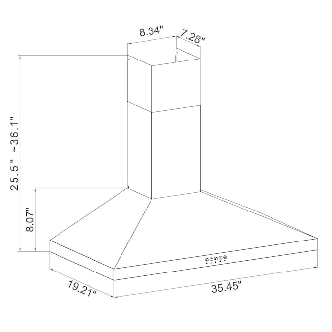 This 36 In. wall mounted range hood is constructed of premium 430 stainless steel. Complete with aluminum mesh filters that remove smoke and grease from your cooking area and are dishwasher safe. This model also comes with 2 bright energy saver LED lights, low noise level operation, 300 CFM air flow, push button, 3-level fan speed. All the components such as damper, mounting hardware, flexible duct work and damper are included for easy installation. Adjustable and telescoping chimney can fit 7.5-8.5 Ft. ceiling. This unit is convertible, can be vented out of your dwelling or recirculating (ductless) with 2 pcs charcoal filters (included, part # WRHF005S2) to help reduce odors.