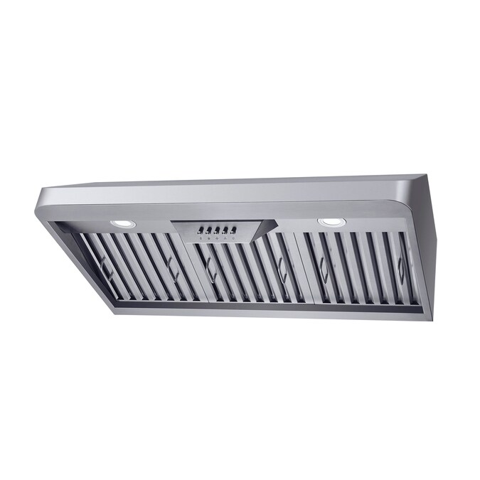Enjoy style, value, and convenience with this 36 In. ducted under cabinet range hood from Winflo. The eye-catching high profile design is constructed of premium stainless steel to deliver elegance and easy cleaning. Complete with easy removable stainless steel baffle filters with handles and grease collector that remove odors and grease from your cooking area and are dishwasher safe. Low noise level operation provides quiet while 300 CFM is sufficient for household use and an ideal balance between power, energy efficiency and noise control. This model also comes with 2 ultra bright energy saver LED lights and 3-level fan speed push button.