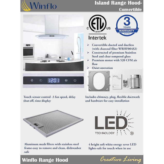 This beautiful island mounted range hood will create splendor and elegance in your kitchen. Constructed of high quality stainless steel and clear tempered glass. Complete with aluminum mesh filters that remove smoke and grease from your cooking area and are dishwasher safe. Powerful suction with 500 CFM air flow rate is perfect for household use and an ideal balance between power, energy efficiency and noise control. This model also comes with 4 bright energy saver LED lights, low noise level operation, large blue LCD touch sensor control panel for 3-level fan speed, time display and delay shut off. This range hood comes with all the parts you need for easy installation. Adjustable and telescoping chimney can fit 8 to 9 Ft. ceiling. This unit is convertible, can be vented out of your dwelling or recirculating (ductless) with 2 pcs. Charcoal filters (part # WRHF004S2, included) to help reduce odors.
