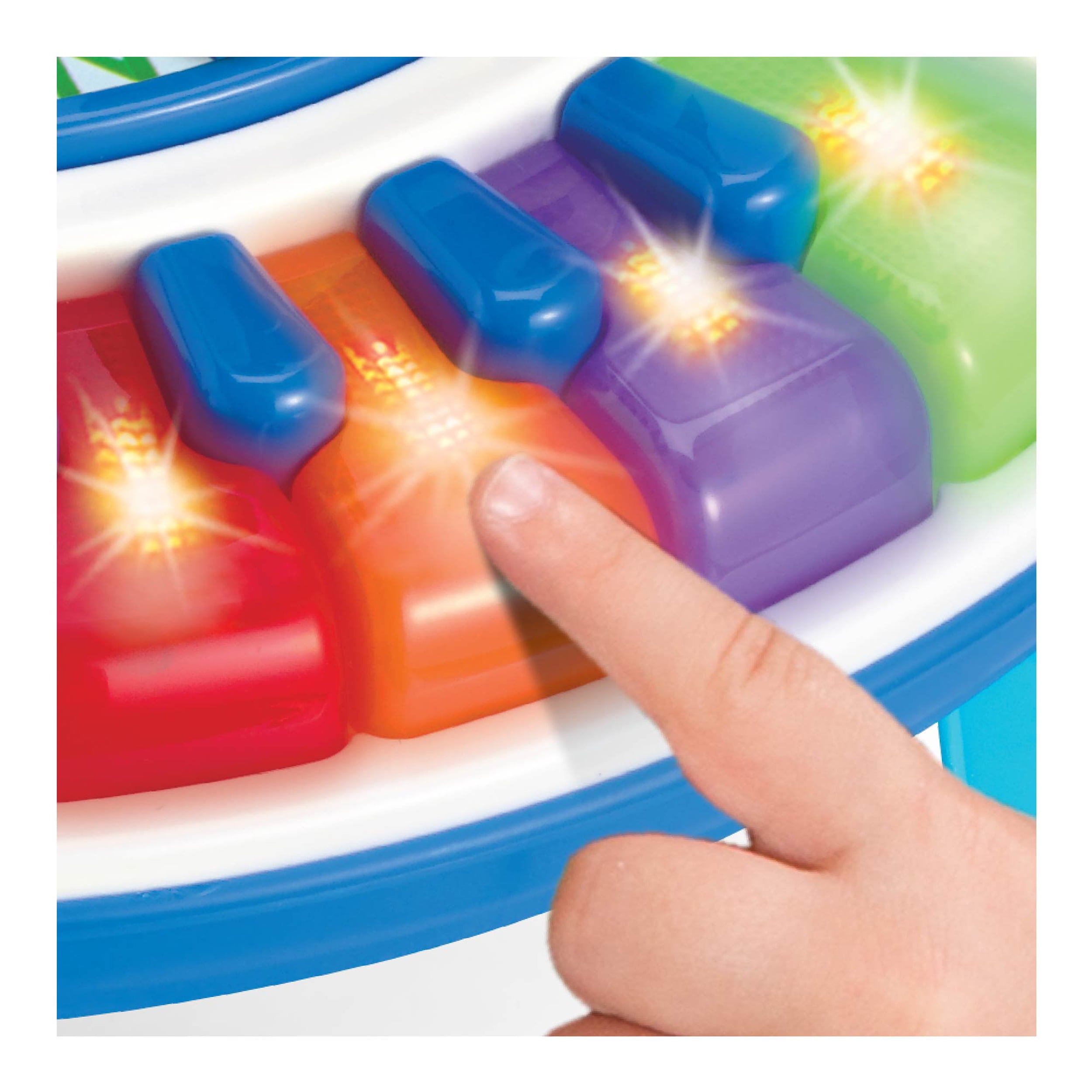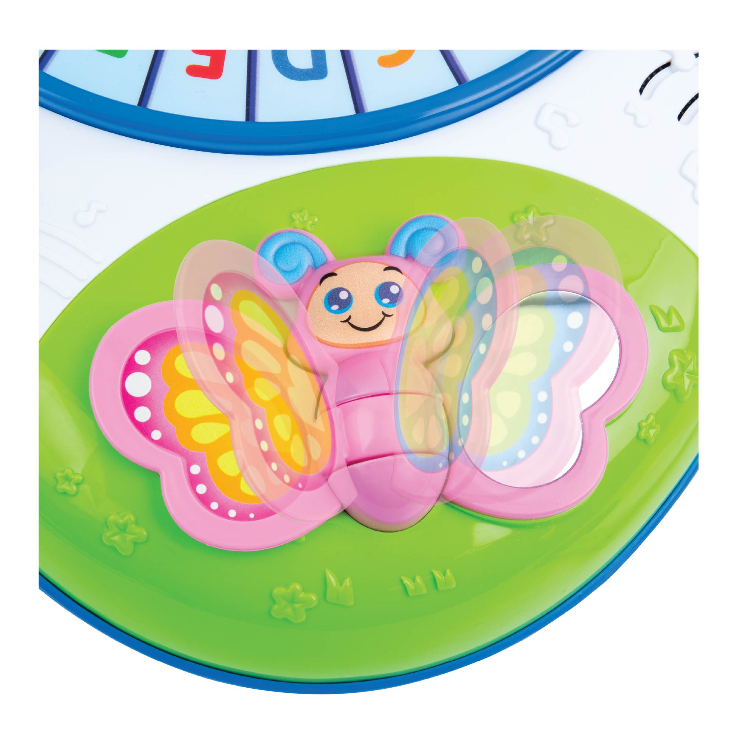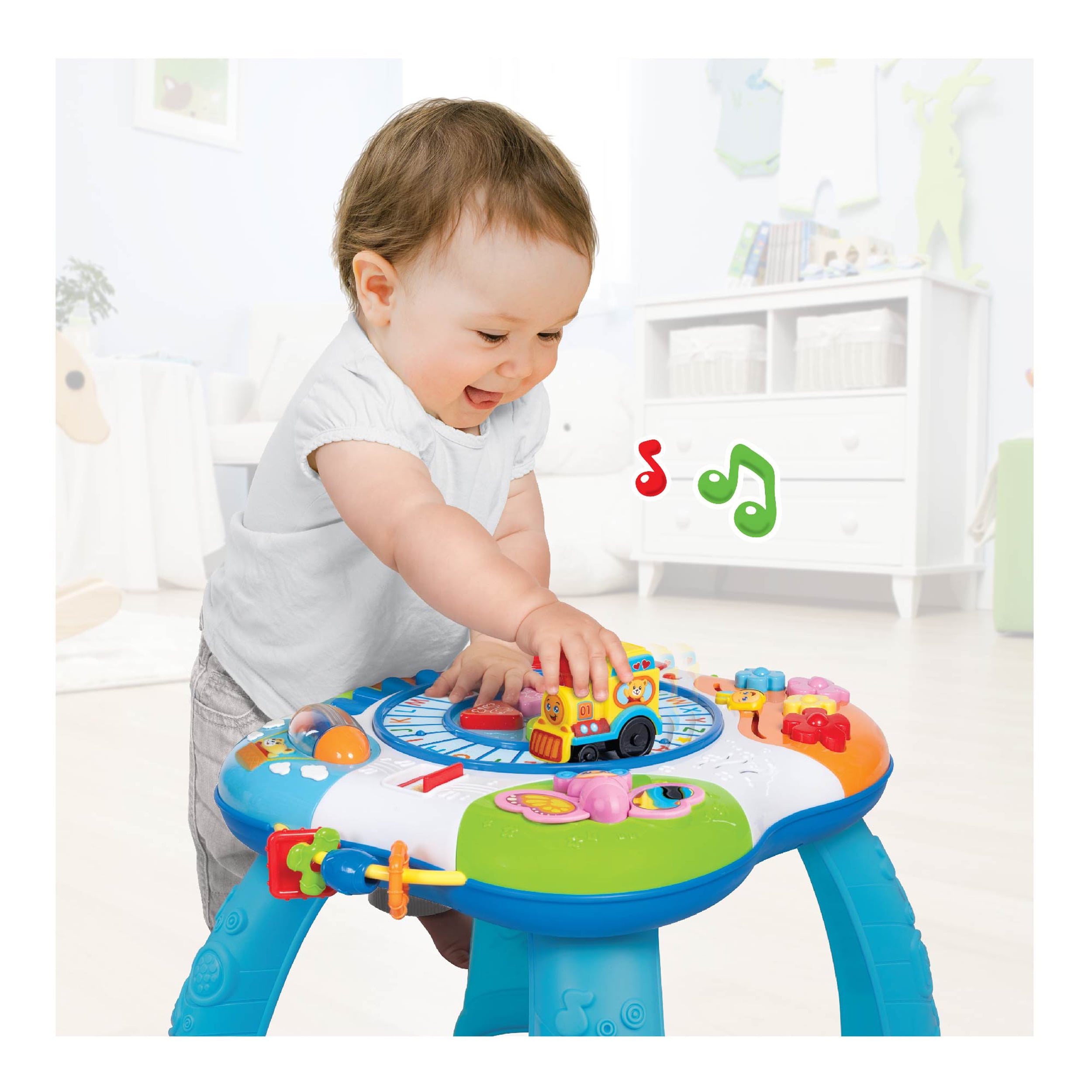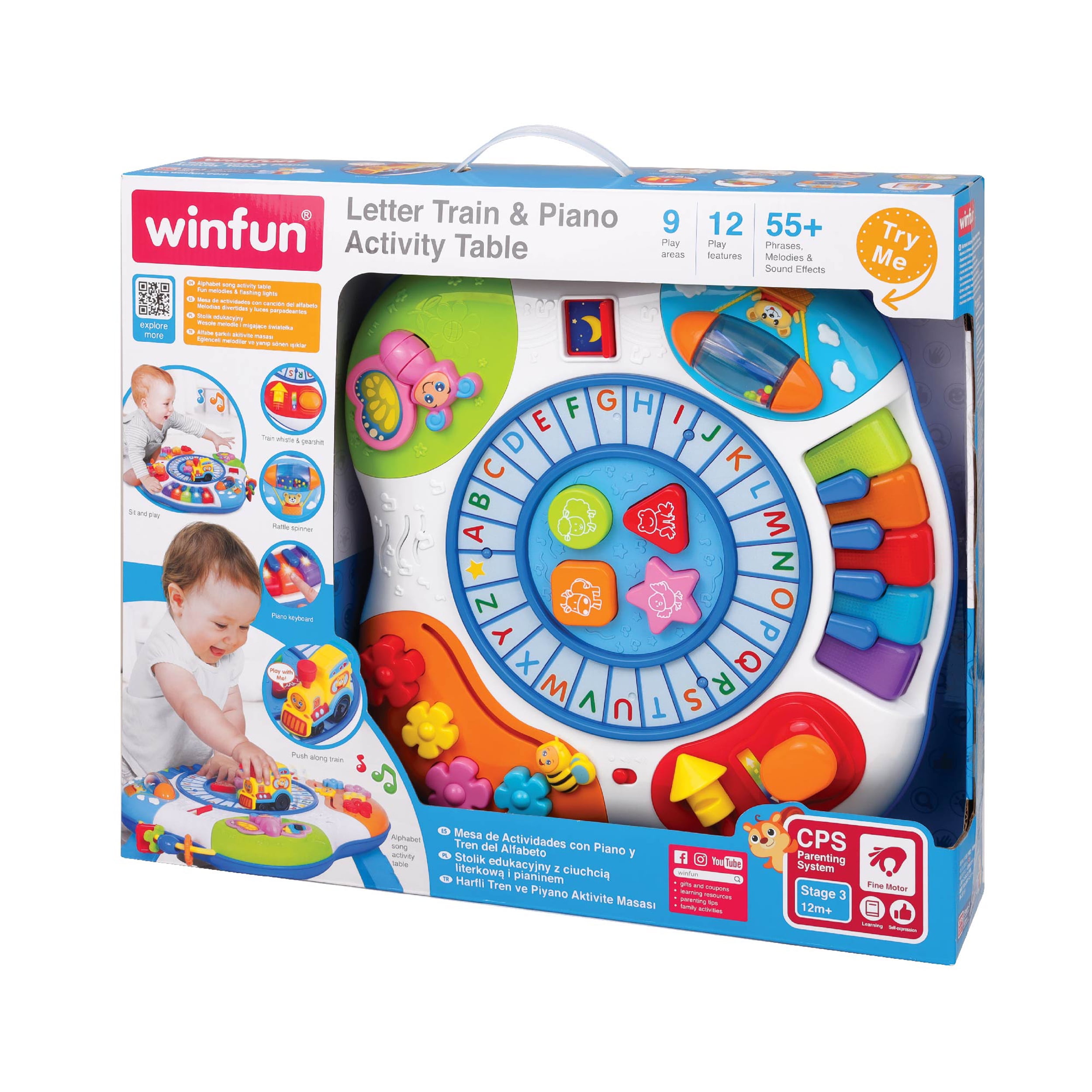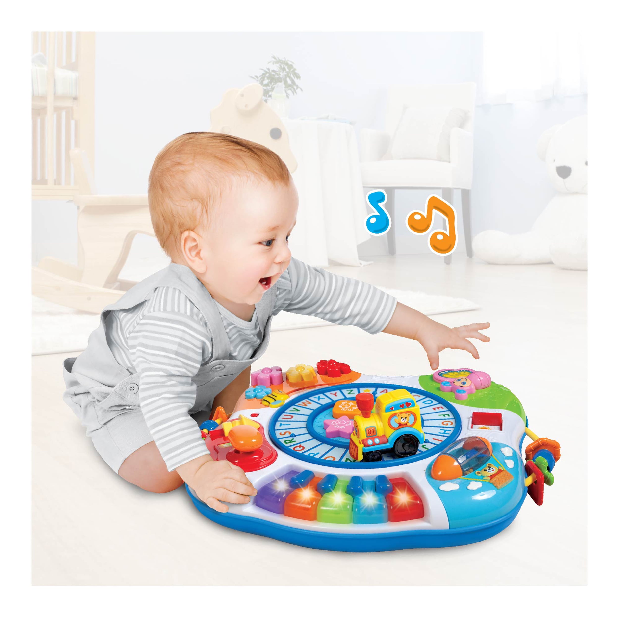 Winfun 0801 Letter Train and Piano Activity Table: 5-note piano keyboard with flashing lights Animal/shape/color identification Push train on the alphabet track to activate the alphabet song Train whistle, gear shift, spinner, sliding bee and flapping butterfly offer fun sound effects Detachable legs let your child use it with the stand or on the floor Educational toy requires assembly Musical toy requires 3 AA batteries (included)