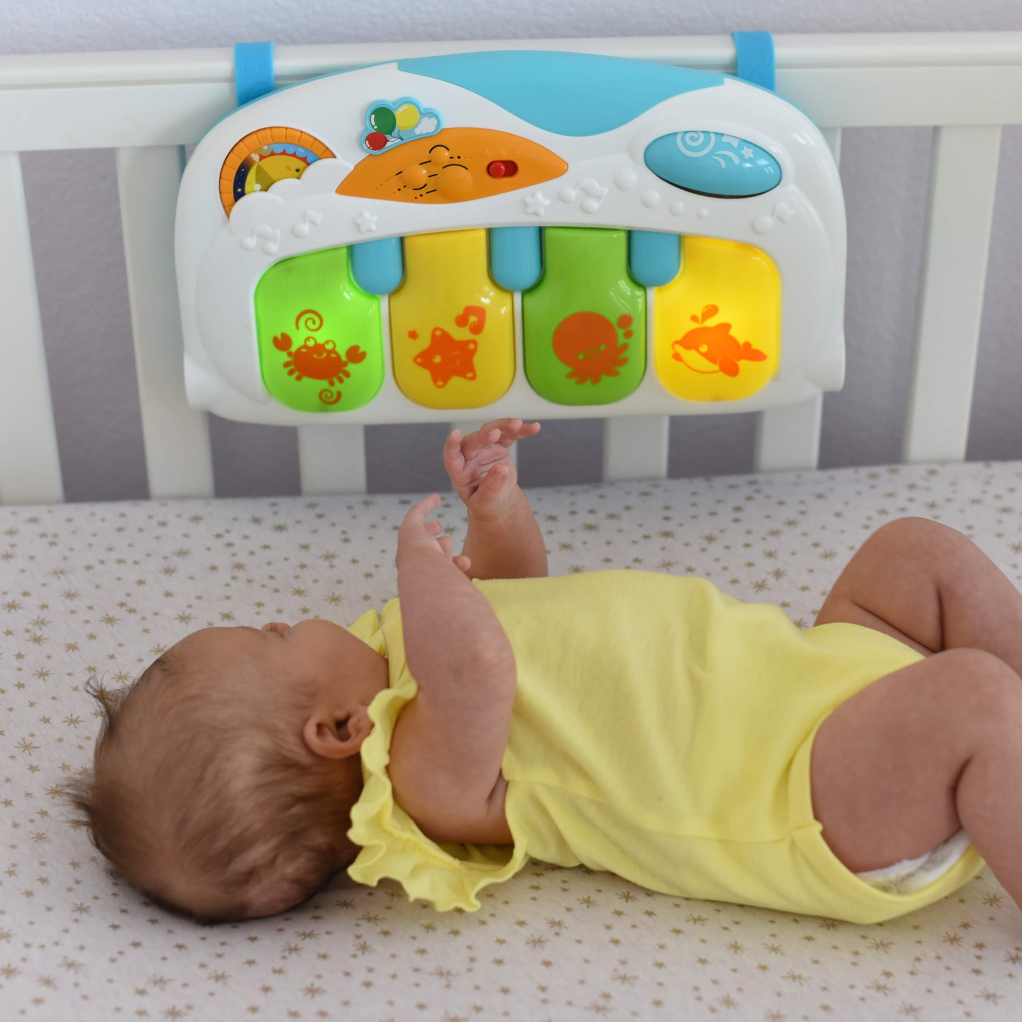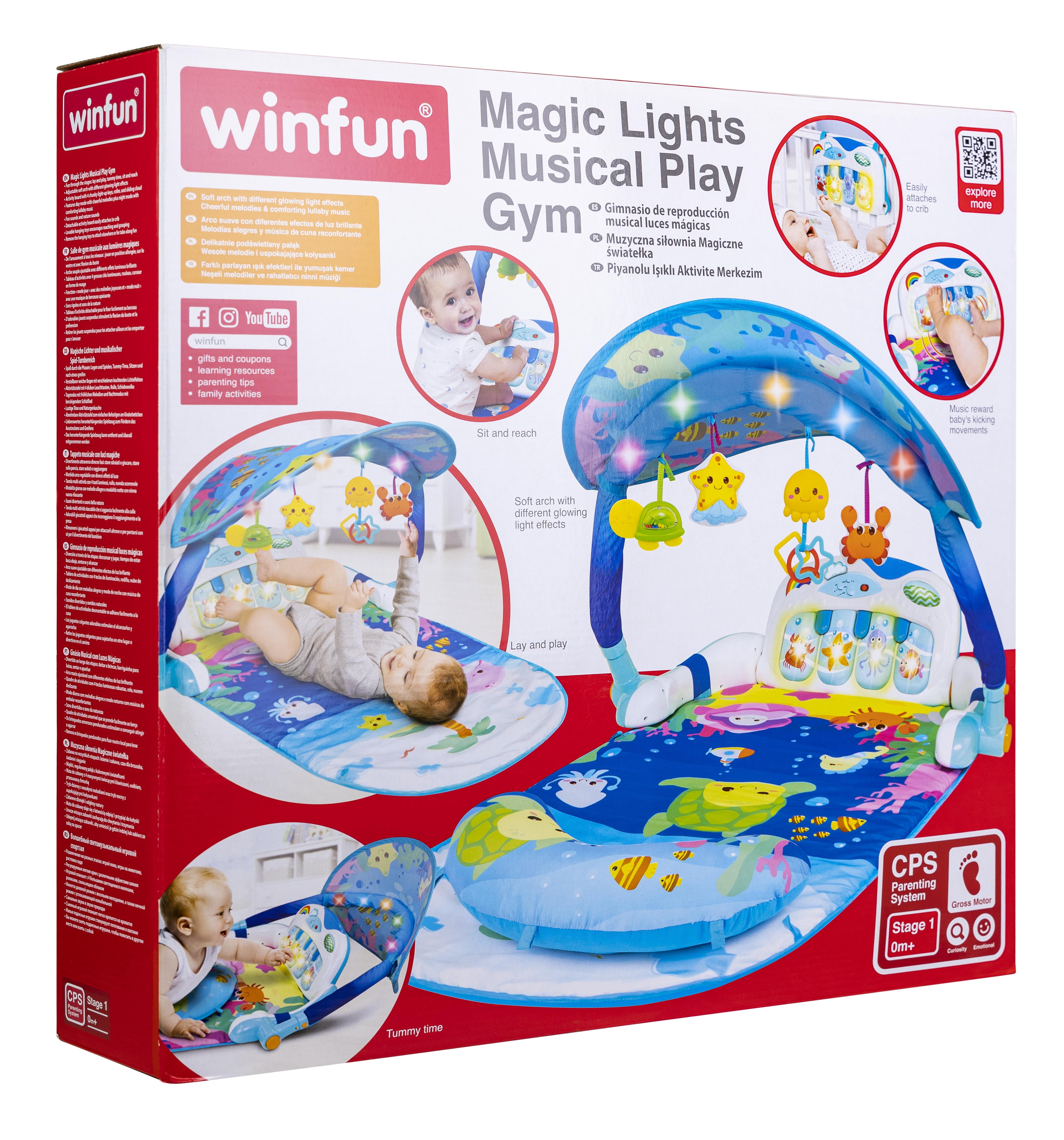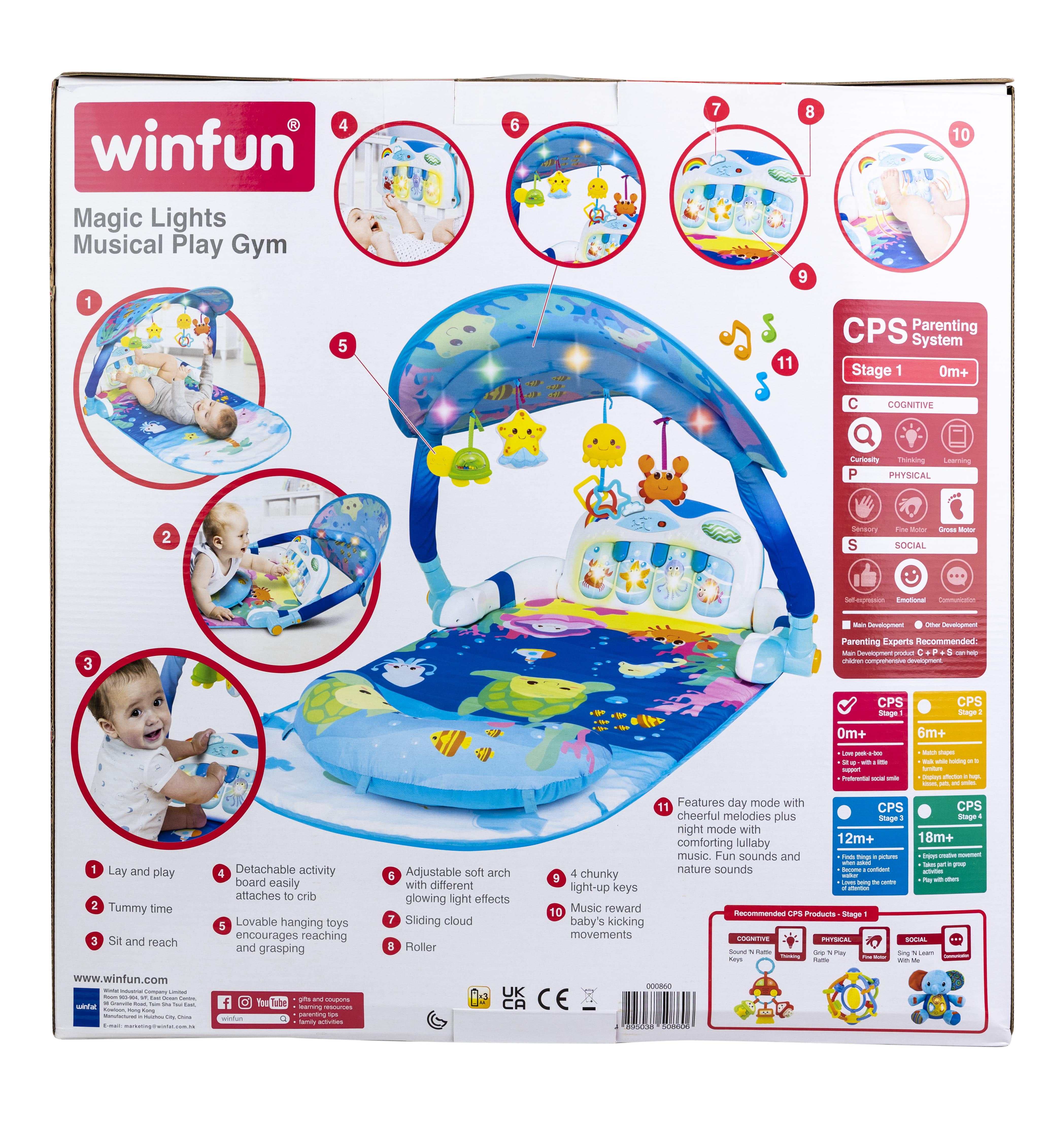 The Winfun Multi Color Magic Lights and Musical Play Gym is fun through the first-year stages: Laying and playing, Tummy Time and sit and reach! An adjustable soft arch will light up with different glowing light effects when music is playing. Detachable Hanging Toys can hang from the arch to encourage Reaching and Grasping or the toys can be removed for on the go fun! The Activity Board Features Early Number Learning, Music Notes and Melodies. The Activity board can be removed from Play Gym and Attached to the crib for more fun. CPS Parenting System/Stage 1: Gross Motor Skills, Curiosity, Emotional