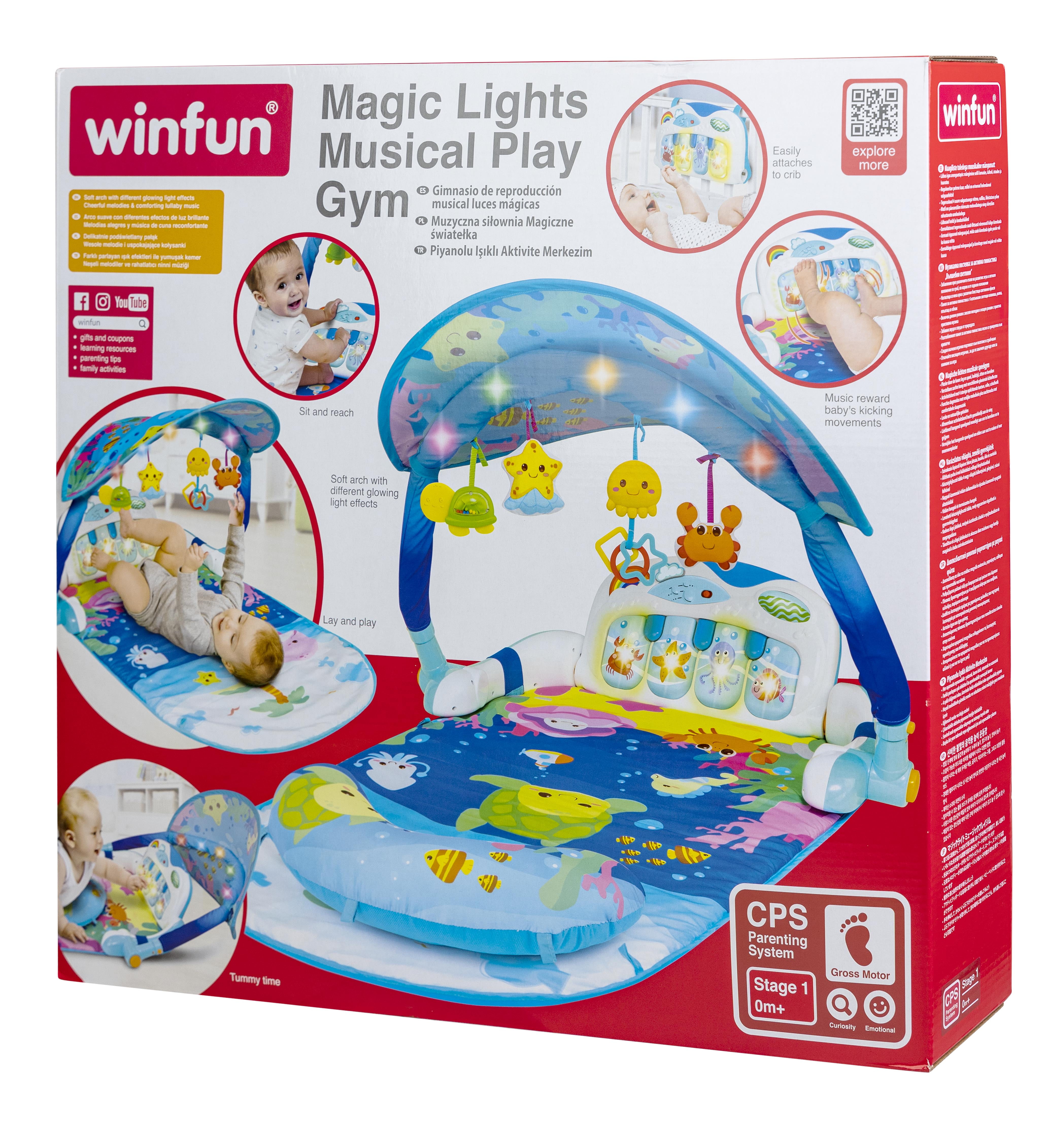 Winfun 0860 Magic Lights and Musical Play Gym Detachable Activity Board Easily Attaches to Crib Detachable Hanging Toys Encourages Reaching and Grasping Remove the Hanging toys to Attach Everywhere or for Take Along Fun Features day mode with cheerful melodies plus night mode with comforting Lullaby music 3 AA Batteries are Included Multicolor in shades of Blue with Yellows Oranges, Green, Pink and Red Accents Age Group Newborn and up
