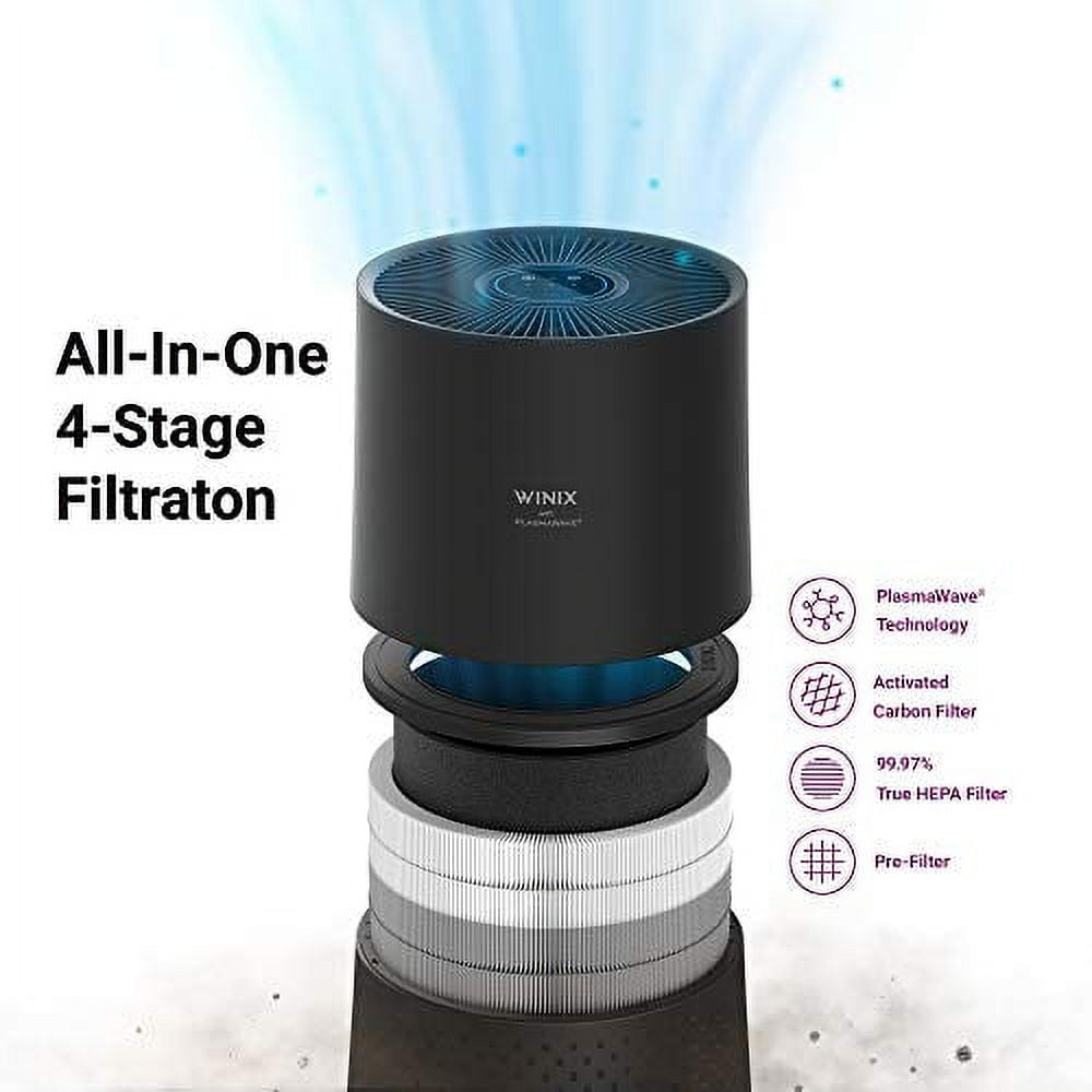 AHAM Verifide® at 230 sq ft. : Also cleans rooms up to 1,110 sq ft in 1 hour (555 sq ft in 30 minutes, 370 sq ft in 20 minutes, 278 sq ft in 15 minutes) Fine Mesh Pre-Filter: The first line of defense against the largest airborne particles found indoors Winix True HEPA: Captures 99.97%* of airborne allergens including pollen, dust, smoke, and pet dander, as small as 0.3 microns Activated Carbon Filter: Reduces VOCs and household odors from cooking, pets, and smoke. It is designed to catch airborne particles found indoors, which also helps prolong the True HEPA Filter life PlasmaWave® Air Cleaning Technology Smart Sensor + Auto Mode: Built-in air quality sensor measures and adjusts fan speed in real-time Air Quality Indicator: Visual indicator displays real-time air quality in the room with LED lights Ultra-Quiet: Nearly silent on its slowest speed Sleep Mode: Activate the quiet, energy-efficient Sleep Mode for a good night’s sleep Tested and Trusted: This unit is proven dependable and efficient by being AHAM Verified, Energy Star Certified, ETL Certified, and backed by the Winix 2 Year Warranty Energy Efficient: Energy Star Certified for low energy consumption, resulting in reduced operating costs Filter Replacement Indicator: When the filters need to be replaced, the Filter Replacement Indicator LED will illuminate