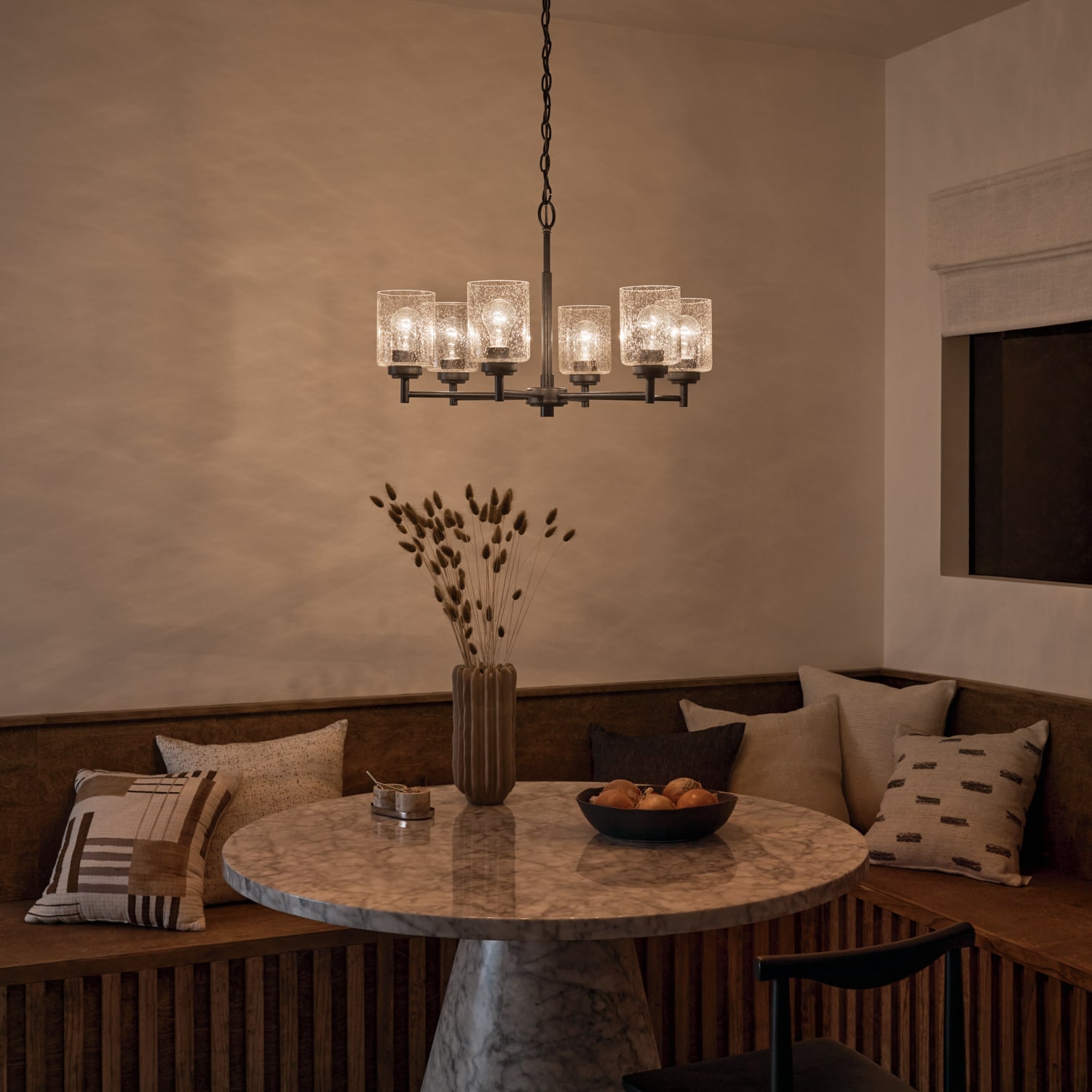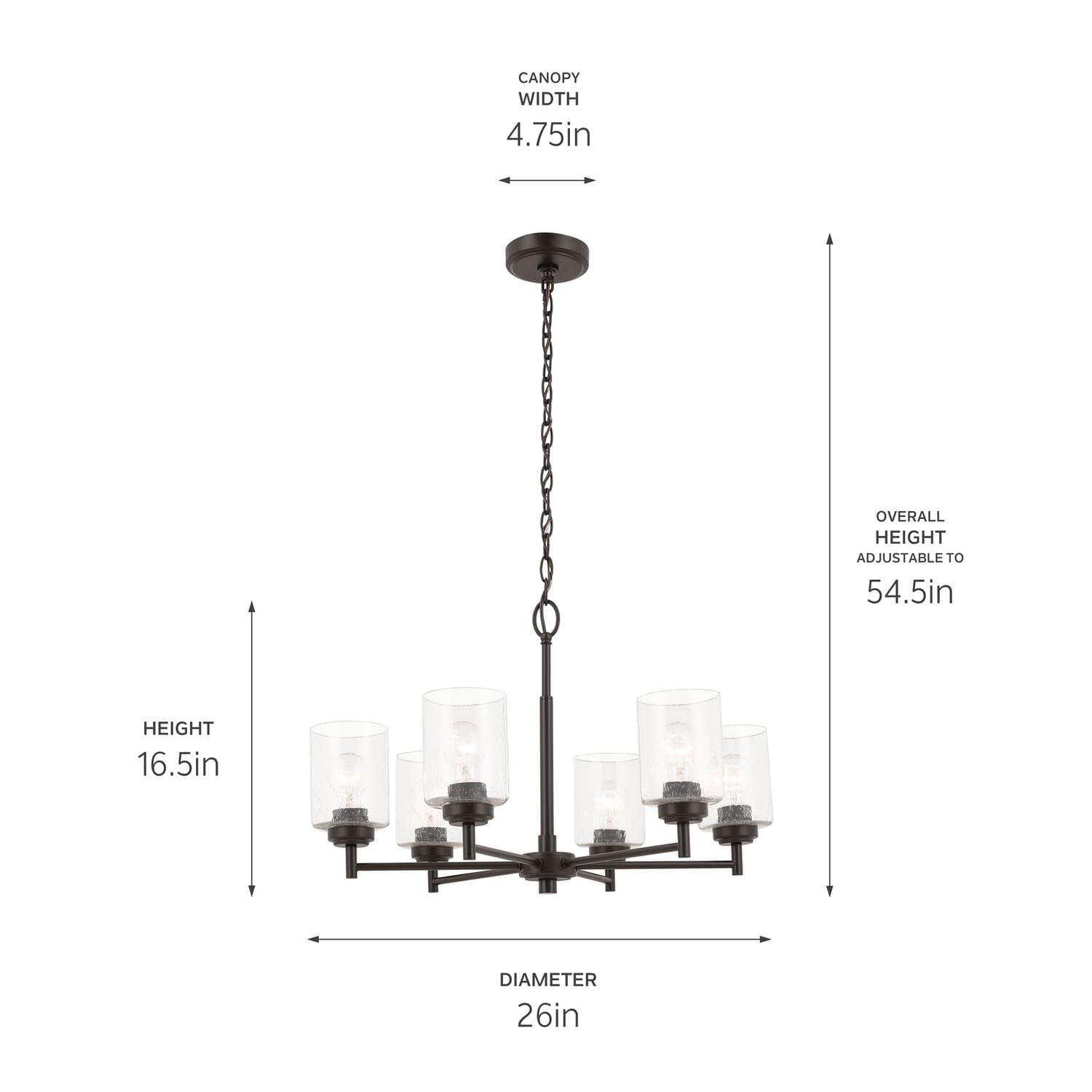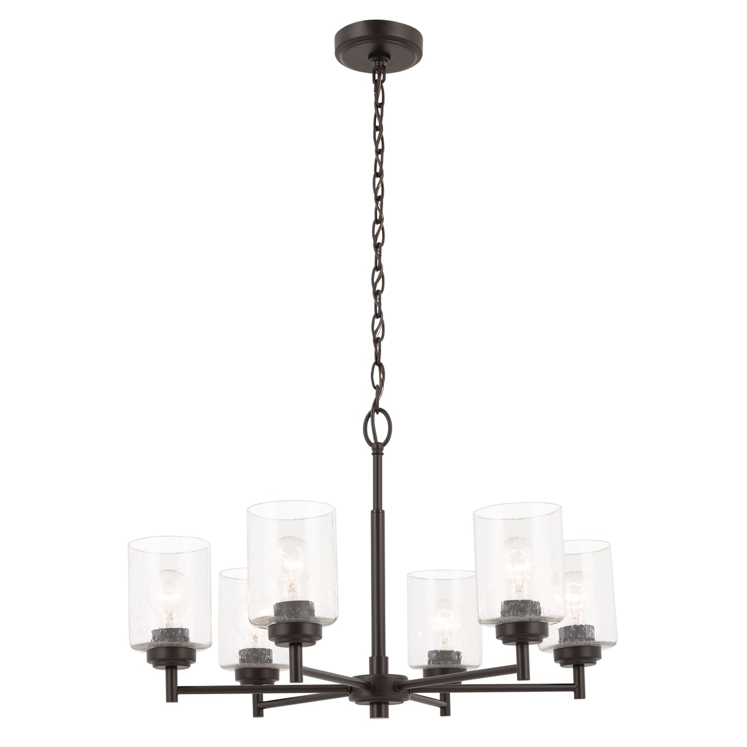 A classic design with a timeless feel, the Winslow 6-light chandelier is sure to brighten any space in your home. As versatile as it is stylish, Winslow’s clear seeded glass filters light beautifully and is removable for ease of cleaning or replacement. Set its arms and glass in an upward or downward direction during assembly to achieve just the right look for industrial aesthetics.