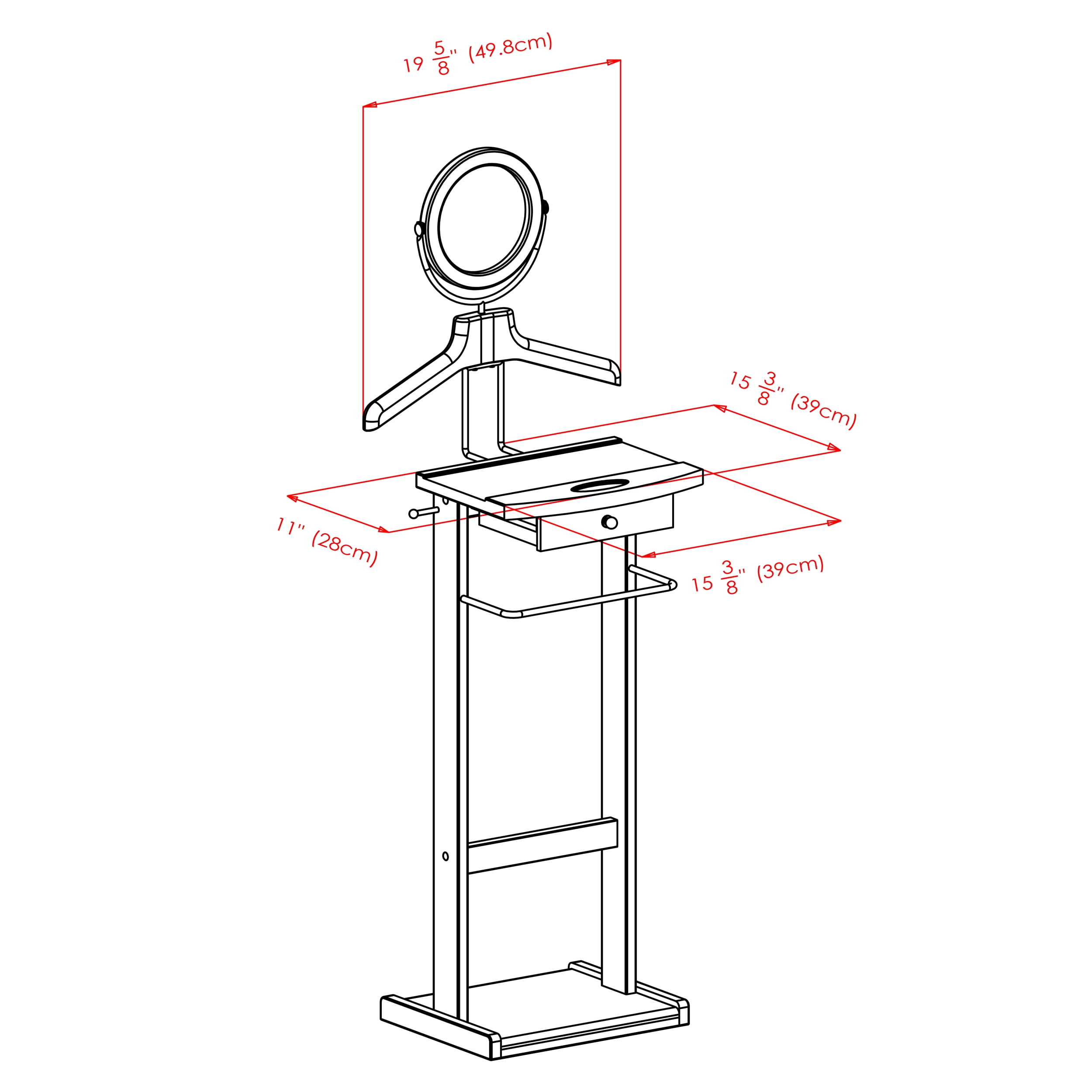 Free-standing clothes organizer/ valet stand Alfred collection by Winsome Solid and composite wood in an espresso finish Transitional style Overall dimensions: 19.84”W x 14.96”D x 55.33”H Features: drawer, round tilting mirror and wooden coat/shirt hanger Additional features: trouser hanger/metal bar and side hooks Drawer interior dimensions: 8.35”W x 6.77”D x 1.97”H Static weight capacity: 20lbs (evenly distributed) Net weight: 17.30lbs Ships in 1 box Box dimensions: 37.25”L x 16.50”W x 4”H Shipping weight: 20lbs Assembly required Model #92155