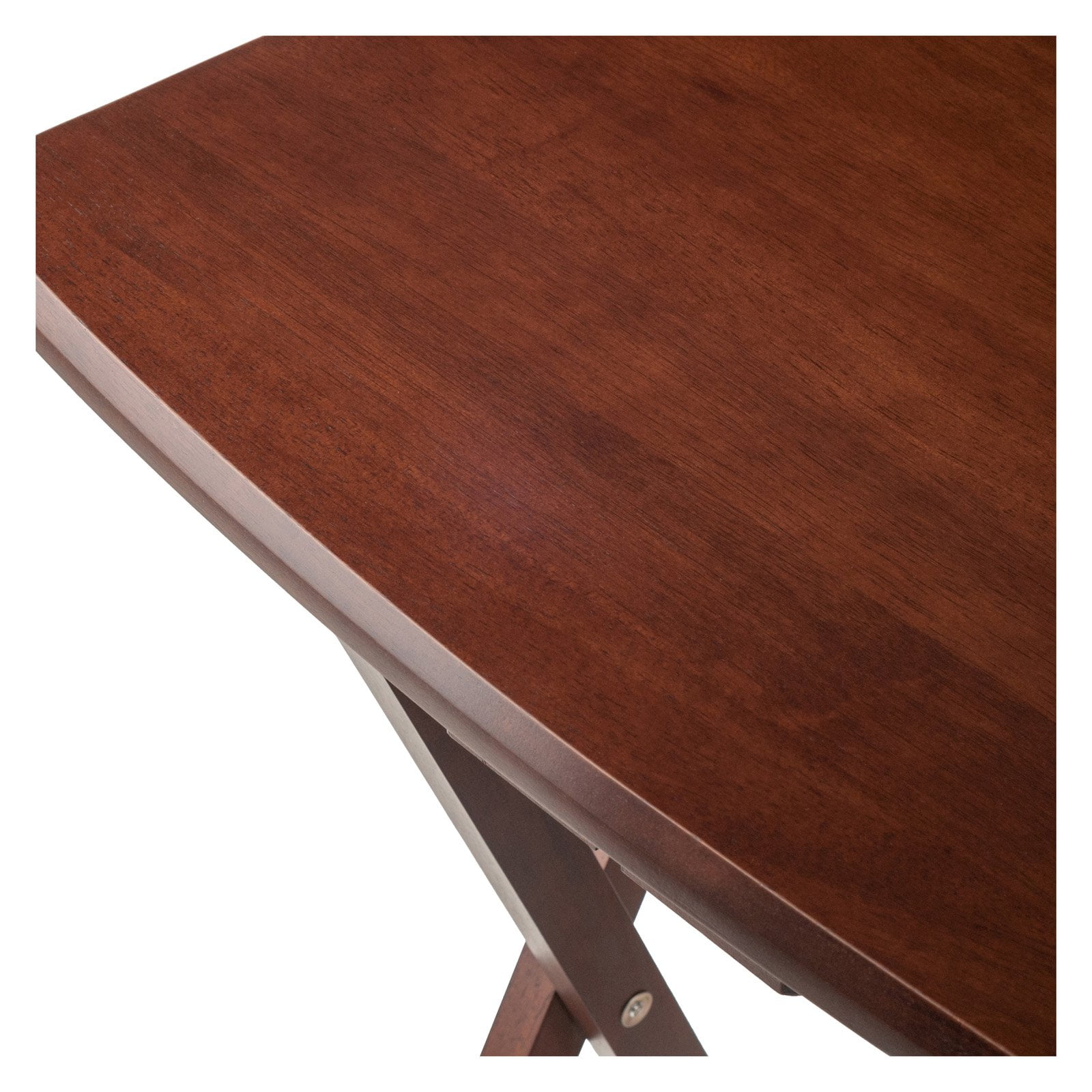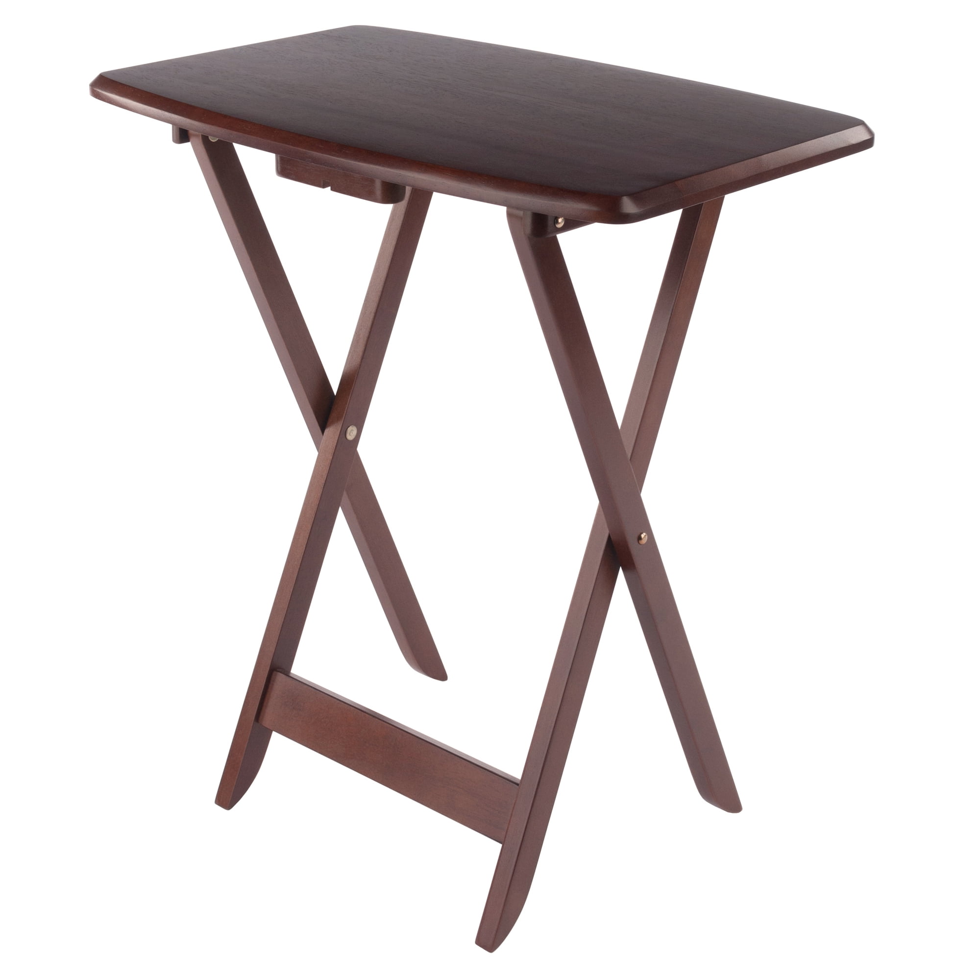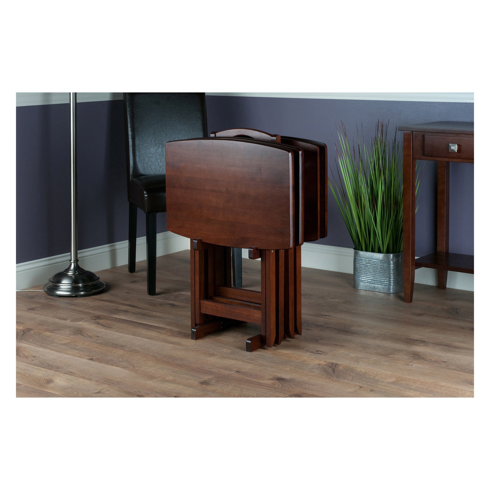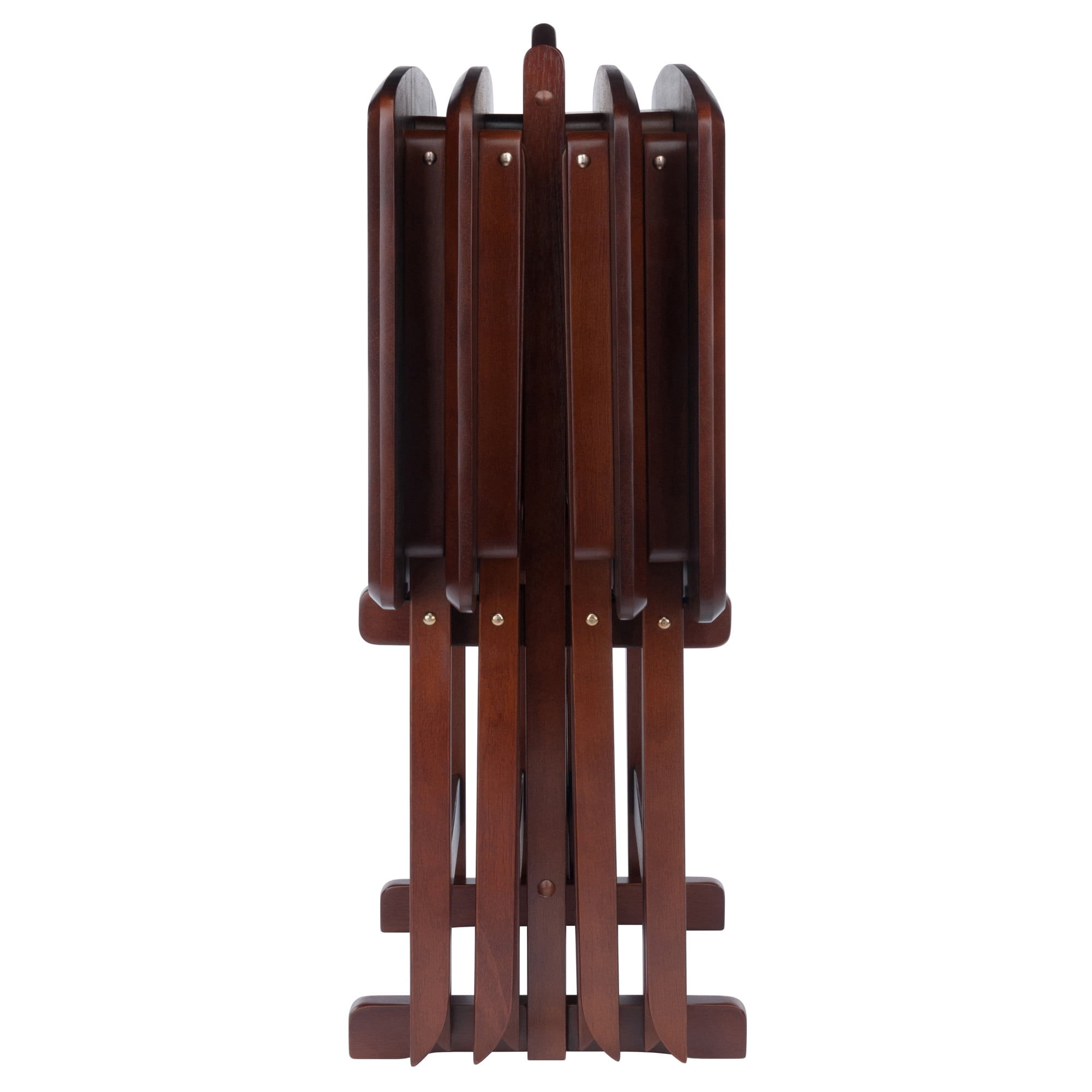 Make entertaining simple and easy with the Winsome Dylan 5-Piece Snack Table Set. Perfectly proportioned, oversized tops for a casual meal at home on the patio, or for working on your laptop. The classic rectangular shape of these snack tables has gently curved sides and rounded corners that looks neat and attractive. For convenience an upright stand is an innovative addition to this set of four tables as it serves as a rack to store the folded tables discretely when not in use. The stand is easy to set up, quick assembly required and holds the tables perfectly. Constructed of solid and composite wood in a warm walnut finish. It is overall a functional table set that will find its use in many places of your home. Conveniently ships in one box, that includes the hardware necessary for assembling the stand as the tables ship fully assembled and ready to use.