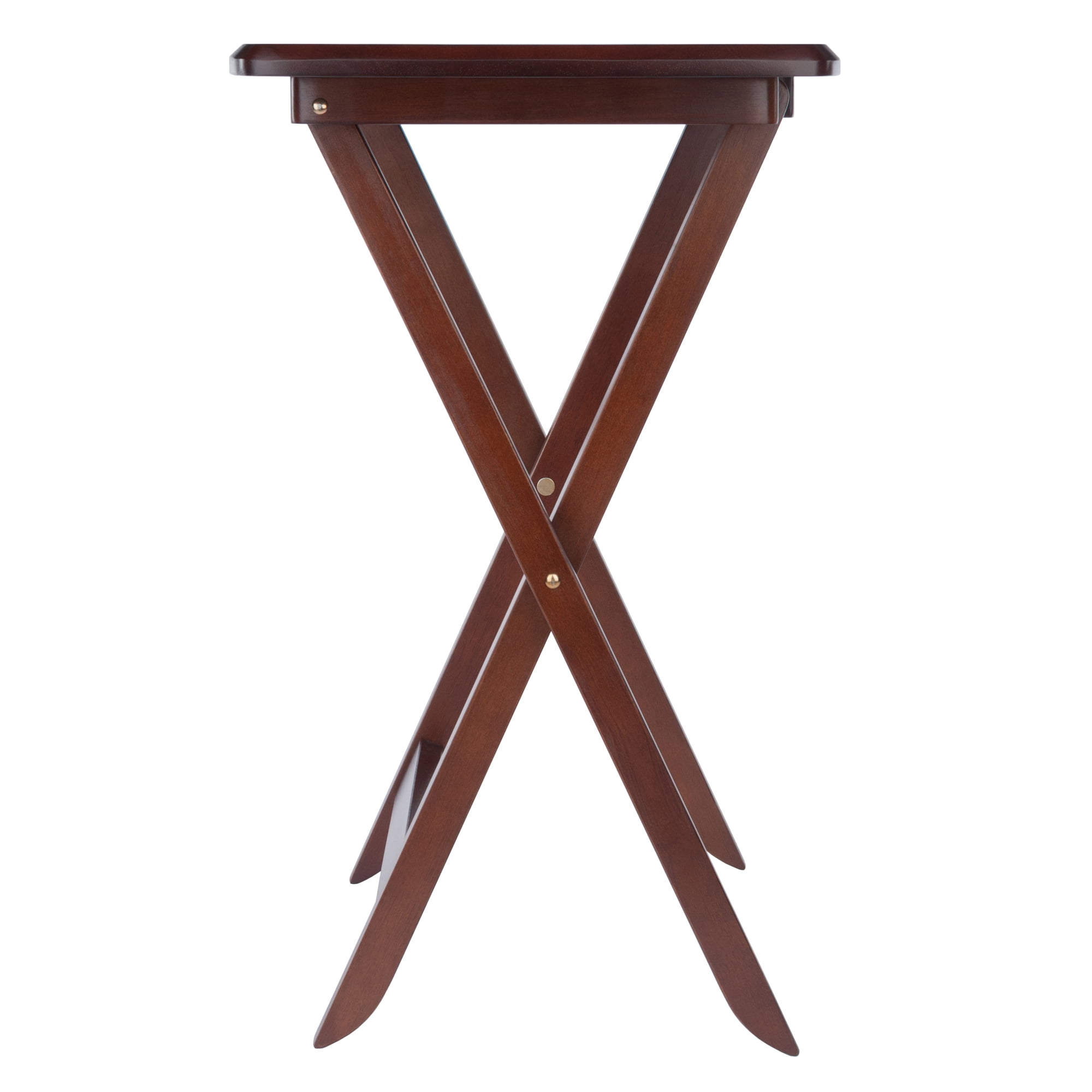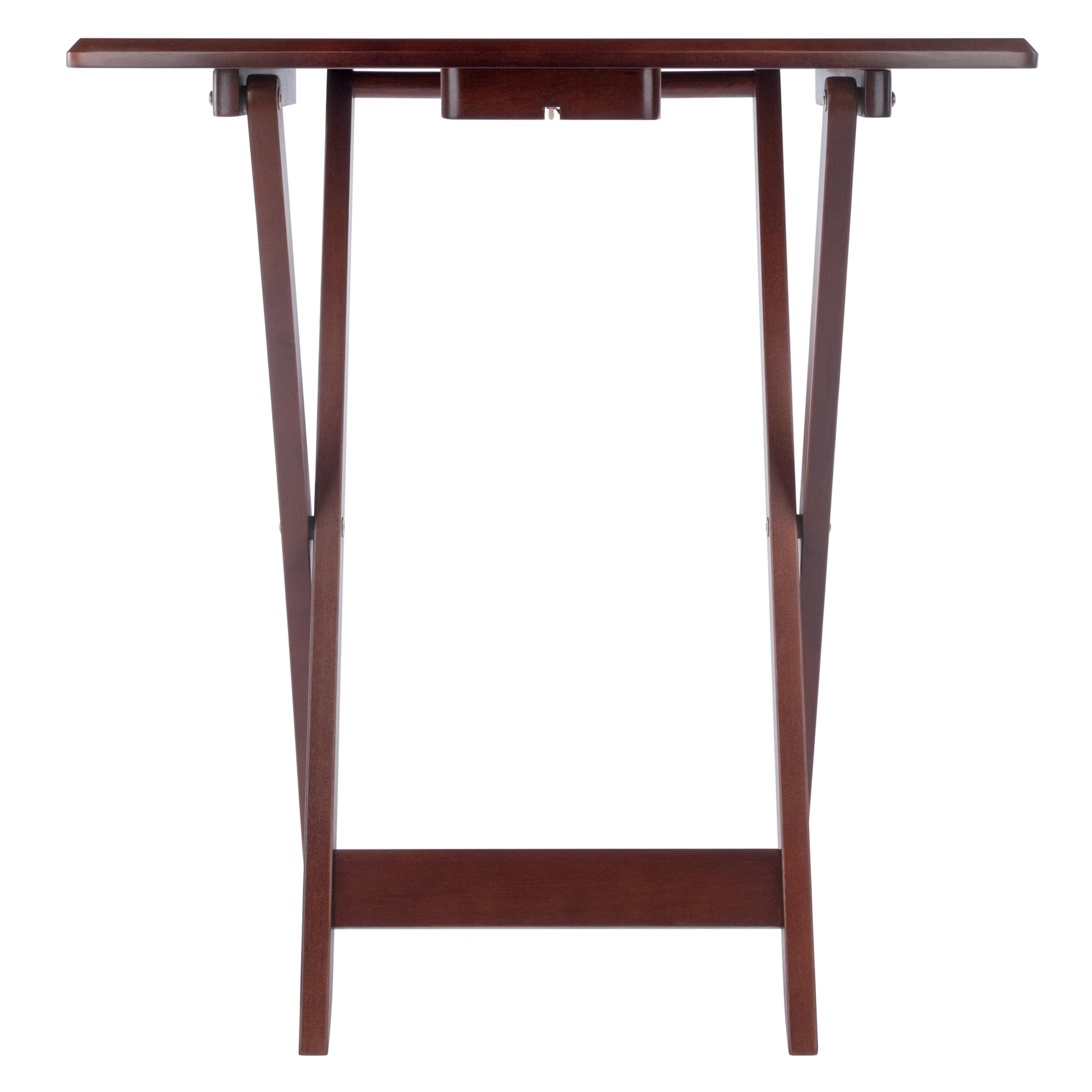 Four foldable snack tables with oversized Rack/stand for table storage Dylan collection Transitional style Walnut finish Rack dimensions with tables loaded: 23.62″W x 12.36″D x 31.46″H Table Dimensions: 23.62″W x 15.75″D x 25.51″H Static weight capacity: 25lbs per table Net weight: 47.20lbs Constructed of solid and composite wood Ships in 1 box Box dimensions: 33.75″L x 25”W x 7.75″H Shipping weight: 52.10lbs Assembly required for stand only Intended for indoor use Model #94517