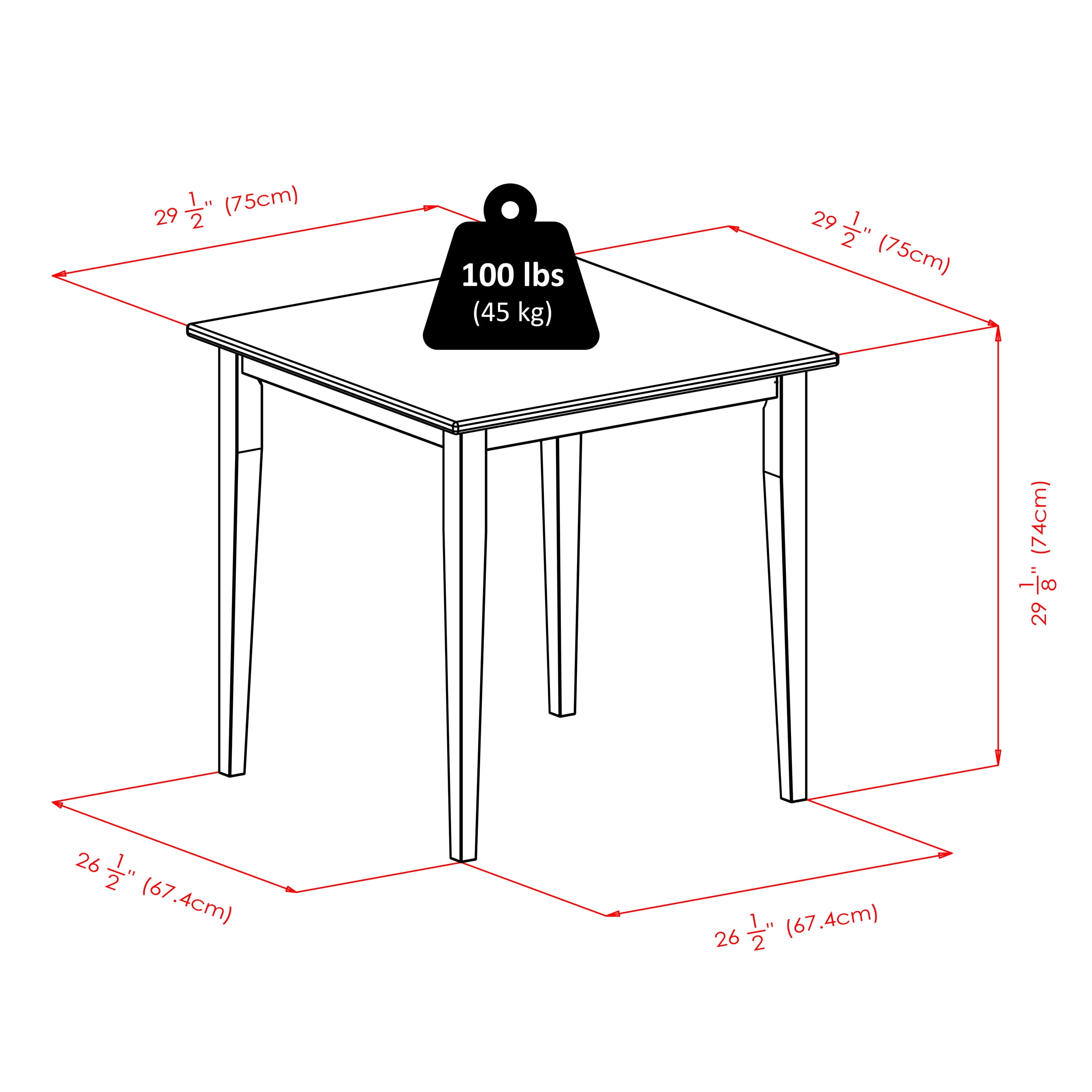 Solid wood dining table with a classic finish for use for years to come Sturdy Shaker legs for stable, reliable support without wobbling Completely constructed from solid wood that offers years of sturdy use and function Accommodates 4 chairs for family meals, board game nights, or dessert Easy assembly with straightforward instructions and intuitive design Assembly required: Yes Material: Wood Color: Oak Dimensions (L x W x H): 29.53 x 29.5 x 29.65 inches Weight: 28.4 pounds Manufacturer warranty: 60-day warranty