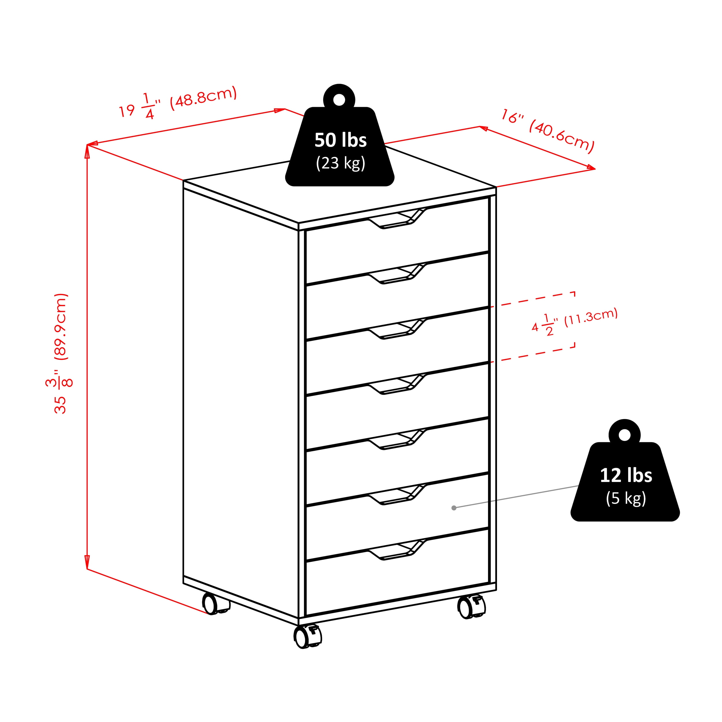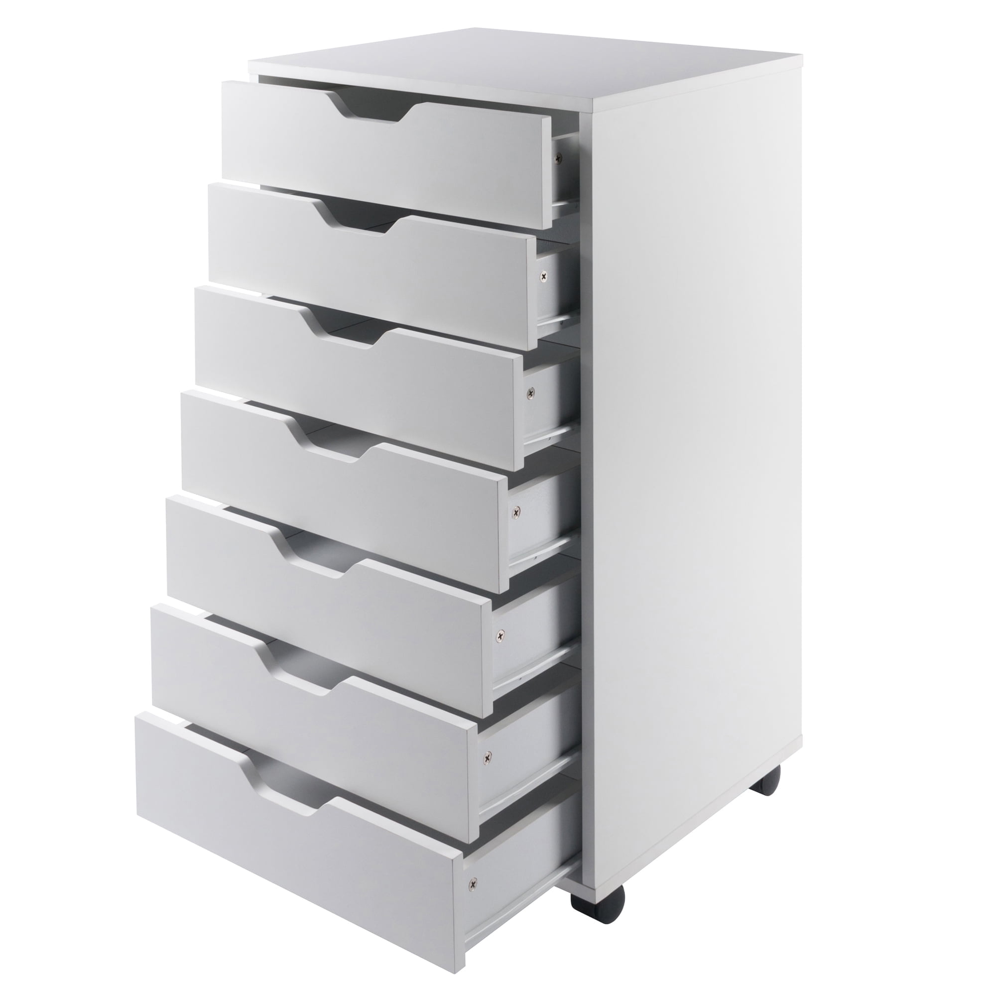 Freestanding, multi-drawer mobile cabinet; organizers Halifax collection by Winsome Clean white finish Contemporary style Constructed from composite wood Overall dimensions: 19.21”W x 15.98”D x 35.39”H 7-Drawers (interior) dimensions: 16.06”W x 11.73”D x 2.56”H Clearance underneath cabinet: 2.16″H Cut-out handles on drawers 4-Wheels (2 with locking mechanism) Static weight capacity; top 50lbs, drawer 12lbs ea. Net weight: 55.12lbs Ships in 1 box Box dimensions: 37.50”L x 22.50”W x 7.10”H Shipping weight: 60lbs Assembly required Recommended use: indoor-household Model #10792