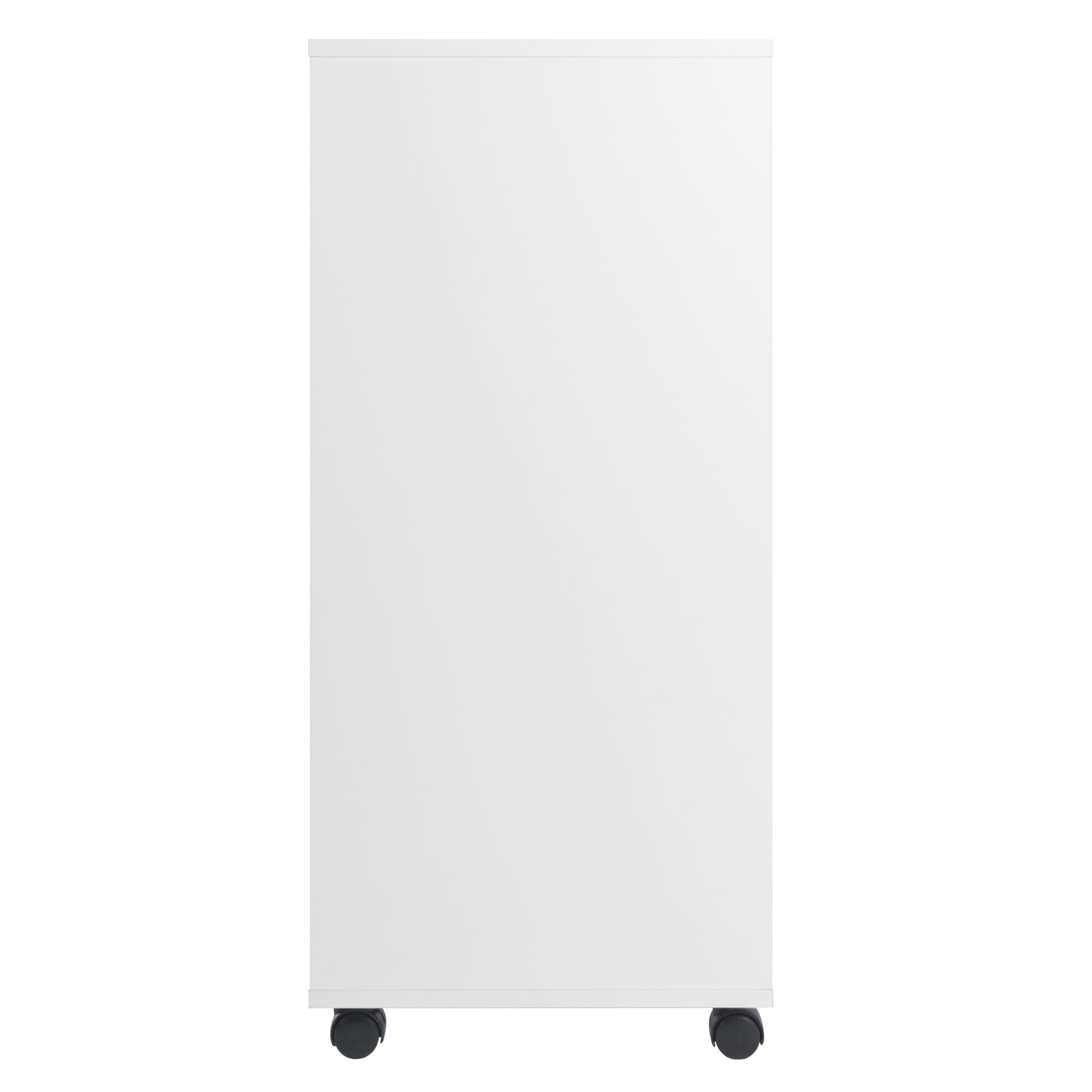 Use the Winsome Halifax 7-Drawer Mobile Cabinet for a variety of organizational needs. A clean, simple design that you will find function to in just about any room of your home. Featuring a multitude of drawers that will help eliminate the appearance of clutter with convenient cut-out handles that allow for easy-open access. The vertical design allows for minimal floor space to be taken up, while still proving plenty of storage. Ideal for a bedroom, craft room, dorm or even kitchen. It is the perfect organizer for your knitting, sewing, or craft supplies. Or expand your storage for jewelry and styling accessories. Rejuvenate your home-office or den as this unit is well-suited for documents and files, and plenty of space for keeping charging cables and office accessories neat and organized. With 7 easy-glide drawers at 16.06”W x 11.73”D x 2.56”H, that provide ample storage for sorting items into 1 of 7 drawers. Sitting on four wheels, two of which lock, so you can move with ease or keep securely in place. An easy to clean, sturdy composite wood construction finished in a crisp, white that makes this simple, contemporary design certain to brighten any space. Combine this unit with other cabinets from the Winsome’s Halifax collection to create infinite storage options (each sold separately). Ships in one box with the hardware necessary for assembly.