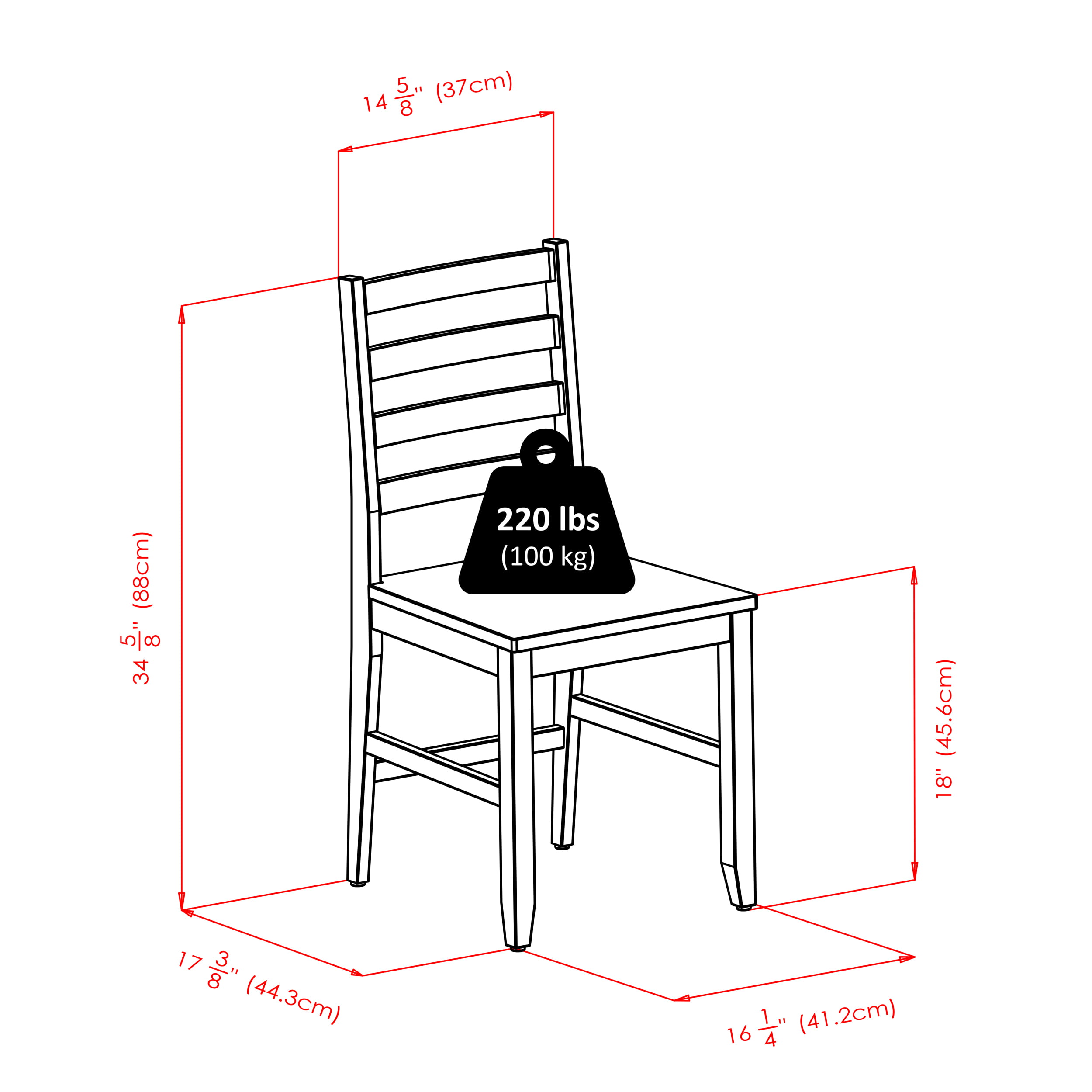 Set of two ladder-back chairs Transitional style Hamilton collection Walnut finish Overall dimensions: 16.54″W x 18.63″D x 34.65″H Seat dimensions: 16.54″W x 16.46″D Seat height: 17.98″ Seat back height: 15.26″ Static weight capacity: 220lbs Constructed of solid wood Ships in 1 box Box dimensions: 37.50″L x 19.25″W x 8.75″H Shipping weight: 34lbs Assembly required Model# 94236