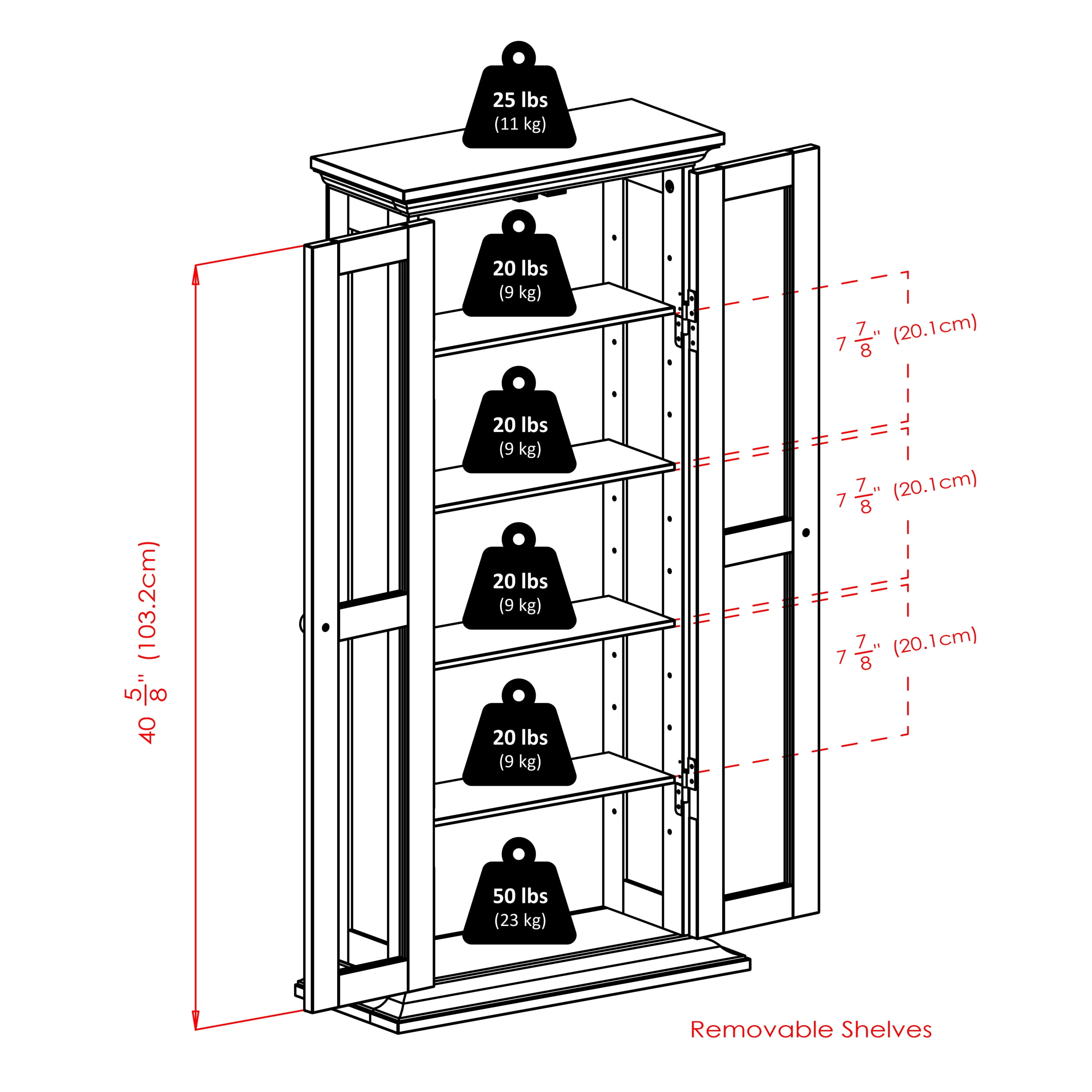 Winsome Wood Holden Media Cabinet, Walnut: Transitional style Holden collection Media storing cabinet Walnut finish Assembled dimensions: 21.97”W x 9.17”D x 44.17”H Interior dimensions: 16.46”W x 6.42’D x 40.6”H 5 Adjustable shelves Static weight capacity: top 25 lbs, shelves 20 lbs Constructed of solid and composite wood Item weight: 33.07 lbs Arrives in 1 box Box dimensions: 45”L x 20.25”W x 6.75”H Shipping weight: 40 lbs Assembly is required Model #94944
