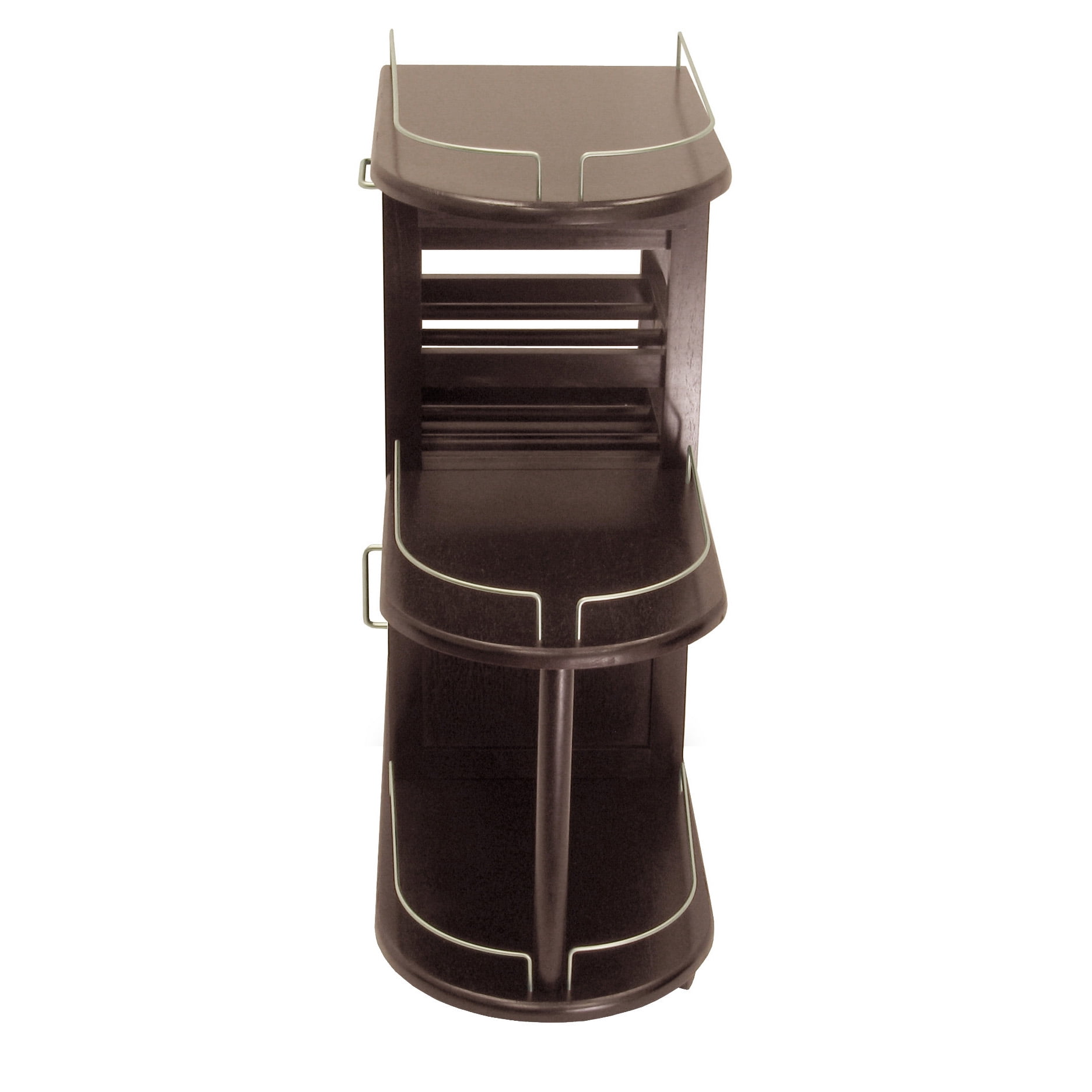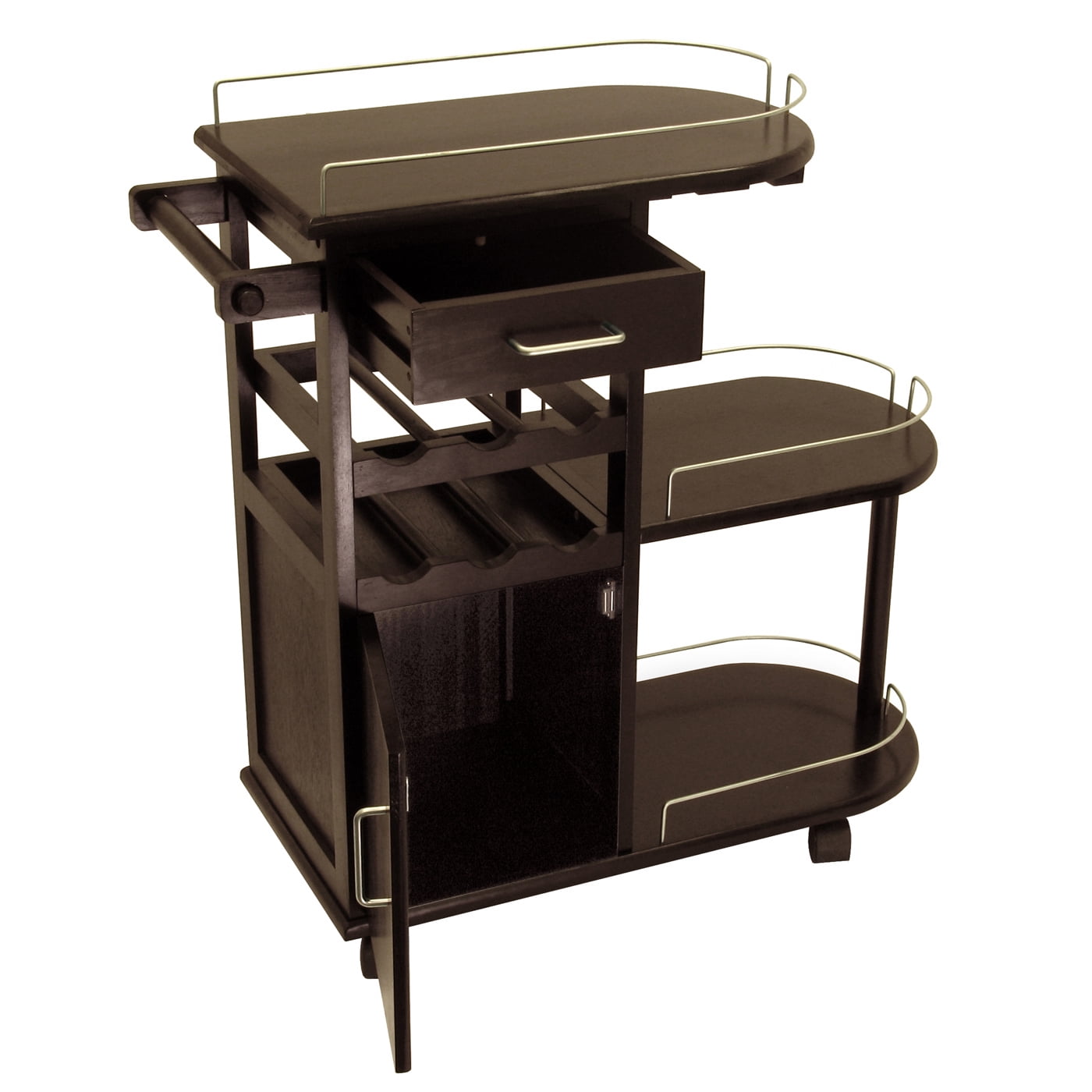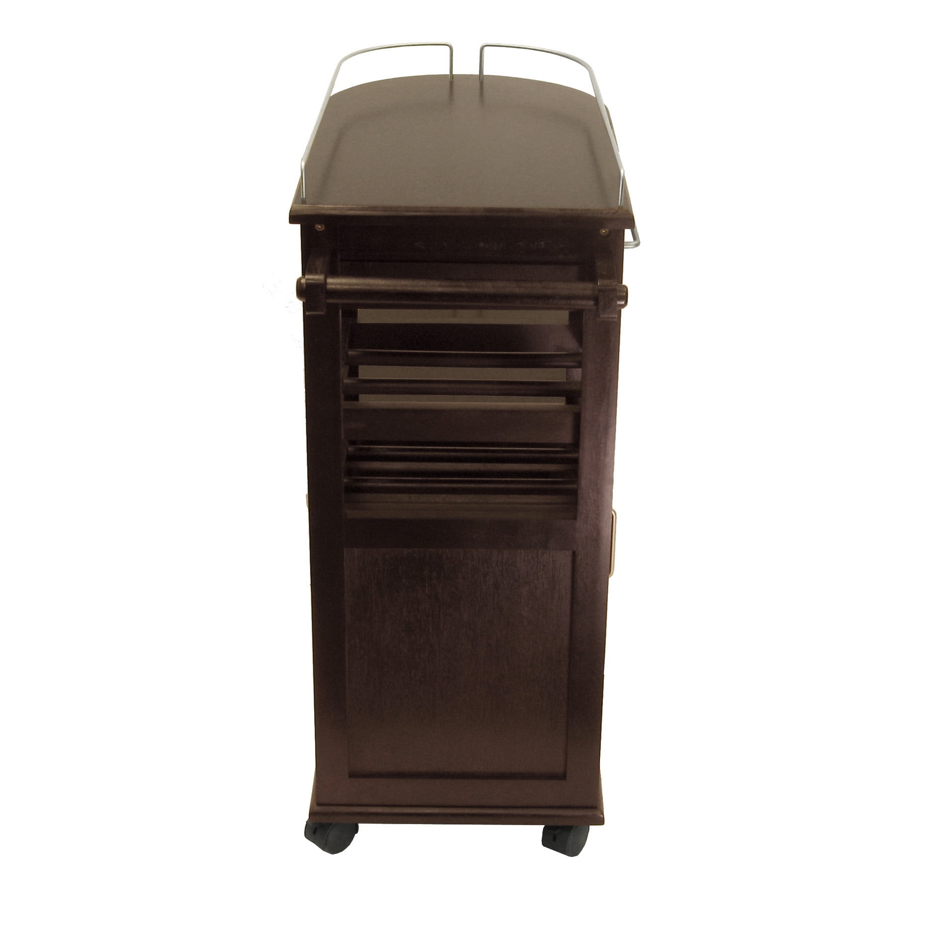 Winsome Wood Jimmy Entertainment Kitchen Cart, Espresso Finish: Bring the fun right to your guests with this handy rolling entertainment cart Hold and tote wine bottles, glasses and more Side of the cart has 1 drawer, 2 wine racks that hold 6 bottles, 1 cabinet with door plus a handle to push the cart or hand towels Top surface and 2 side shelves have metal curved accents Glass rack holds up to 6 glasses under the top Constructed with a combination of solid and composite wood in an espresso finish Assembly required 60-day parts warranty Dimensions: 15.39″D x 35.40″W x 35.90″H Model# 92235