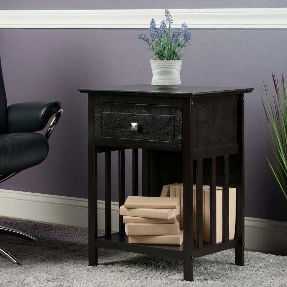 The Winsome Wood Marcel 1-Drawer Nightstand includes eye-catching details such as mission-style slatted sides, a full-sized drawer, and step-cut hardware. Use this all-around end table in the living room next to the sofa, as a bedside table, or a printer stand in your home office. The lower shelf is ideal for keeping books and magazines, and the ample drawer is great for storing TV remotes and charging wires out of sight, yet within easy reach for your convenience. Constructed of sturdy solid and composite wood in a dark coffee finish that can easily mesh with most home decors. For larger beds, sofas or rooms, try adding one accent table on each end to unify the space (each sold separately). Conveniently packed and shipped in 1 box that includes the hardware necessary for assembling.