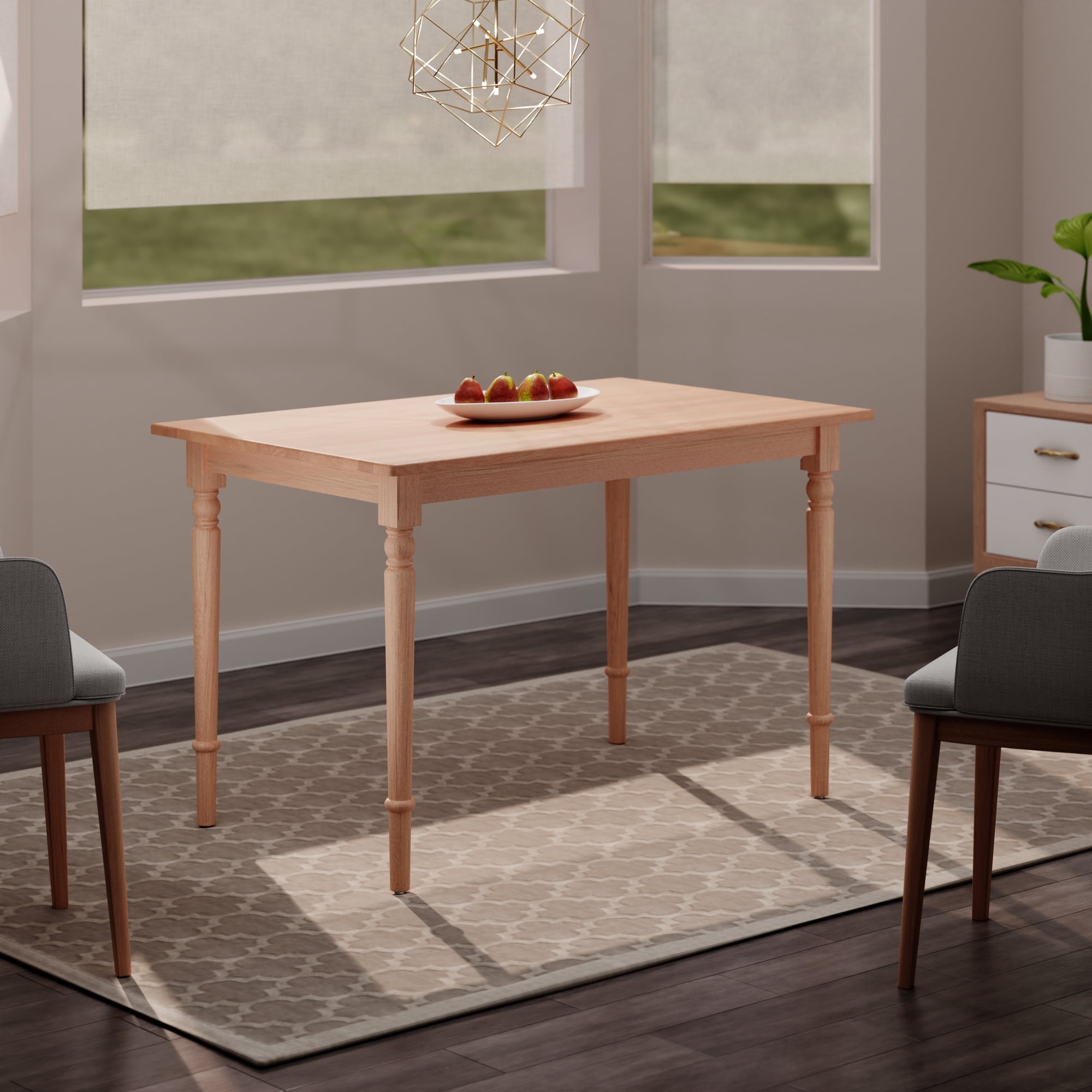 Rectangular dining table Part of the Ravenna collection by Winsome Natural finish Traditional style Assembled dimensions: 47.24”W x 29.53”D x 30.08”H Clearance between legs: 38.98” (front), 21.26” (side) Apron to ground clearance: 26.73”H Static weight capacity: 125 lbs Solid wood construction for durability Net weight: 41 lbs Ships conveniently in 1 box Box dimensions: 50.75”L x 32.75”W x 5.25”H Shipping weight: 51 lbs Assembly required Recommended use: indoor household use Model #89448