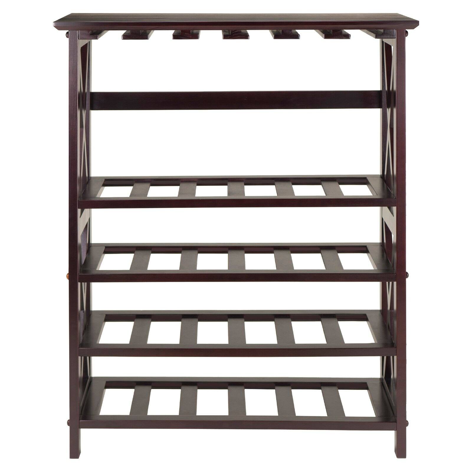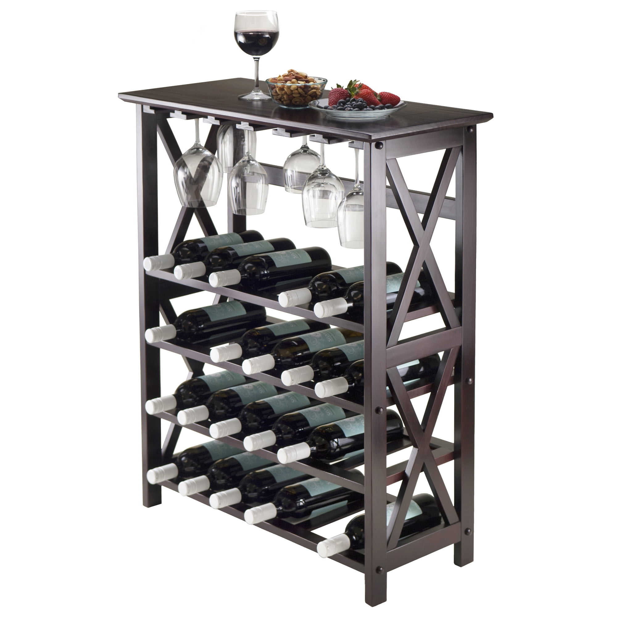 Winsome Wood Rio Display Wine Rack with Glass Hanger X Panel, Espresso Finish: Transitional style Espresso finish Overall dimensions: 28.74″W x 13.39″D x 35.71″H Can store as many as 24 wine bottles Clearance of wine shelves: 5.31″ Stemware rack can accommodate as many as 18 wine glasses (varies on glass diameter) Top static weight load: 50 lbs Shelf static weight load: 25 lbs per shelf Constructed of sturdy solid wood Item weight: 19.55 lbs Arrives in 1 box Box dimensions: 15″W x 39.7″L x 7.75″H Shipping weight: 23.8 lbs Assembly is required Replacement parts within 60 days from date of purchase