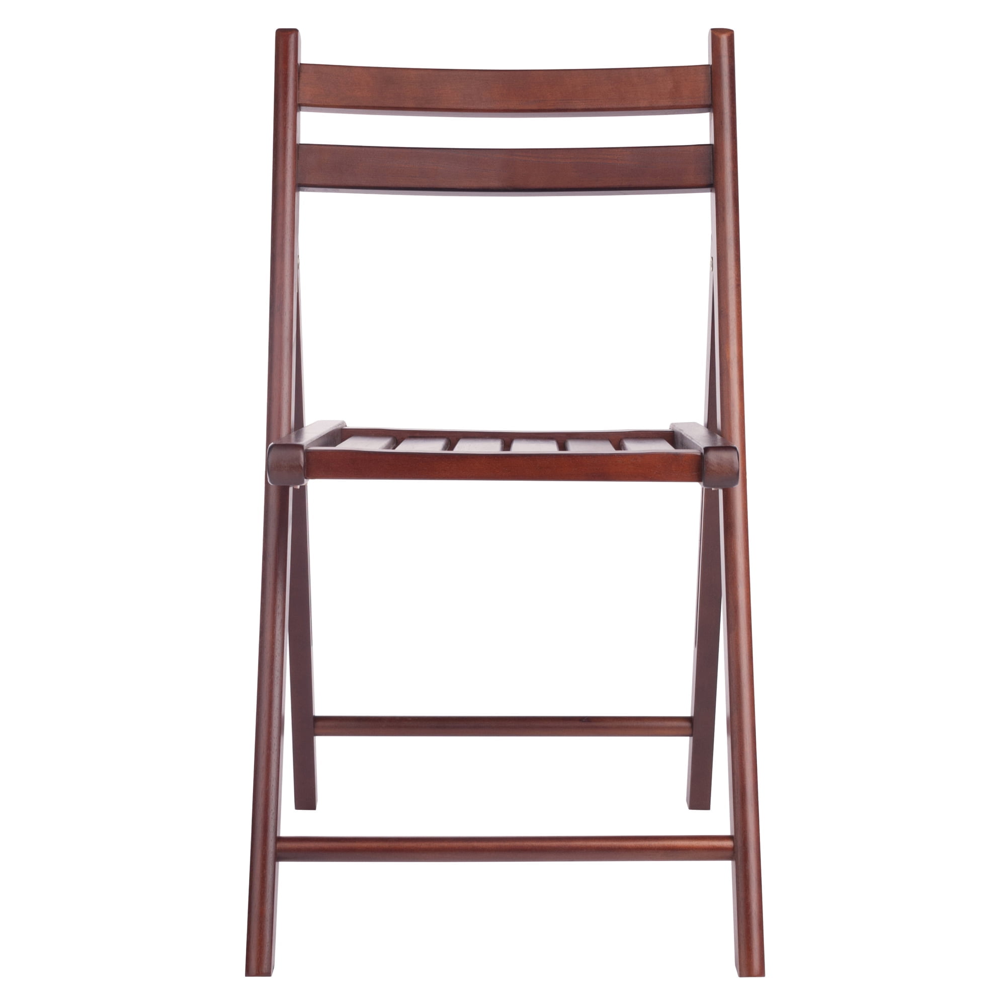 The Winsome Wood Robin Folding Chair set has never looked so handsome. Finished in a rich walnut, this 4-piece set of solid wood chairs is an indispensable addition to any home. Smooth slatted seats give a classic yet clean look that can complement almost any style. Sitting at 17.4?H from the ground and the support from the double-bar backs allow for extra comfort and relaxation. Pull up the chairs for a game of cards or bring them out when company comes over and have extra seating around the dining table or living room. These chairs tuck away nicely against one another, when not in use, for compact storage and helping you save precious floor space. This makes them an excellent choice for small spaces. The lightweight, portable design allows for easy transport suitable for parties, tailgating, camping trips and other social gatherings. No assembly is required and for your convenience the set is packed and shipped in 1 box.