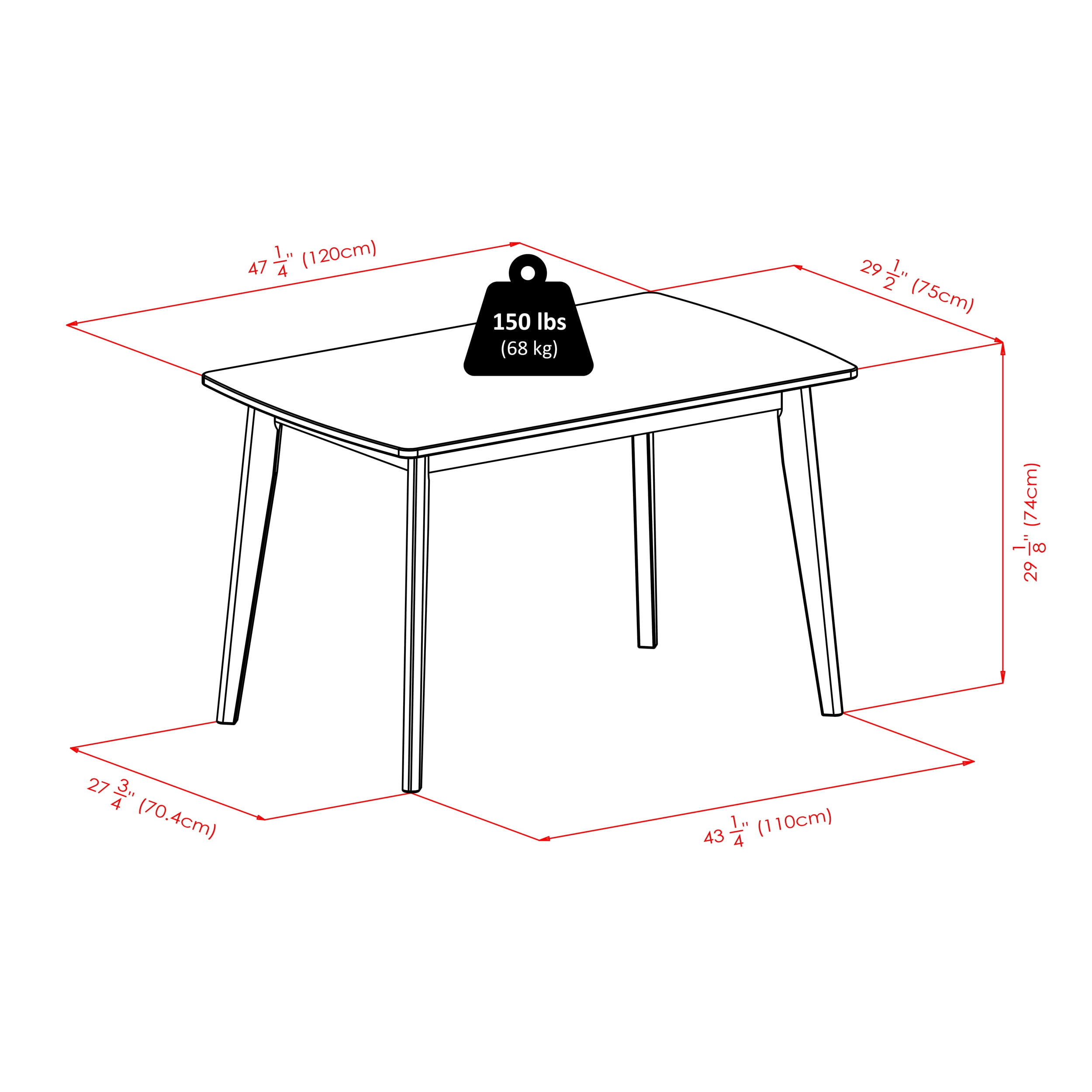 Oblong dining table Legs in angled position Shaye collection by Winsome Walnut finish Traditional style Assembled dimensions: 47.24”W x 29.53”D x 29.13”H Clearance between legs: 39.72”W Front, 24.13”W Side Clearance between legs: 25.59”H Apron to ground clearance: 26.73”H Leg foot print: 43.31” Front, 27.70”Side Static weight capacity: 150lbs Solid wood construction Net weight: 37.25lbs Ships in 1 box Box dimensions: 50”L x 32”W x 4.75”H Shipping weight: 44lbs Assembly required Recommended use: indoor household use Model #94848