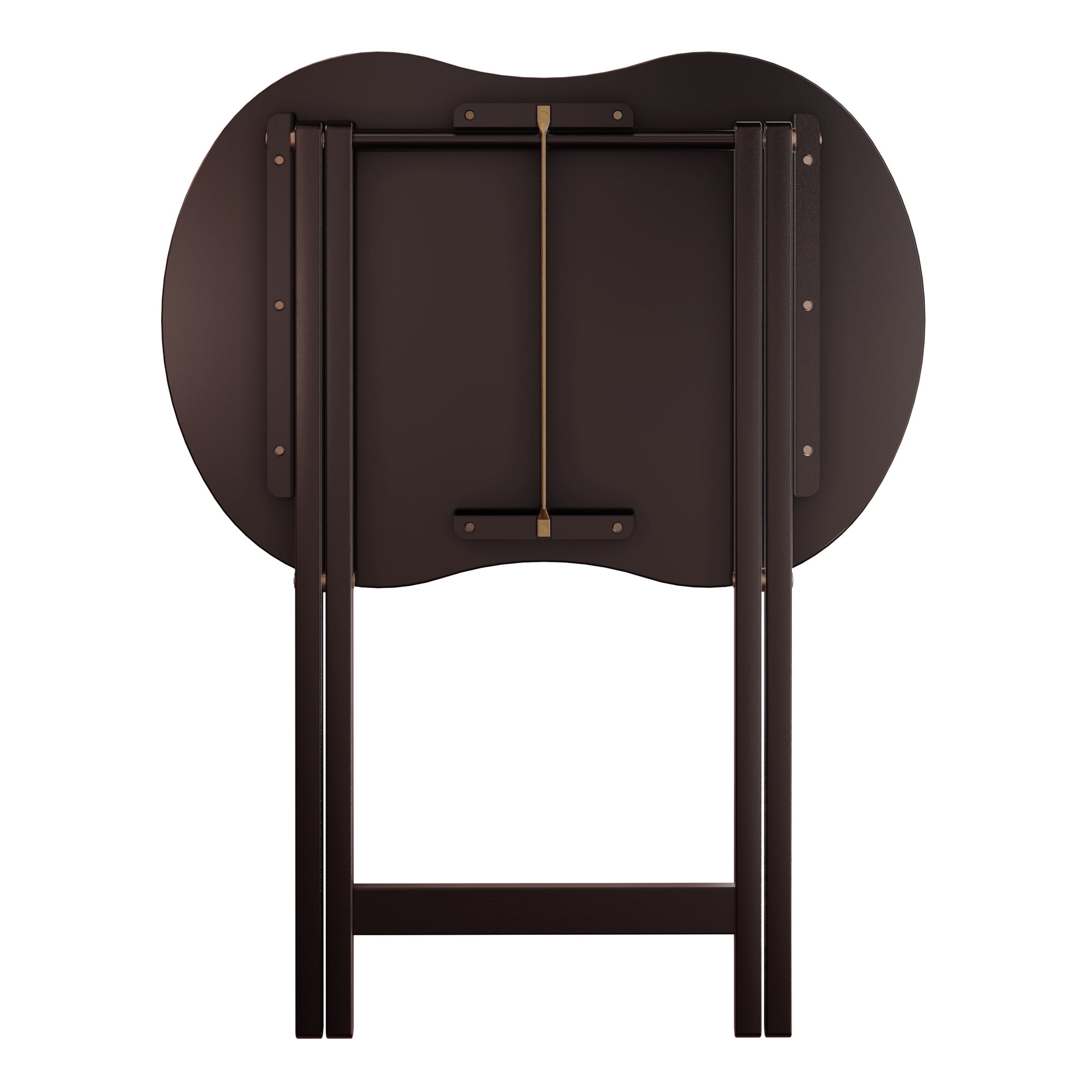 Four foldable snack tables with peanut-shaped tops Rack/stand for table storage Skippy collection by Winsome Transitional style Espresso finish Table Dimensions: 23″W x 16.14″D x 25.83″H Rack dimensions with tables loaded: 23″W x 11.97″D x 31.30″H Static weight capacity: 25lbs per table Constructed of solid and composite wood Ships in 1 box Box dimensions: 34.75″L x 24.60”W x 6.30″H Shipping weight: 43lbs Assembly required for stand only Intended use: indoor Model #92532