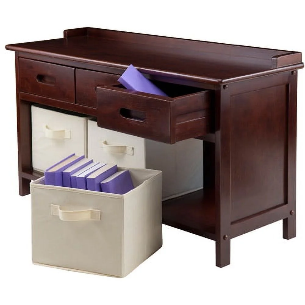 Winsome Wood Adriana 4-PC Set, Storage Bench & 3 Folable Beige Fabric Baskets: Versatile storage bench 3 drawers 3 foldable fabric baskets Made from solid and composite wood Walnut finish Assembly required Dimensions: 37.9″W x 14.17″D X 22″H Each basket measures: 10.97″W x 10.06″D x 9″H 60-day replacement parts Model# 94602