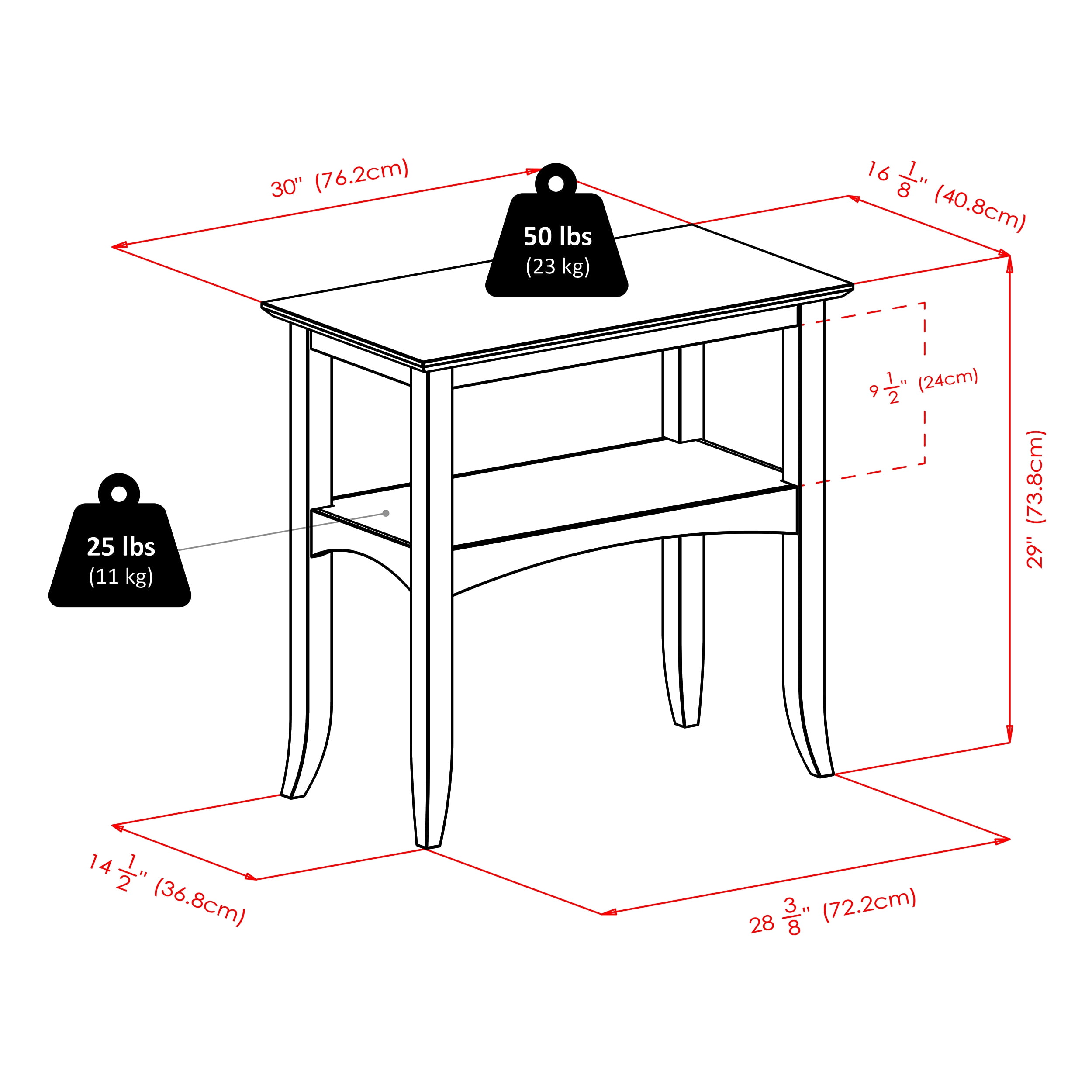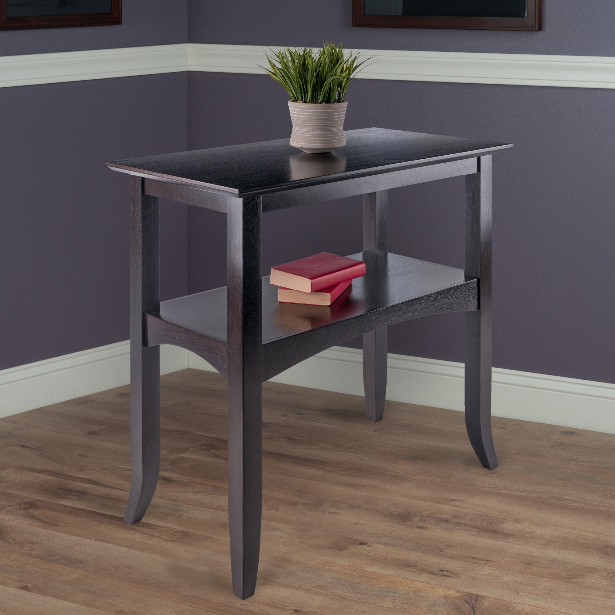Winsome Wood Camden Console Hall Table, Coffee: Features Camden Console Table 9.4″ Clearance between shelf and tabletop apronSpecifications Color: Coffee Assembly Required: Yes Clearance Between Floor & Shelf Apron End: 14.4″ H Clearance Between Floor & Shelf Apron Center: 15.6″ H Distance Between Legs Front: 26.4″ Distance Between Legs Side: 12.5″ Overall Dimensions: 30″ W x 16″ D x 29″ H Shelf Dimensions: 27.1″ W x 13.2″ D Weight: 29 lbs
