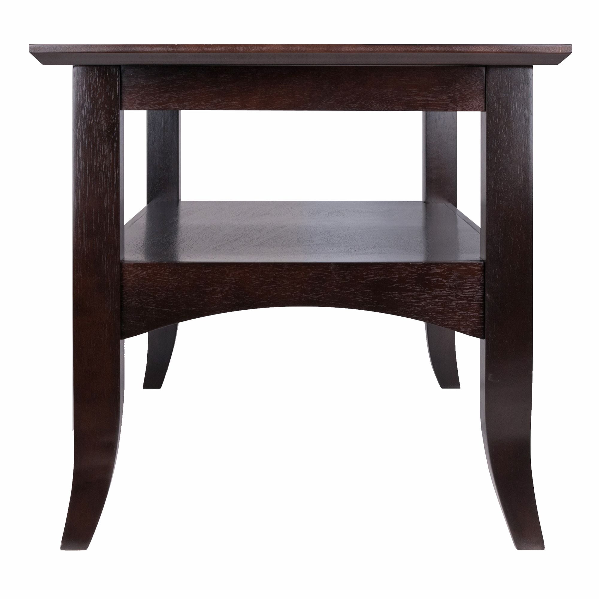 Simplify your family room while adding a touch of elegance and class with the Winsome Wood Camden Coffee Table. This collection is uniquely defined by its style of slightly flared legs and curved aprons, that offer an attractive and functional space for your daily needs. Enjoy a refreshing cup of coffee with your friends and family as you gather in your living room. Large surface space and a lower shelf with ample space for storing things such as books, frames, knick-knacks, and other daily use items. The natural wood grain brings out the warmth and elegance of the rich Coffee finish. Made up of remarkably sturdy solid wood for long lasting durability. Coordinate this coffee table with other furnishings from the Winsome Camden collection for a cohesive look throughout your home. Conveniently packed and shipped in 1 box, that includes the hardware necessary for assembling. Replacement part request can be submitted directly to the manufacturer within 60 days from date of purchase.