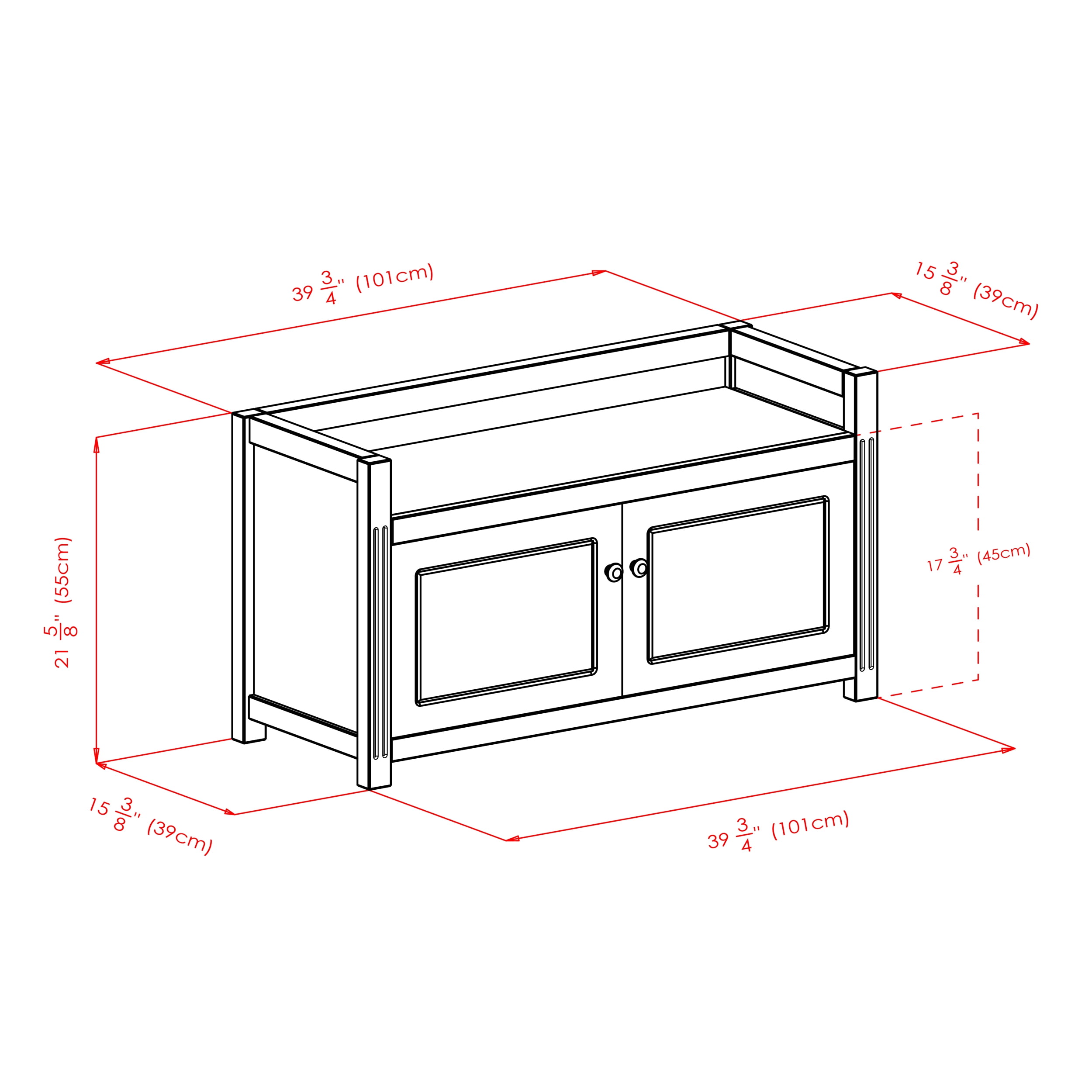 Spacious bench with 2- door storage compartment Charleston collection Walnut finish Traditional style Overall assembled dimensions: 39.76”W x 15.35”D x 21.65”H Seat cavity: 36.22”W x 13.98”D x 3.94”H (within rim) Seat height: 17.72” (measured from floor) Storage compartment dimensions: 17.72”W x 13.78”D x 13.98”H (each) Static weight capacity; bench 200lbs, cabinet 30lbs Constructed of solid wood and composite Item weight: 52.03lbs Ships in 1 box Box dimensions: 40.50”L x 21”W x 9.50”H Shipping weight: 60lbs Assembly is required Model #94040