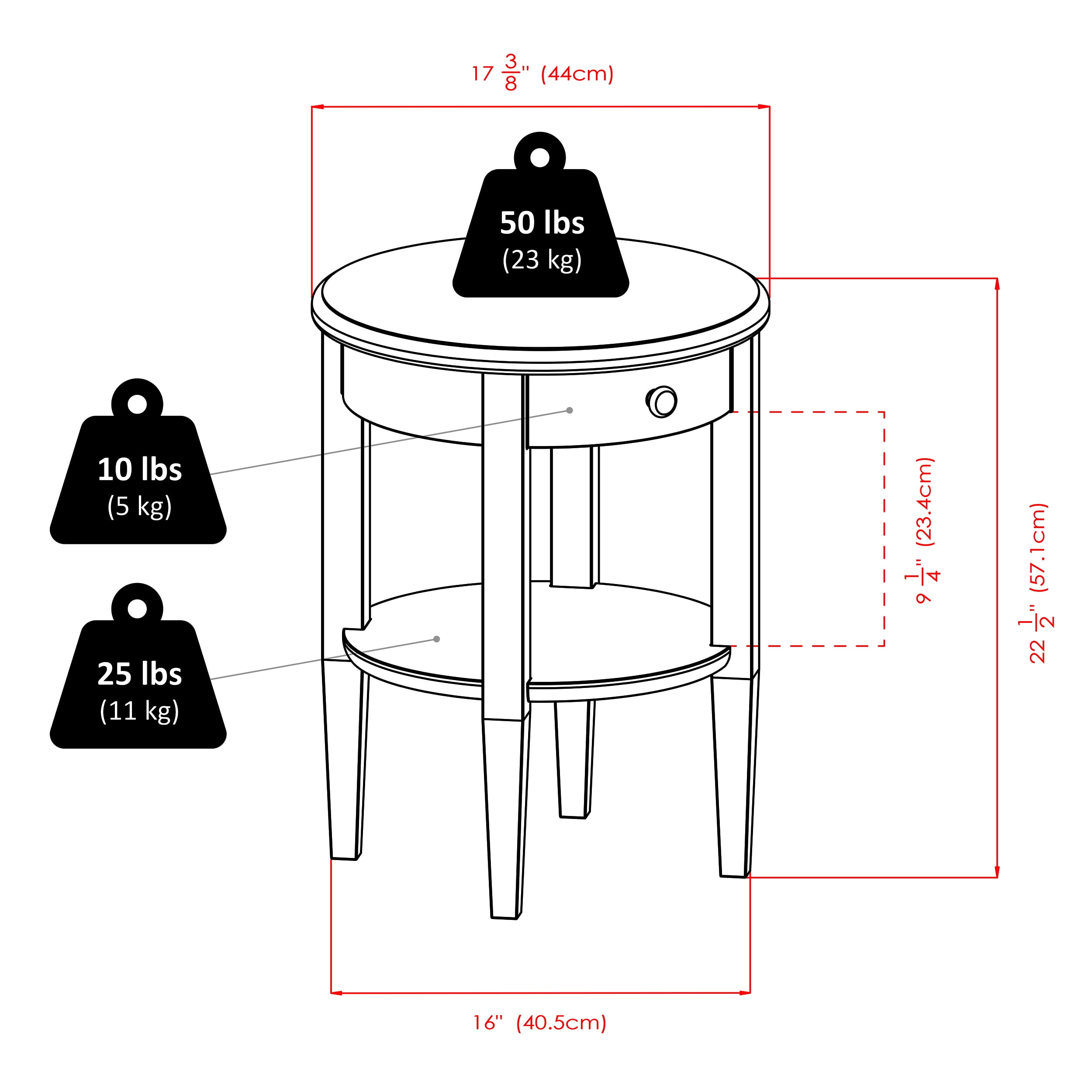 Winsome Wood Concord Accent Table with Drawer and Shelf, Walnut Finish: Classic style Concord collection Accent/ end table with drawer and shelf Overall assembled dimensions: 17.32″W x 17.32″D x 22.48″H Walnut finish Drawer (interior) dimensions: 5.91″W x 9.65″D x 2.83″H Shelf diameter: 14.96″ Clearance under shelf: 9.21″ (measured from the apron to shelf) Constructed of beech wood and veneer Item weight: 17.64 lbs Arrives in 1 box Box dimensions: 19″W x 23.5″L x 8.5″H Shipping weight: 22.5 lbs Assembly is required Replacement parts within 60 days from date of purchase Model #94217