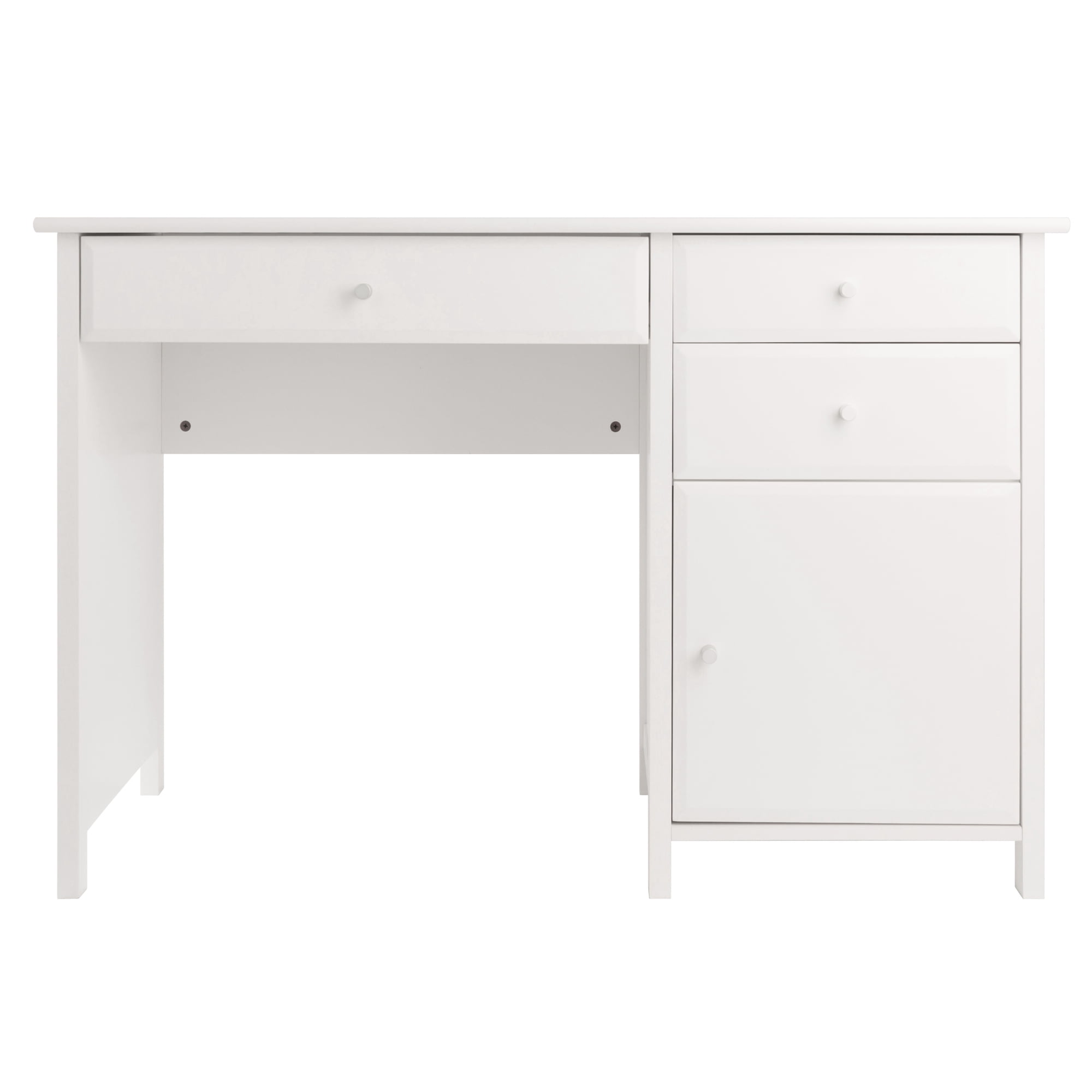 The Winsome Delta Office Writing Desk offers a contemporary, polished look for your workspace. A perfect complement to any decor, use it in your in-home office, dorm room or den to catch up with paperwork. The desk features a cabinet and three soft-close drawers that glide on metal rails. Keep smaller office supplies like pens, pads, and staplers organized and handy in the two smaller side drawers. The larger drawer is perfect for storing a laptop, tablet or other smart gadgets. The larger cabinet door opens up providing ample spaces for office supplies and more. The polished, sleek white finish and silver accent knobs give this multifunctional desk a handsome, yet understated look. Create a relaxed setting by completing your office space with the additional items from the Winsome Delta collection (each sold separately). Constructed of sturdy of composite wood. Conveniently packed and shipped in 1 box, that includes the hardware necessary for assembling. Replacement part request can be submitted directly to the manufacturer within 60 days from date of purchase.