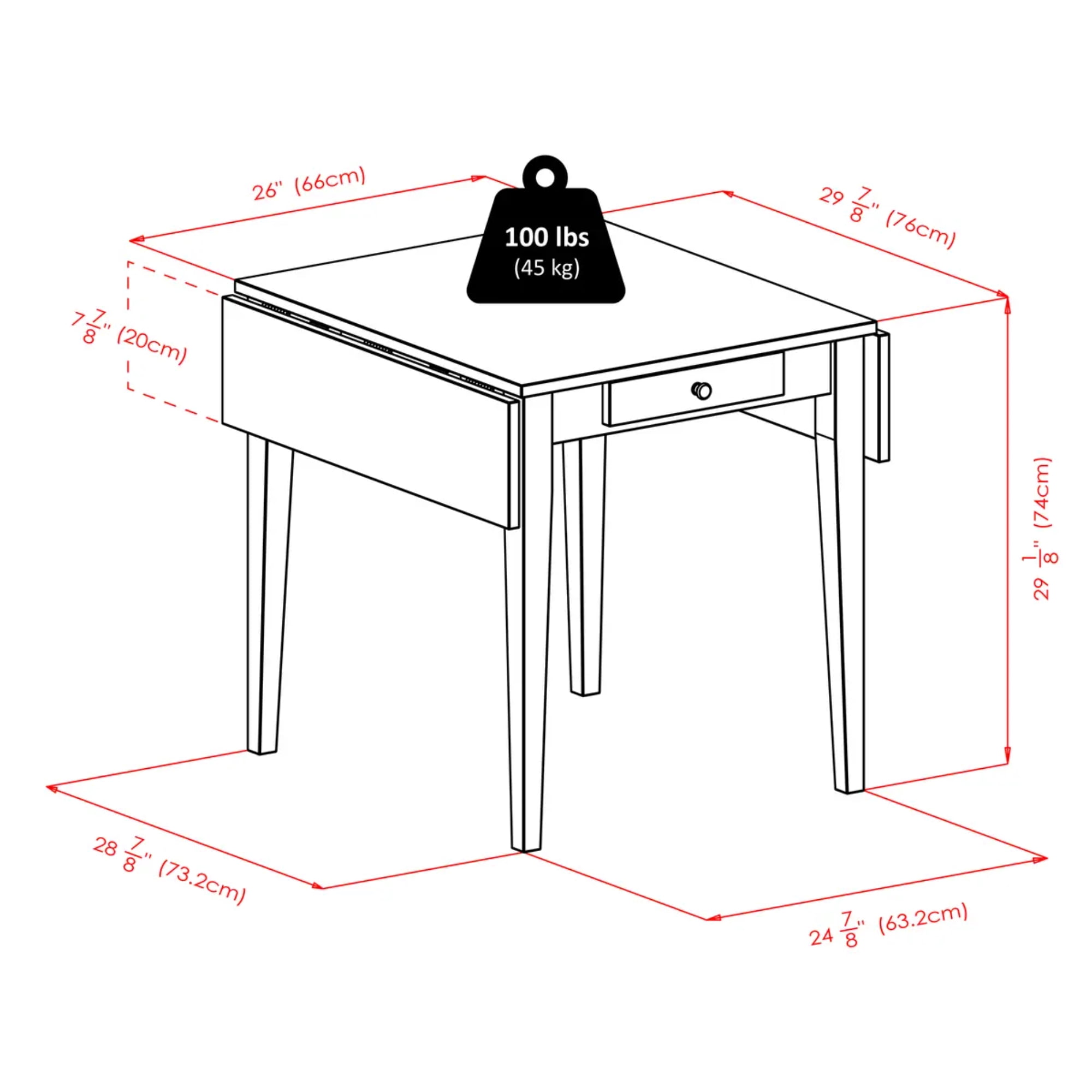The Winsome Wood Hamilton Drop Leaf Table is a simple design yet an indispensable addition to any home. Constructed of solid wood for long lasting durability and finished in a rich walnut that will go well with just about any décor. With a drop leaf on each end offering exceptional versatility and making this an excellent choice for a studio apartment or small spaces. Needing more surface space, easily raise both leaves up, for a table suitable for entertaining or seating four comfortably, at 41.73in W x 30.55in D. When guests are gone, bring down both leaves and you’ll have a compact 27.8in W table, helping you conserve valuable floor space. A drawer for having small necessities handy is centered and accented with a satin nickel drawer pull, and made up of both composite and solid wood. This Hamilton table will combine great with several of the Winsome dining chairs (each sold separately). Conveniently packed and shipped in 1 box, that includes the hardware necessary for assembling. Replacement part request can be submitted directly to the manufacturer within 60 days from date of purchase.