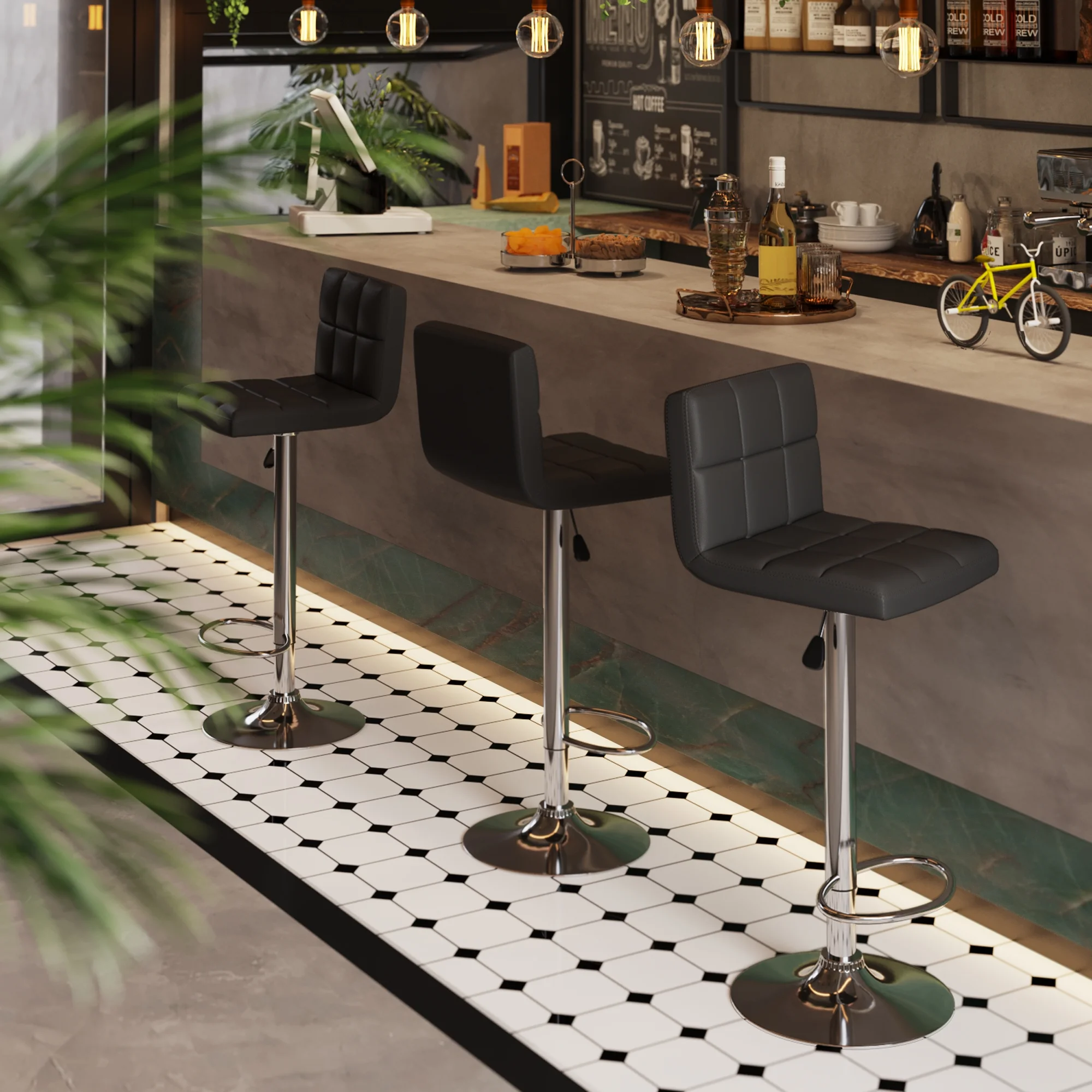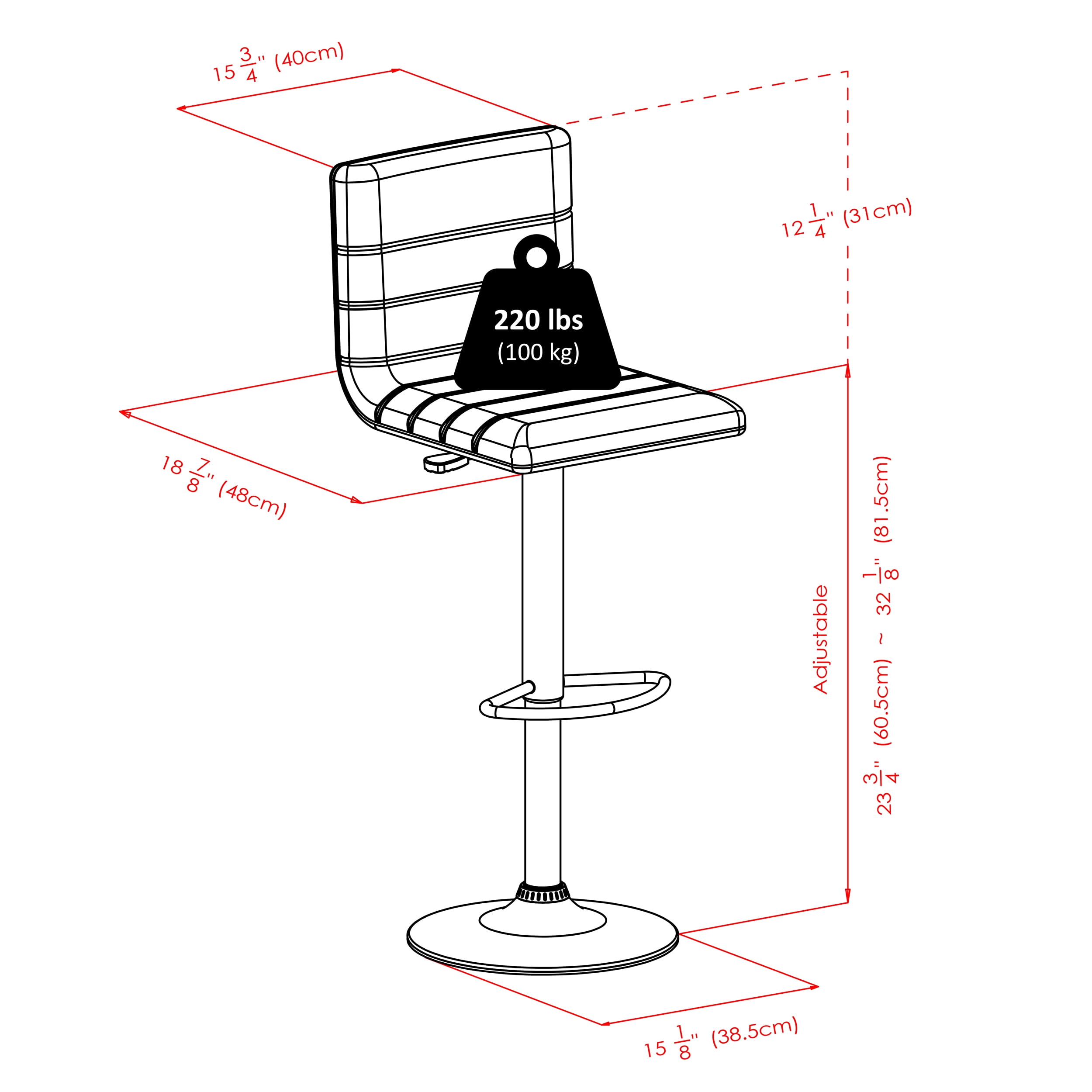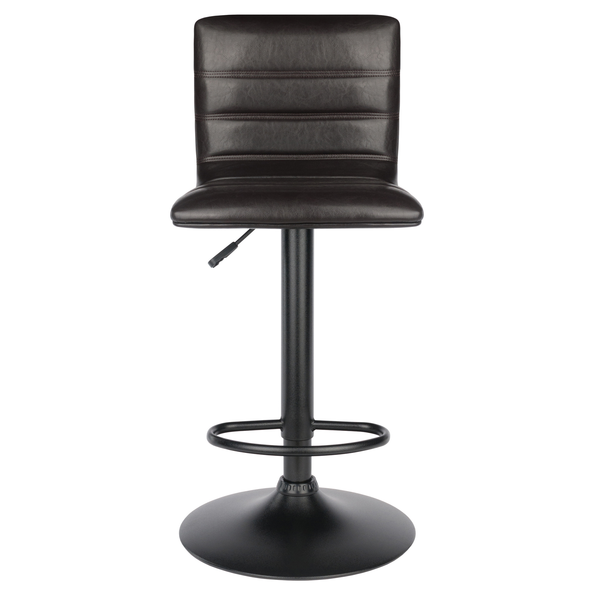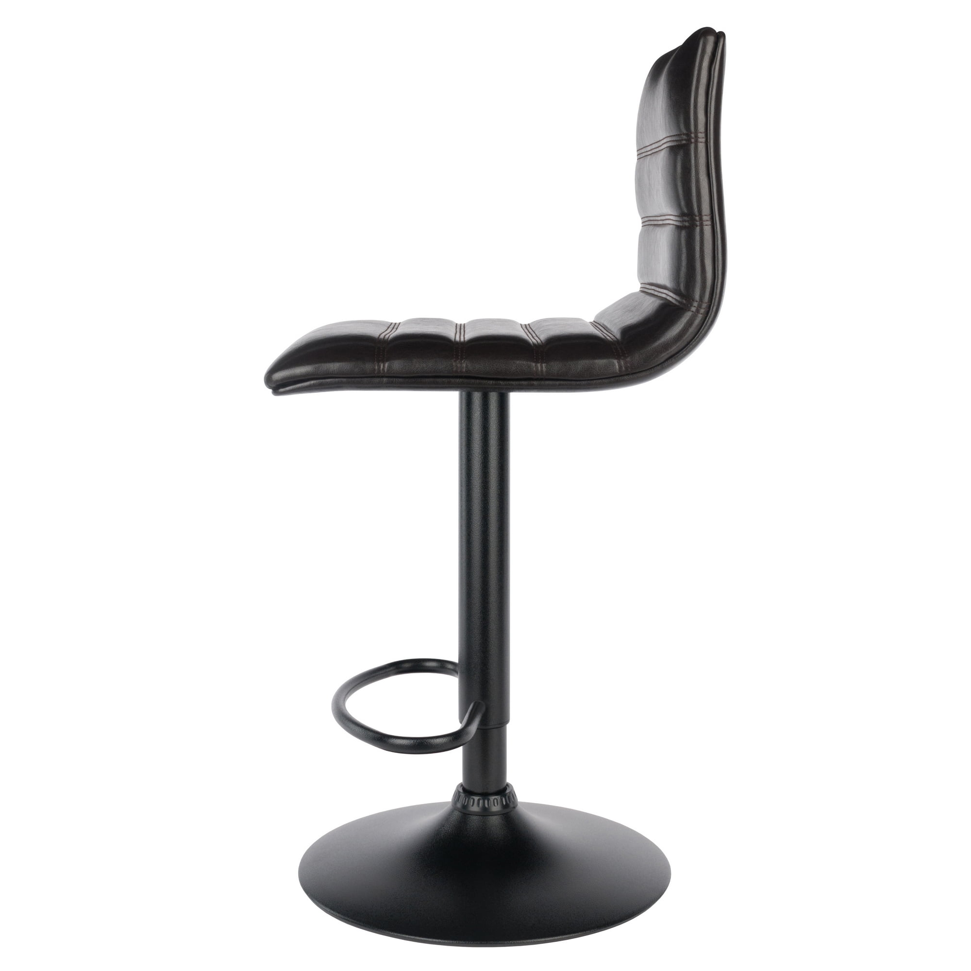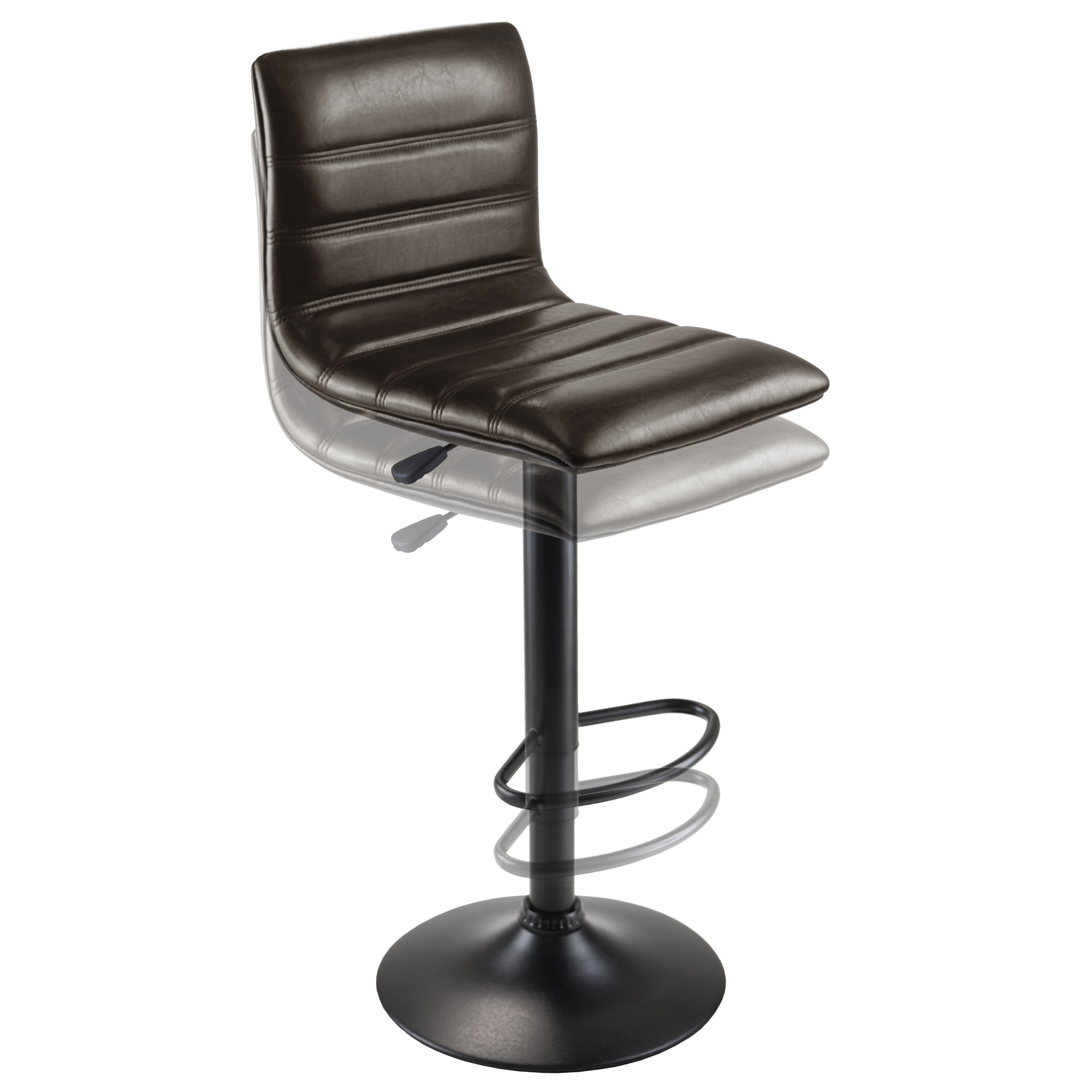 Single air lift adjustable stool with high back Triple stitching L-back design seat Holly collection Upholstered espresso polyurethane seat Black metal base and post Contemporary style Overall dimensions: 15.75″W x 19.34″D x 43.94″H 360-Degree swivel seat and foot rest Seat dimensions: 15.75″W x 18.90″D Seat height: 23.82”-32.09″ Backrest: 11.85″H Overall height: 35.70”-43.94” Base diameter: 15.16″ Static weight capacity: 220lbs Net weight: 18.55lbs Ships in 1 box Box dimensions: 19.25”L x 15.15”W x 17.60”H Shipping weight: 21.55lbs Indoor use Assembly required Model #93443