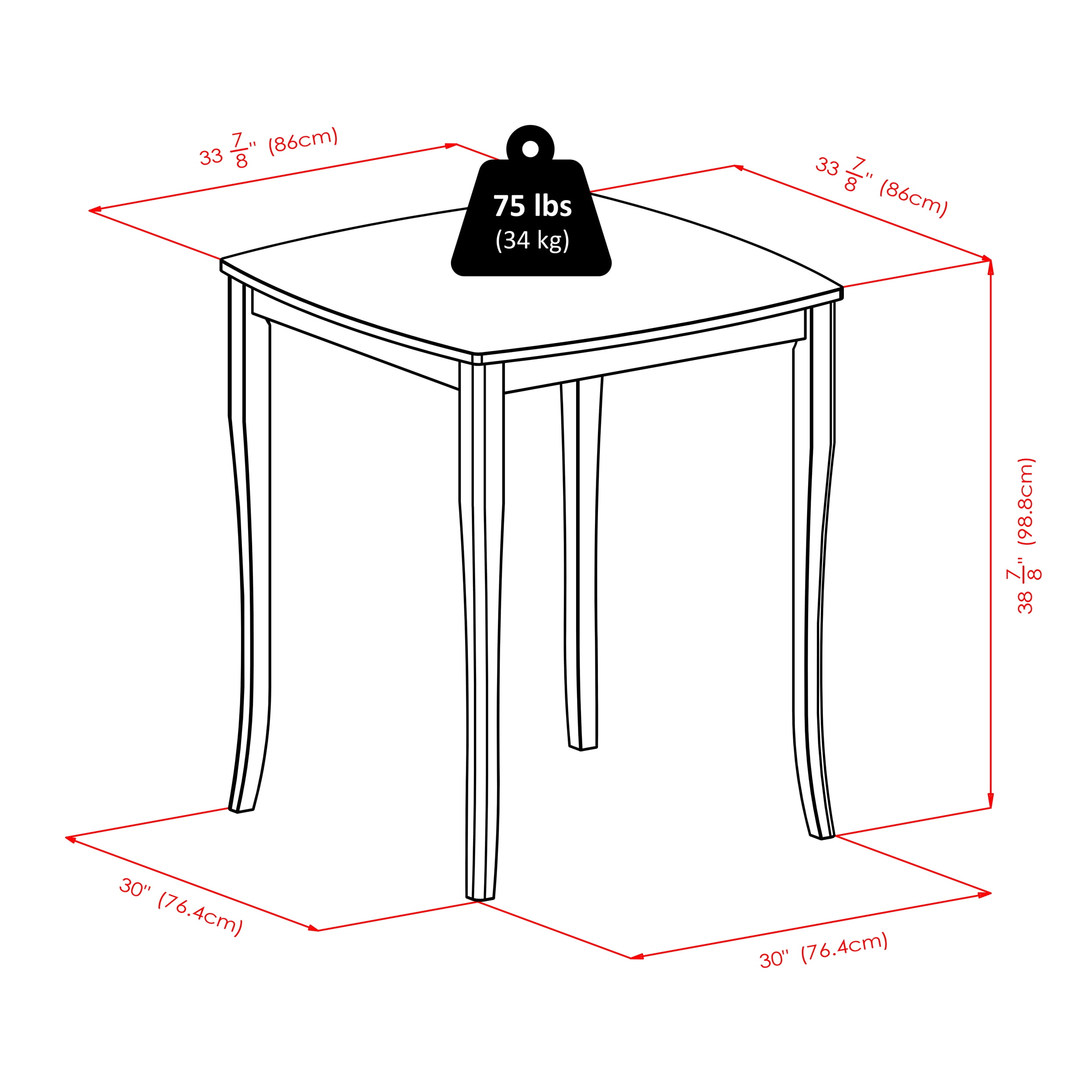 Winsome Wood Inglewood 3-Pc Dining Set, High Table & 2 Cushioned Saddle Seat Bar Stools, Walnut: • Transitional style • Inglewood collection • Walnut Finish • Tall square tabletop table with contoured, cabriole legs; two cushion seat bar stools • Ships in 3 boxes • Box 1, item #94733 • Table dimensions: 33.86″W x 33.86″D x 38.9″H • Clearance underneath table top: 35.43″ (measured from apron) • Distance between legs: 25.67” – 27.32” • Constructed of sturdy solid wood • Item weight: 39.05 lbs • Box dimensions: 40″W x 40″L x 4.6″H • Shipping weight: 47 lbs • Box 2 & 3, item #94069 • Bar height stool dimensions: 17.93″W x 15.83″D x 29.69″H • Seat height: 29.69″ • Black faux leather padded seat cover • Seat cover is not removable • Saddle seat dimensions: 17.48″W x 10.08″D • Square legs in antique walnut finish constructed of solid wood • Foot print: 17.93″W x 15.83″D • Built in foot rest • Item weight: 9.9 lbs • Static weight limit: 220 lbs • Box dimensions: 12.2″W x 28.75″L x 3.8″H • Shipping weight: 11 lbs • Assembly required • Model kit #94360