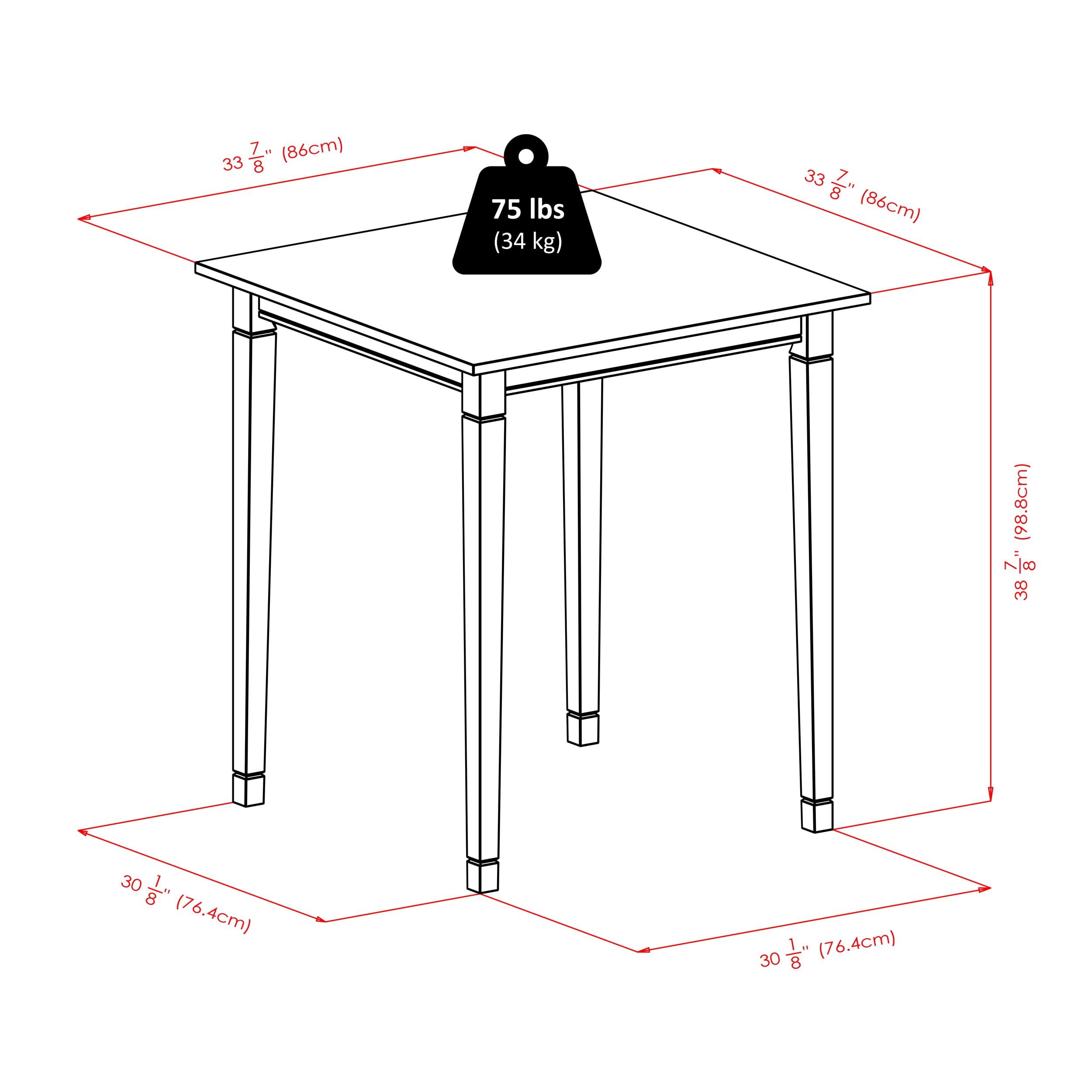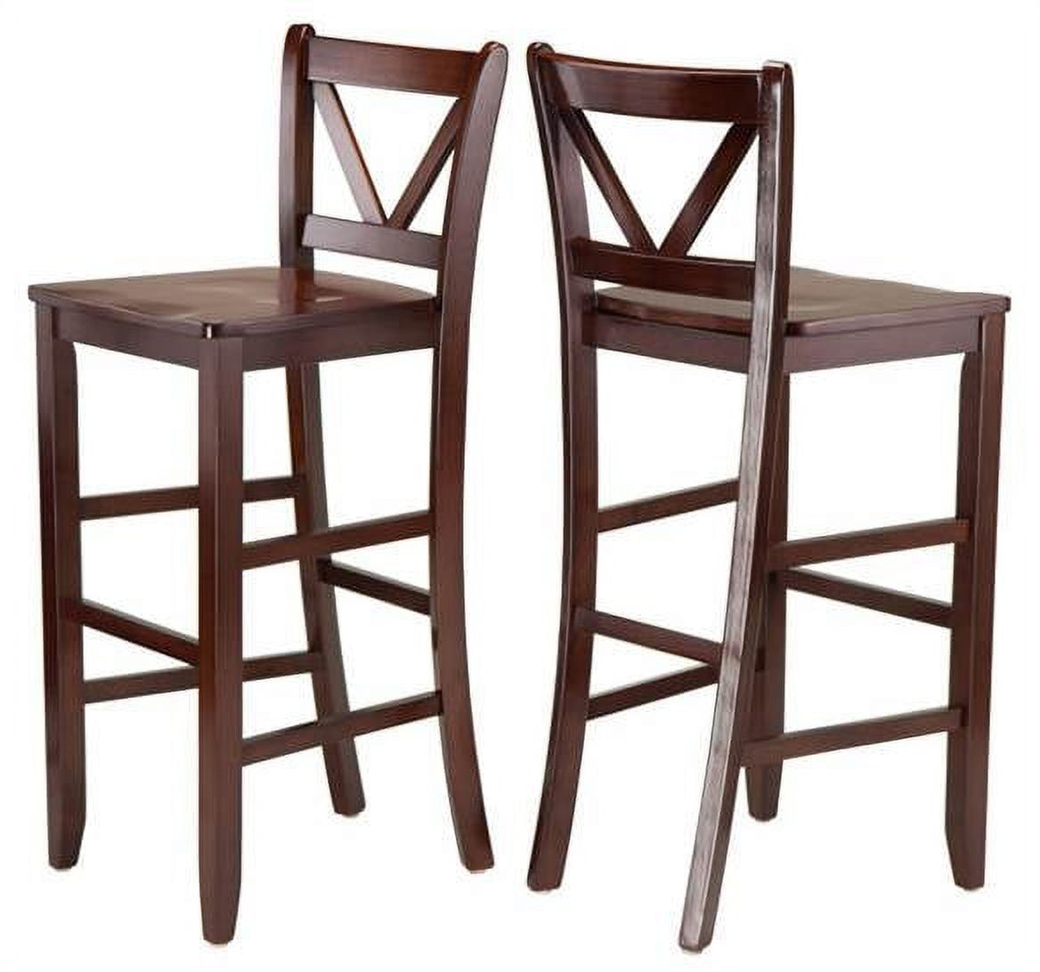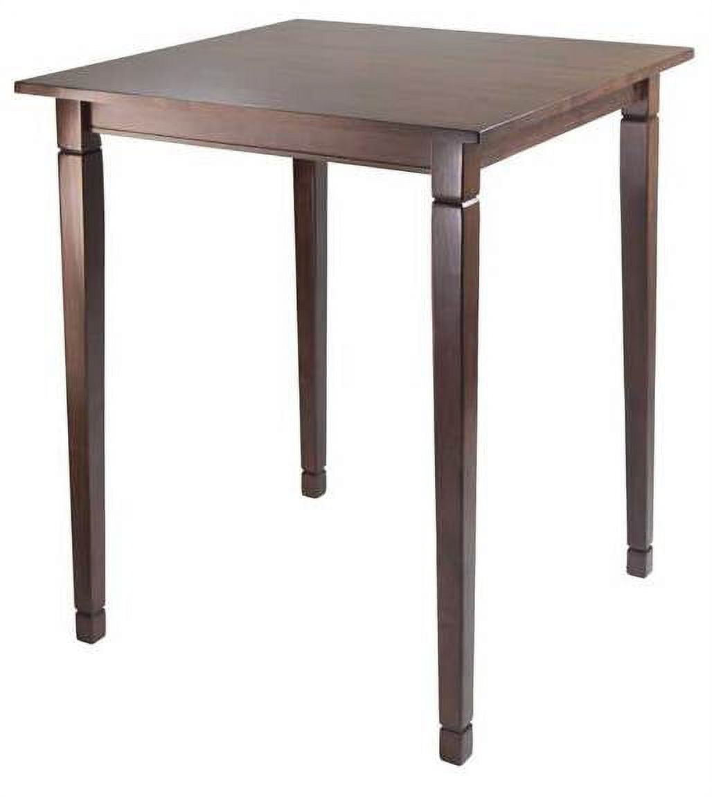 Designed to accommodate your busy lifestyle, the Winsome Trading Kingsgate 3 Piece Dining Table Set with Bar V-Back Chairs offers space to have a casual meal, help with homework, or just chat. This set includes a counter height table and two handsome stools. Both the table and stools are made from solid and composite wood and come in an antique walnut finish that blends well with contemporary or classic homes. The table stands on gently flared, tapered legs. The stools have a decorative V back design, contoured seats, and stretcher bars that double as footrests. Assembly required. Product Dimensions: Table: 33.86W x 33.86D x 38.90H in. Stools (2): 16.93W x 19.21D x 42.17H in. Seat: 16.54W x 15.55D x 30H in. Back rest panel: 16.93W x 12.17 H in.